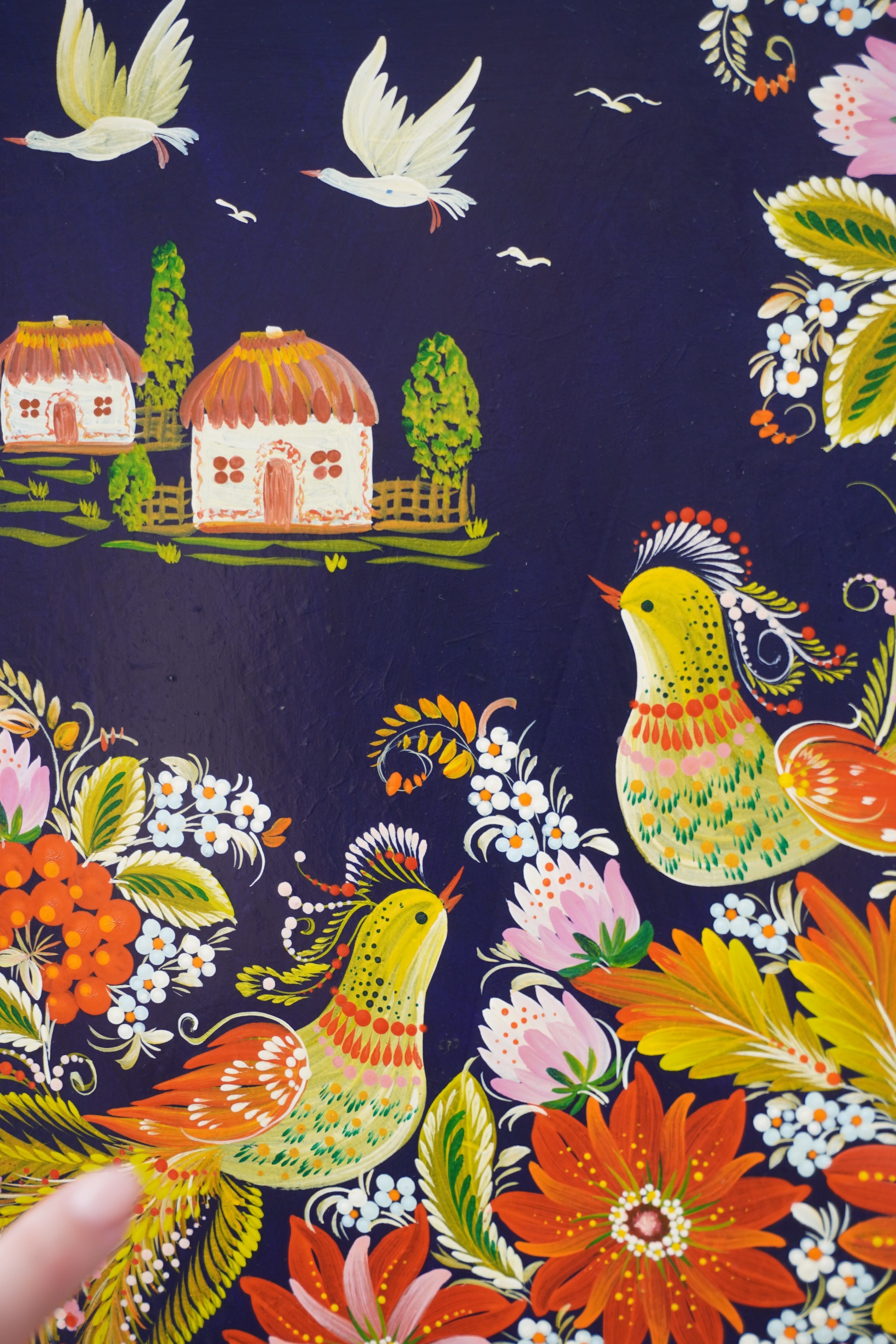 日本では見られないはりねずみ、野ウサギ、コウノトリ、はくちょうなど。日本のようにウクライナは山は少ないけど、植物は豊かなウクライナ、そんなウクライナを象徴するように、自然のお花や動物などがペトリキウカ塗りの伝統工芸品に描かれています。