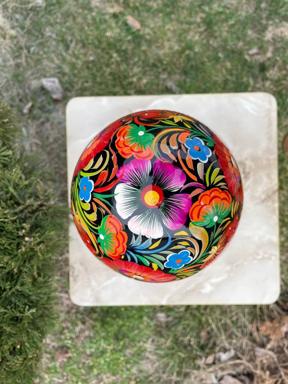 このプィサンカは、ウクライナの伝統芸術の中でも特に独特な美しさと魅力を持っています。ペトリキフカ村の職人たちの手によって、一つ一つ丁寧に描かれたハンドペイントは、その繊細なデザインと鮮やかな色彩で知られています。