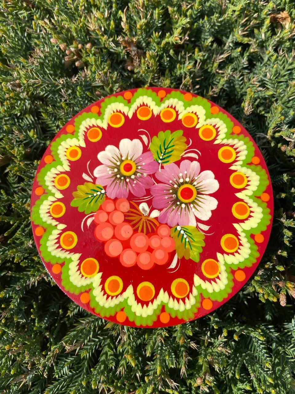 このマグネットは、ウクライナの伝統的なペイント技法「ペトリキフカ塗り」を使用して作られています。ペトリキフカ塗りは、色とりどりの花や模様で知られ、長い歴史を持つウクライナの美術技法の一つです。