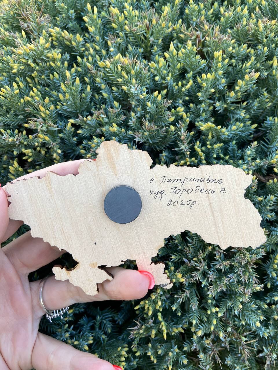 このマグネットは、ウクライナの伝統的なペイント技法「ペトリキフカ塗り」を使用して作られています。ペトリキフカ塗りは、色とりどりの花や模様で知られ、長い歴史を持つウクライナの美術技法の一つです。