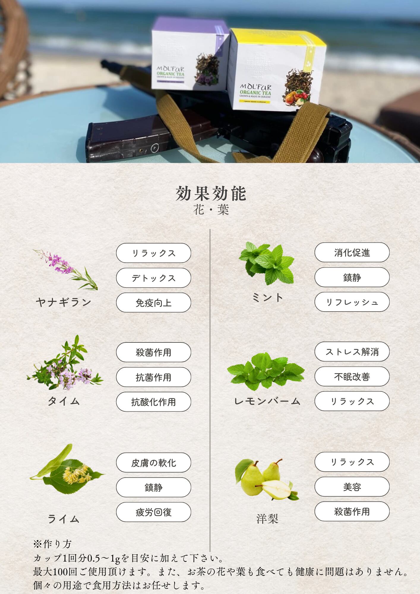 味わいと香り: 自然な香りと優しい味わい、さらにそのままのお花や葉の原形を楽しめるリラックスタイムにぴったりの上質なブレンド茶