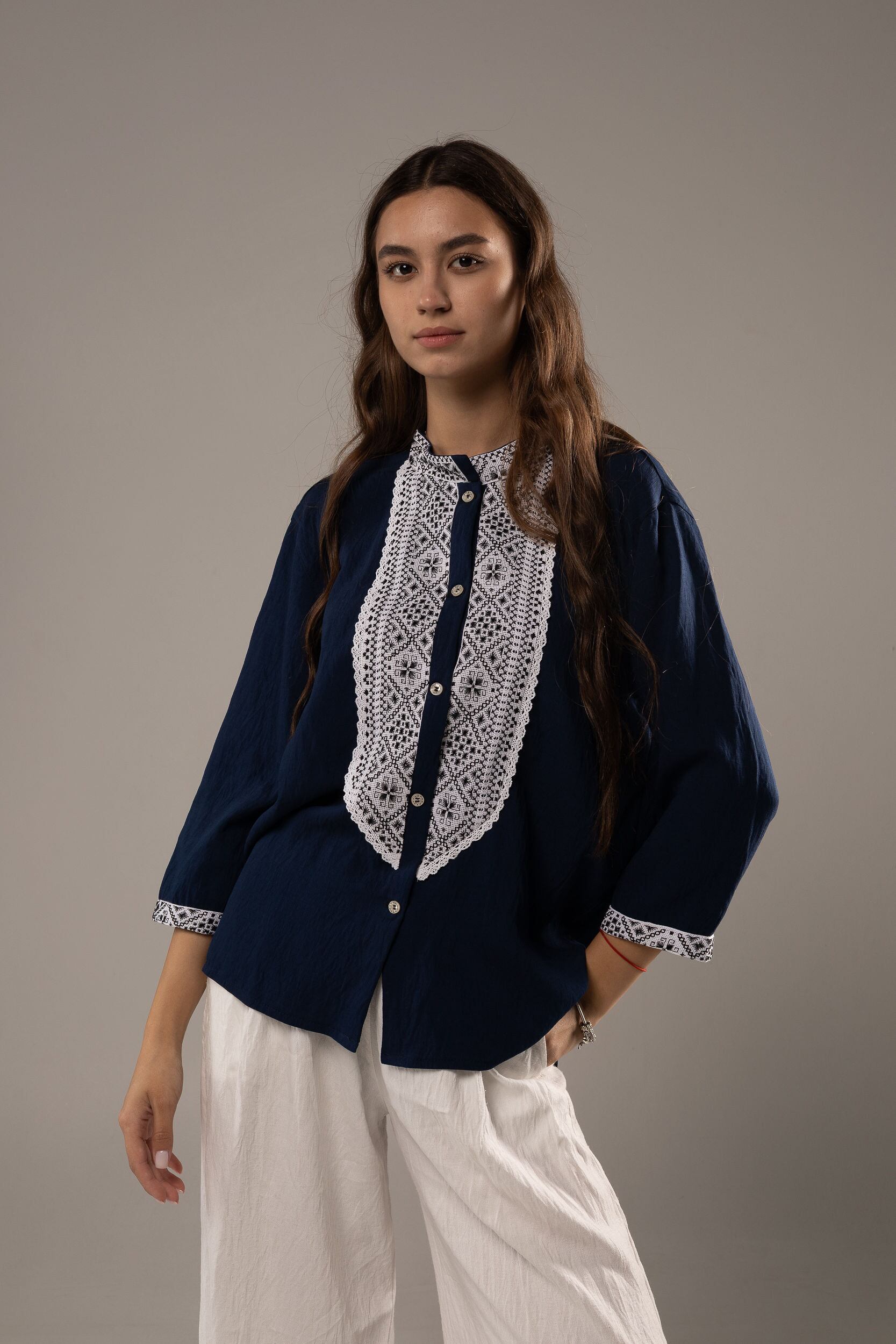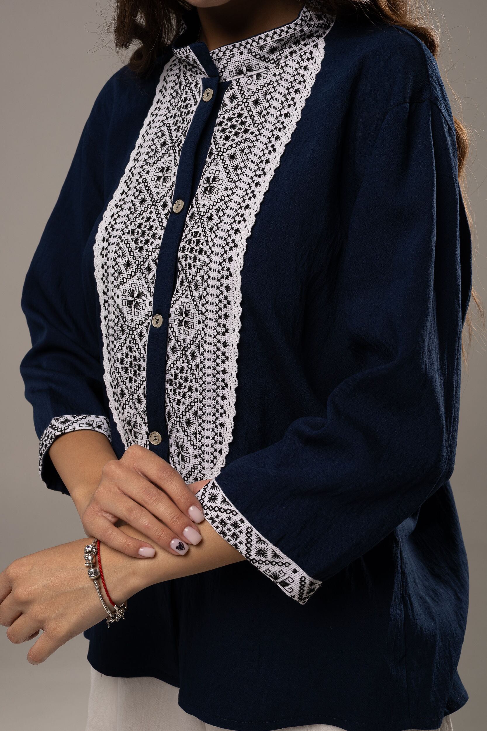 この作品は、ウクライナの伝統と美しさを象徴するヴィシヴァンカの刺繍を採用しています。過度な派手さを追求せず、日本の日常生活に自然に溶け込むデザインとなっております。しかし、それでいて洗練された高級感とカジュアルな雰囲気を両立させ、見る人を魅了する一着となっています。