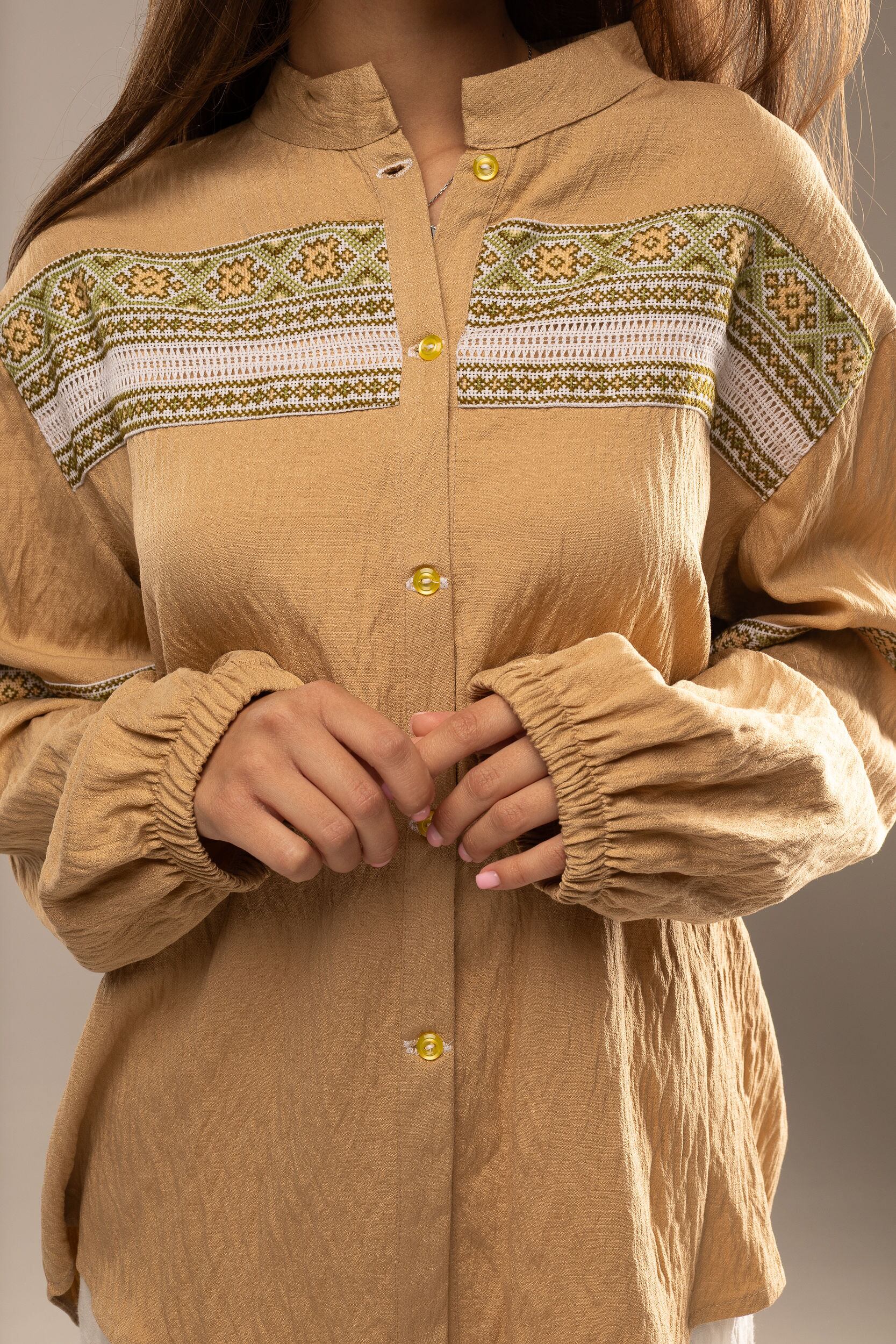 この作品は、ウクライナの伝統と美しさを象徴するヴィシヴァンカの刺繍を採用しています。過度な派手さを追求せず、日本の日常生活に自然に溶け込むデザインとなっております。しかし、それでいて洗練された高級感とカジュアルな雰囲気を両立させ、見る人を魅了する一着となっています。