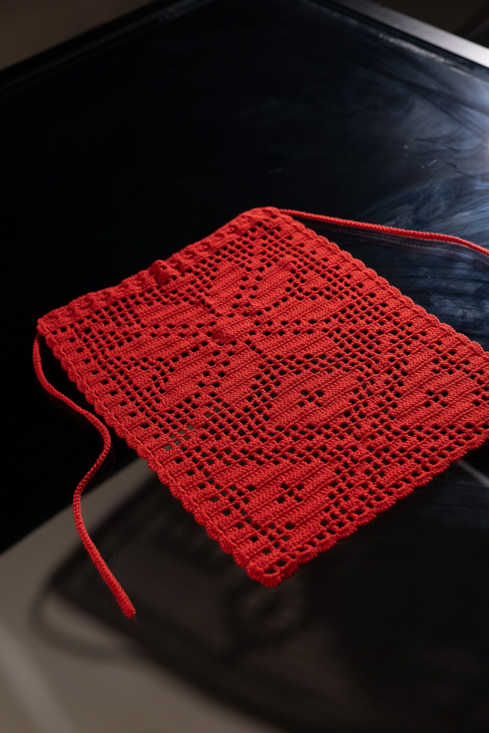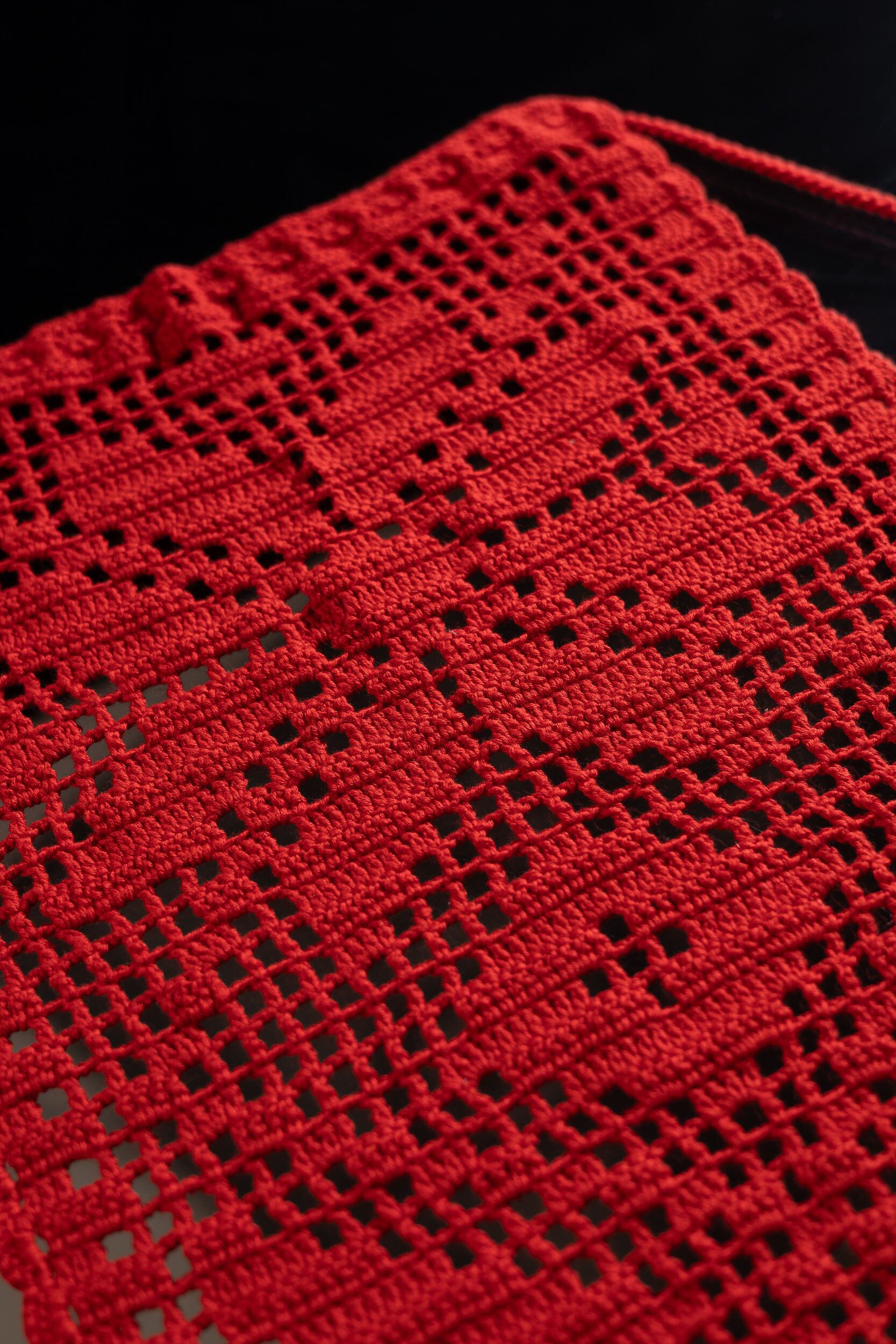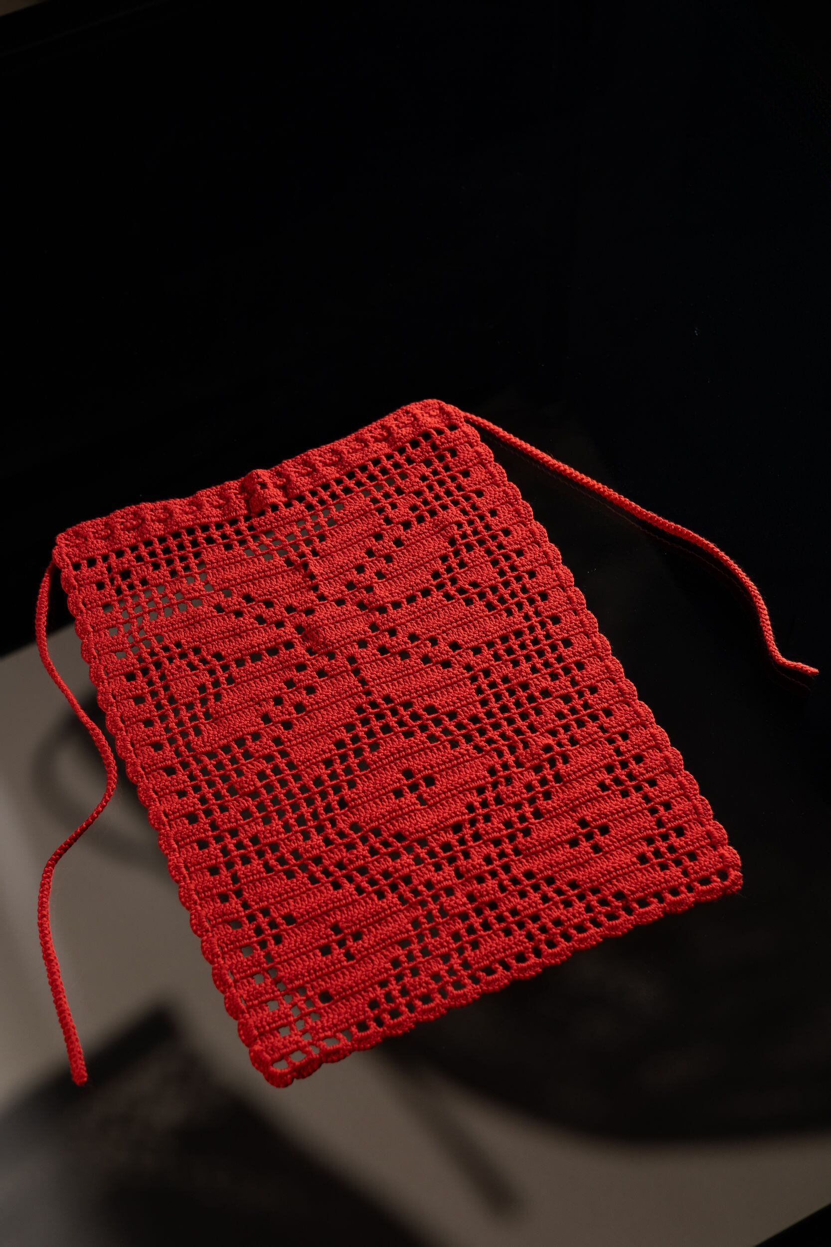装飾には「フィレ編み(Filet lace knitting)」と呼ばれる高度な手工技法を用い、刺繍のような幾何学模様を透かし編みで表現。精緻なマス目の連なりが生み出す陰影と立体感は、まるで絵画のように見る者を魅了します。