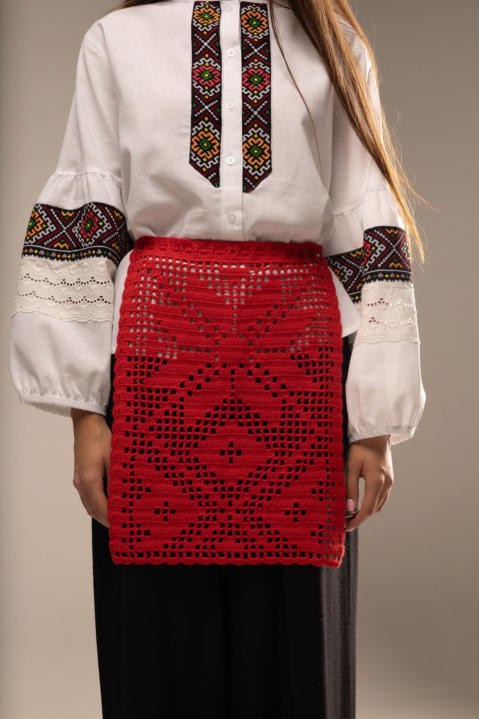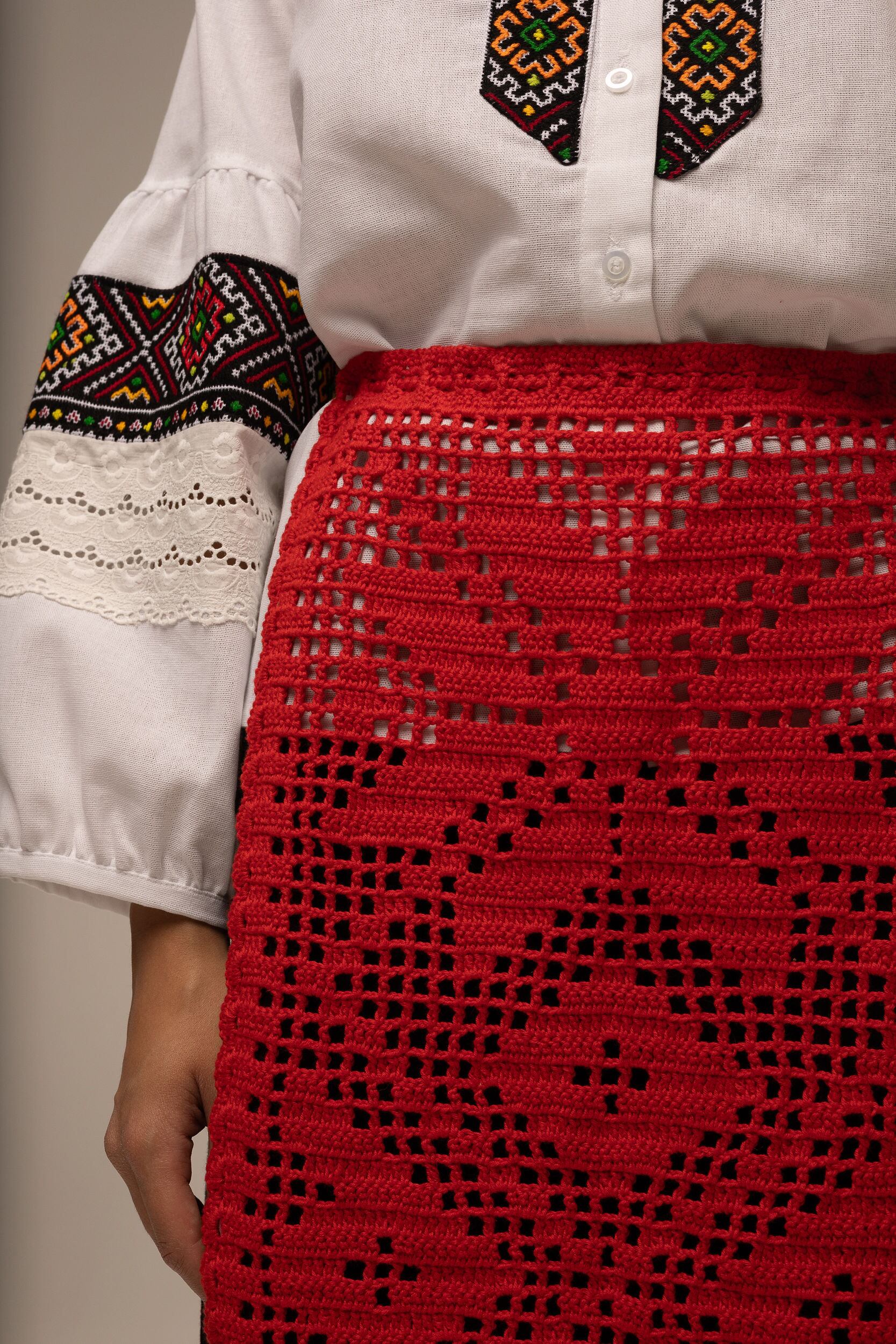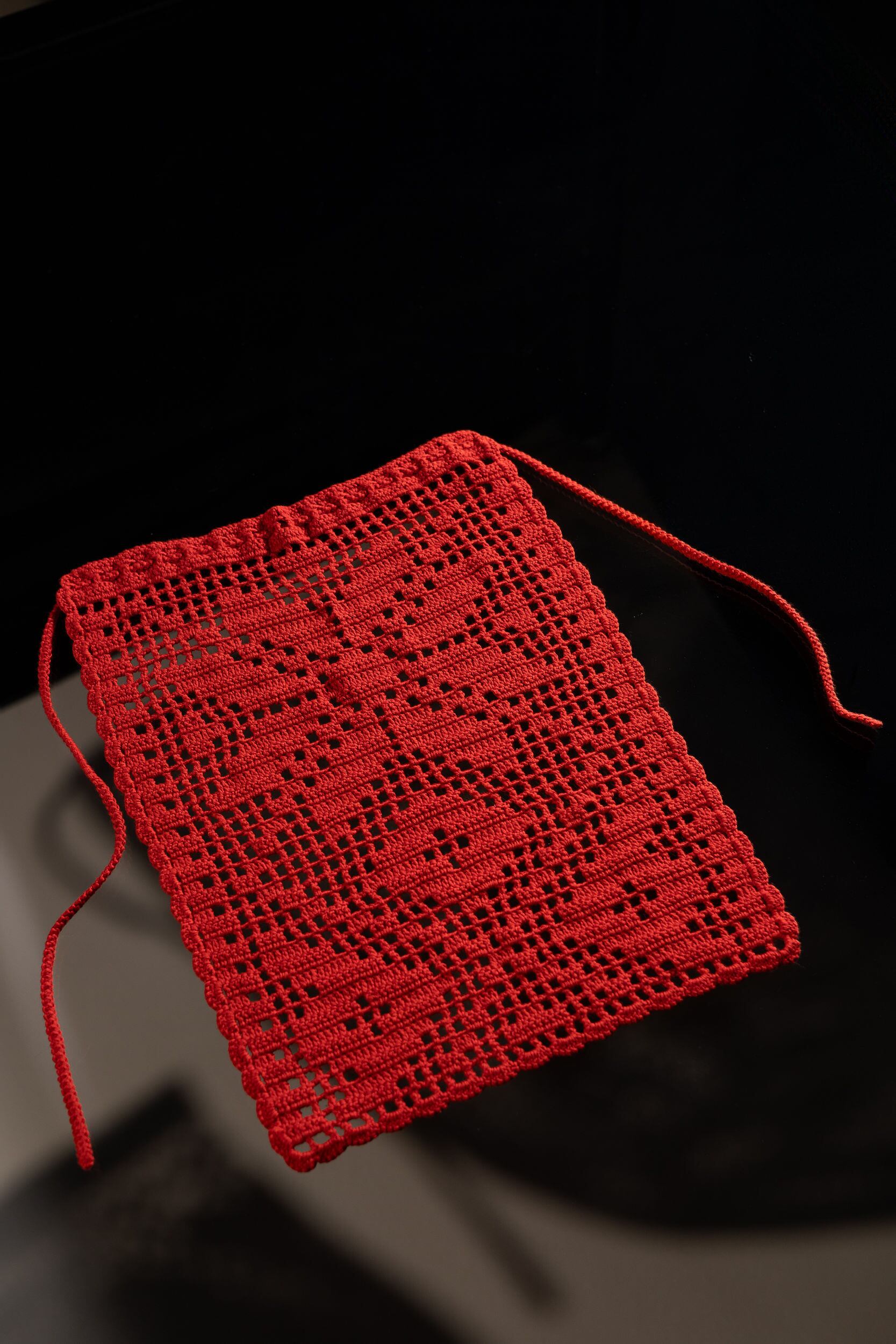 装飾には「フィレ編み(Filet lace knitting)」と呼ばれる高度な手工技法を用い、刺繍のような幾何学模様を透かし編みで表現。精緻なマス目の連なりが生み出す陰影と立体感は、まるで絵画のように見る者を魅了します。