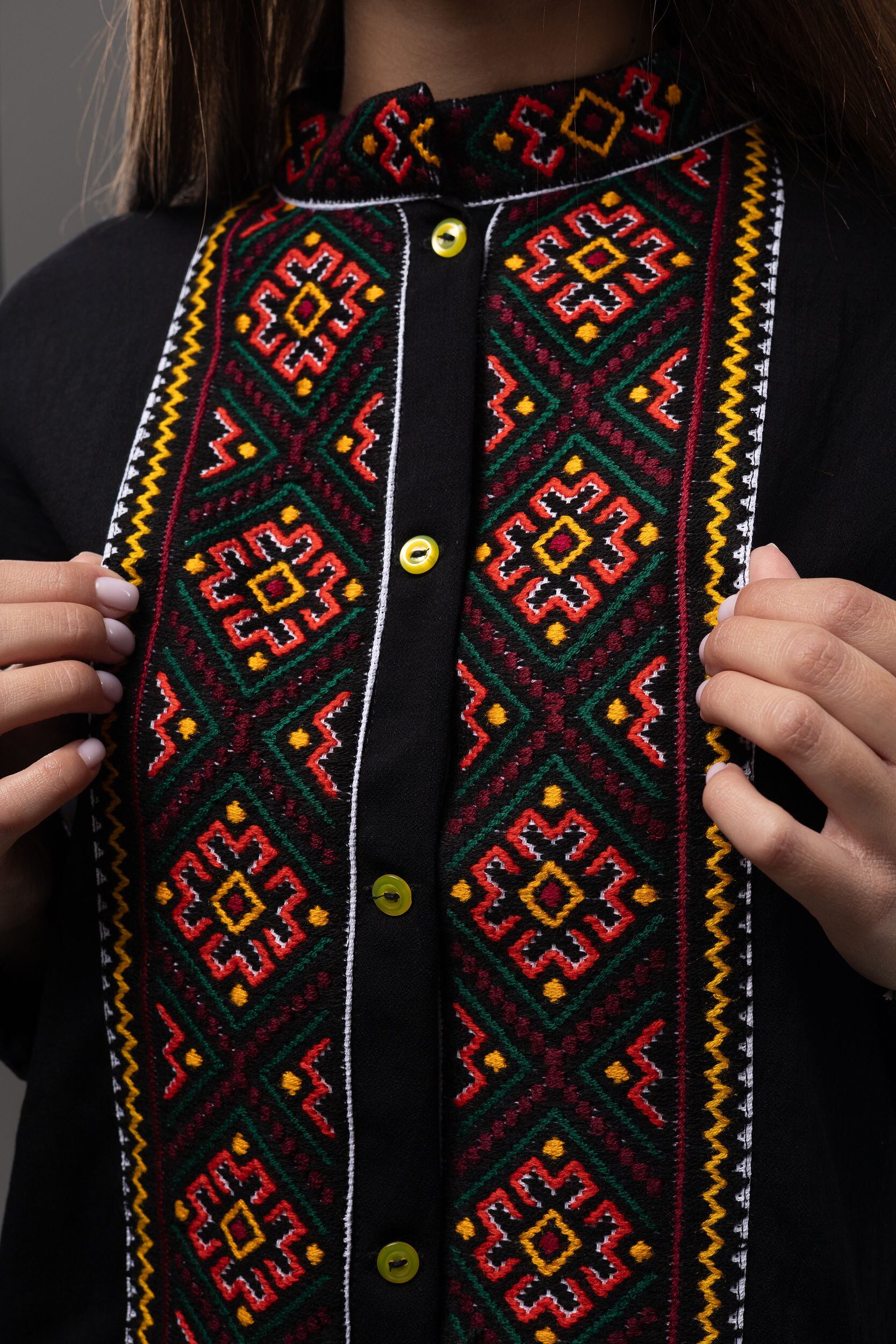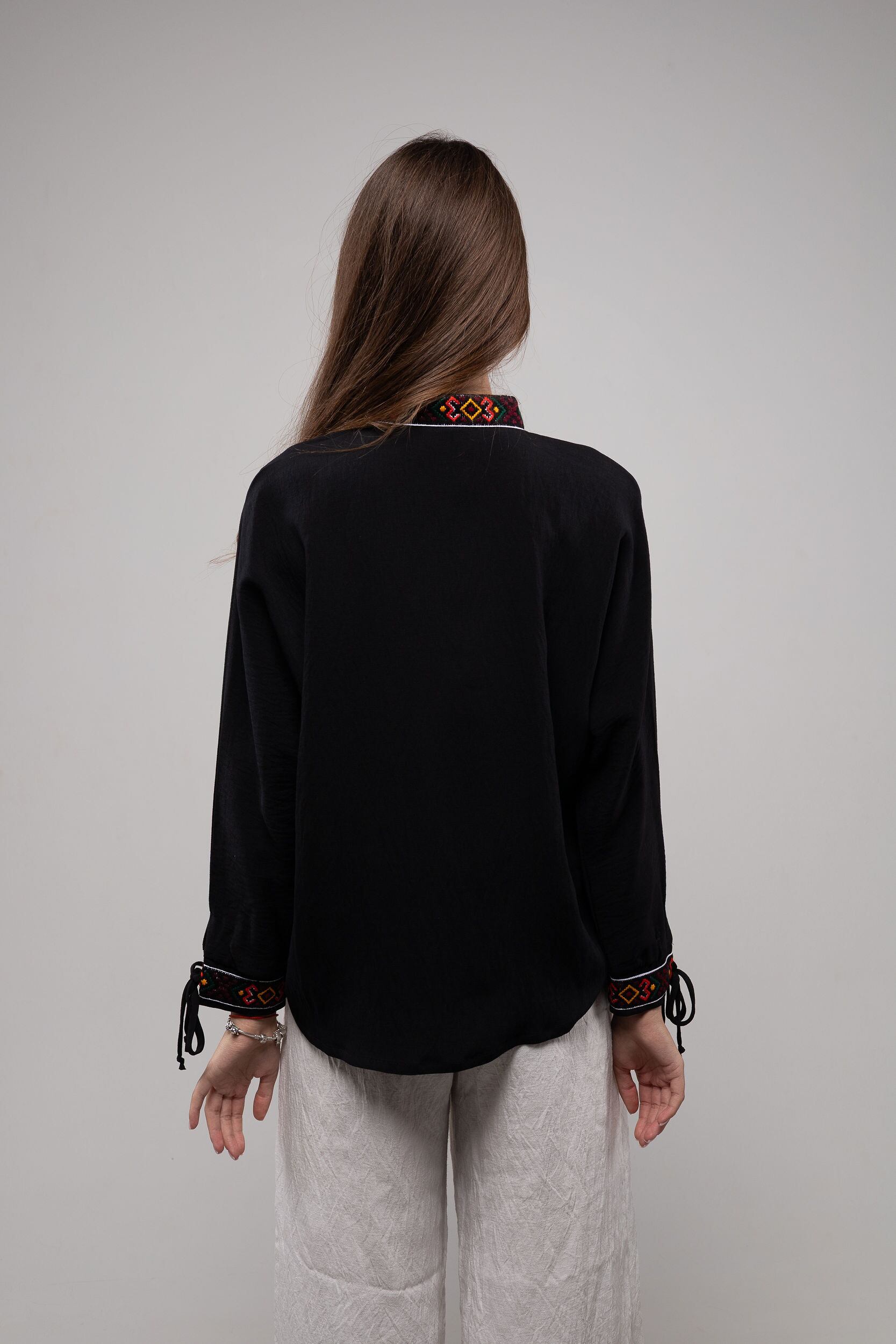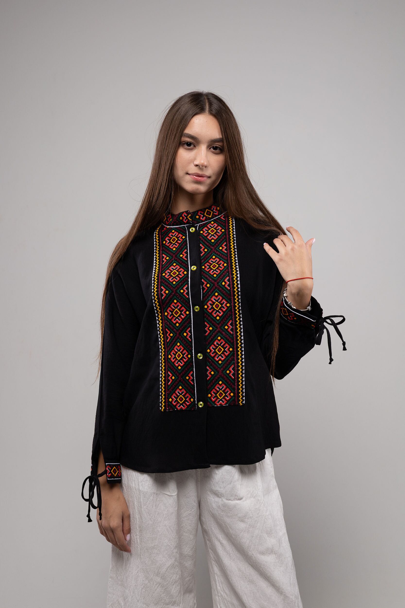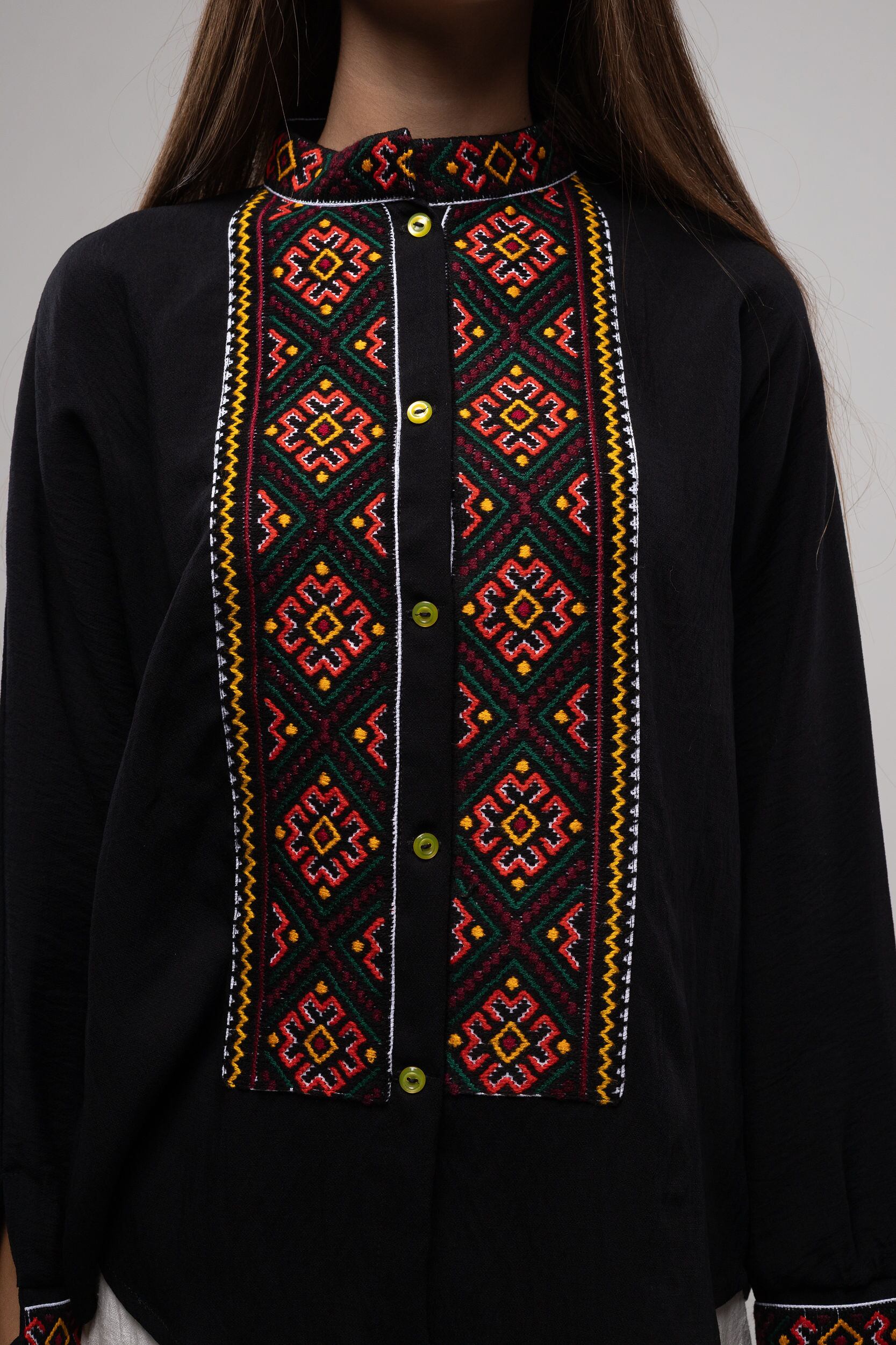 この作品は、ウクライナの伝統と美しさを象徴するヴィシヴァンカの刺繍を採用しています。過度な派手さを追求せず、日本の日常生活に自然に溶け込むデザインとなっております。しかし、それでいて洗練された高級感とカジュアルな雰囲気を両立させ、見る人を魅了する一着となっています。