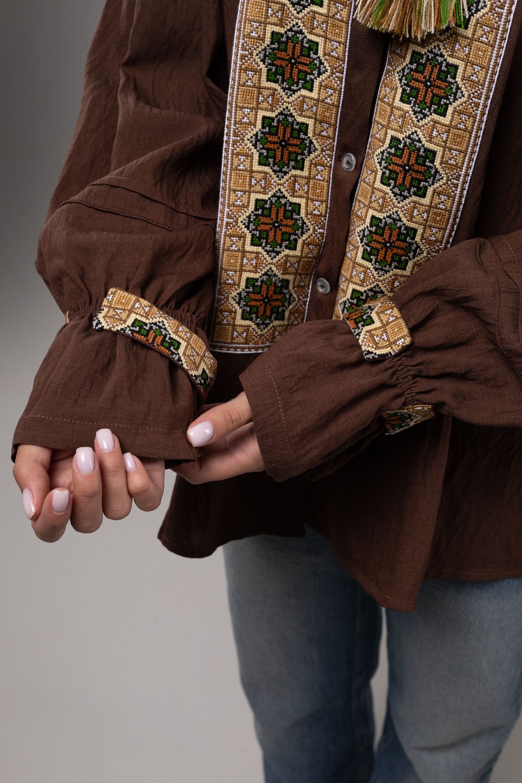 この作品は、ウクライナの伝統と美しさを象徴するヴィシヴァンカの刺繍を採用しています。過度な派手さを追求せず、日本の日常生活に自然に溶け込むデザインとなっております。しかし、それでいて洗練された高級感とカジュアルな雰囲気を両立させ、見る人を魅了する一着となっています。