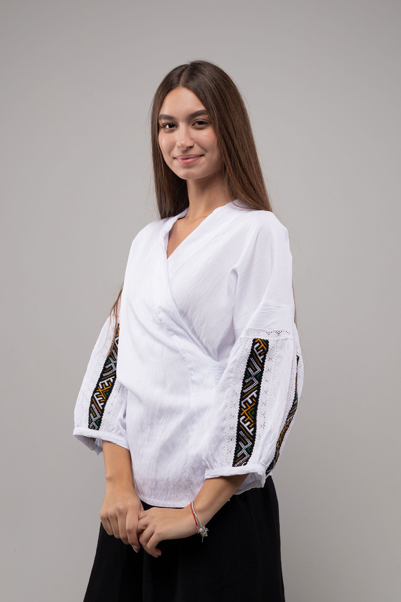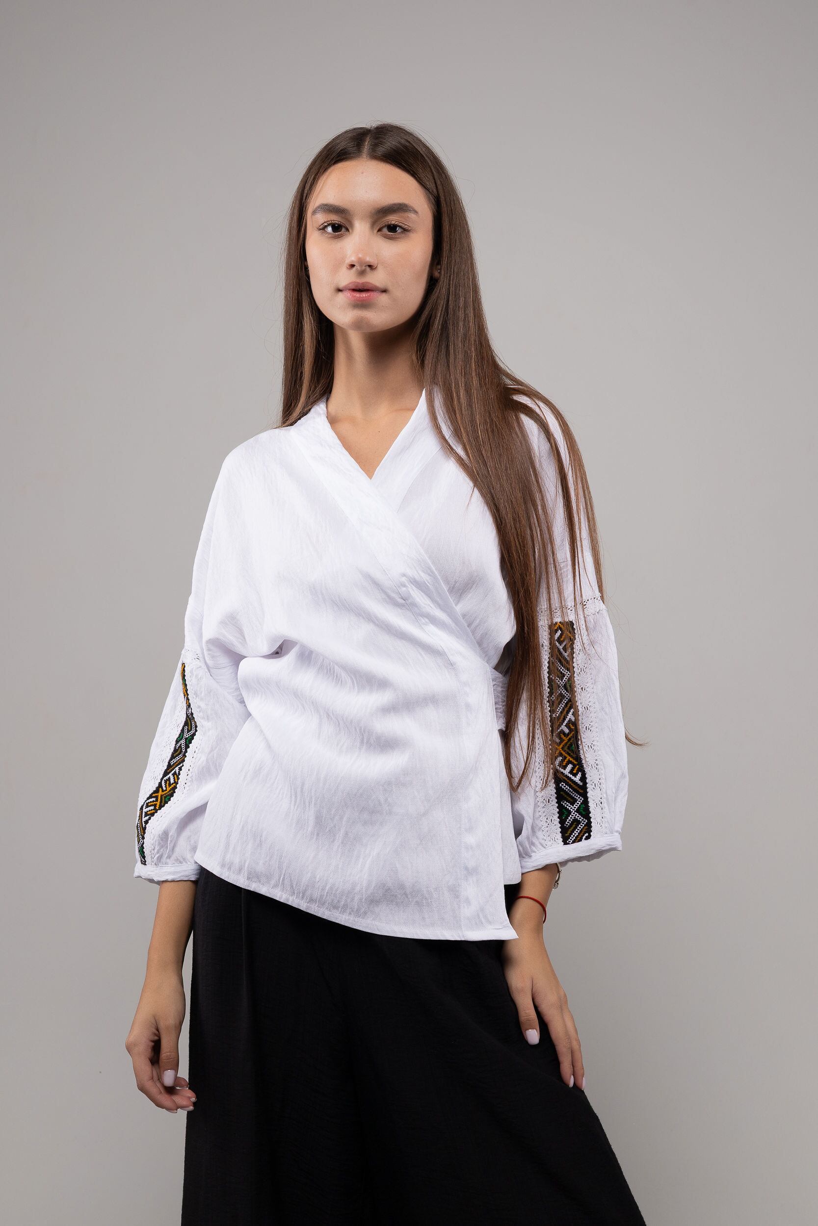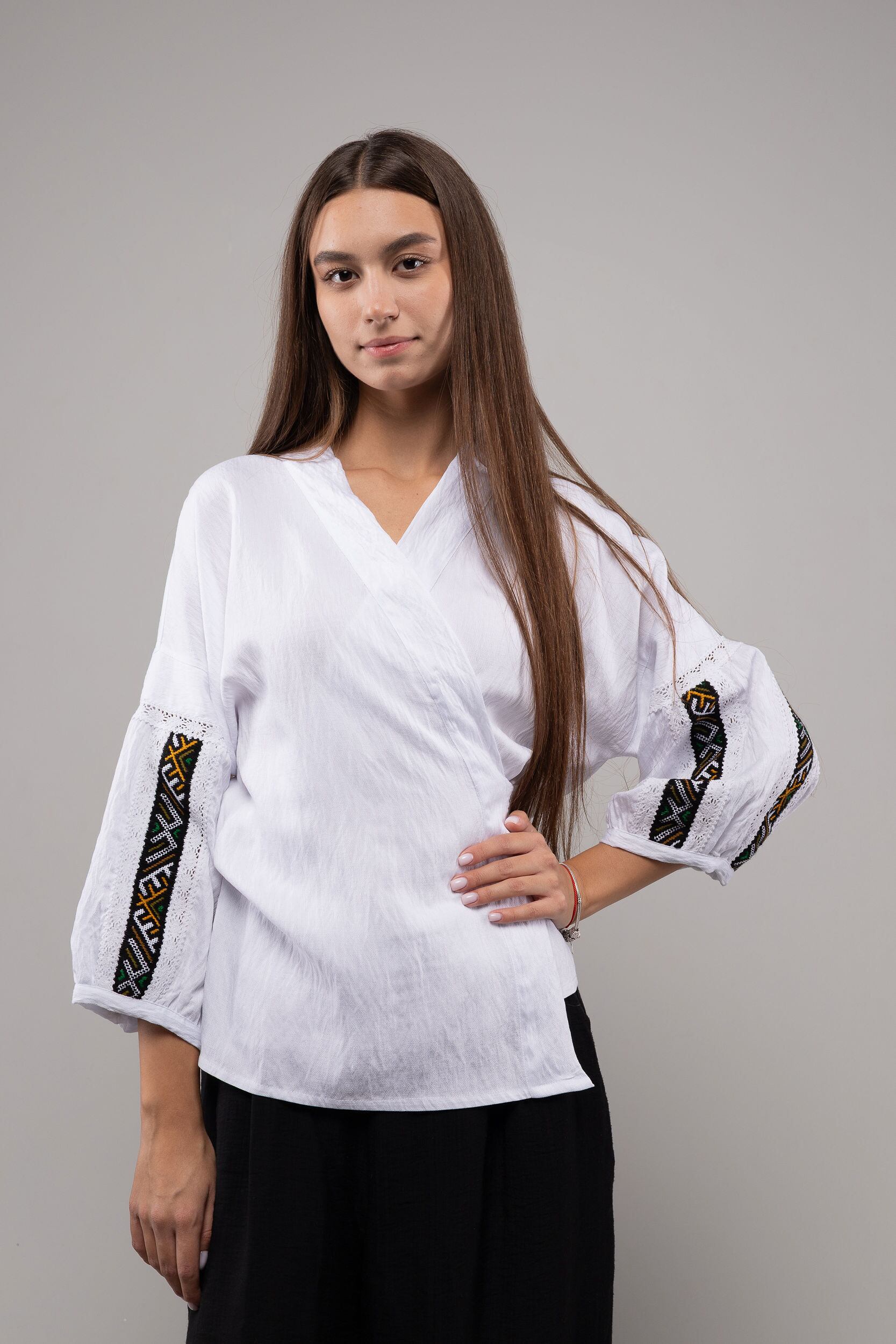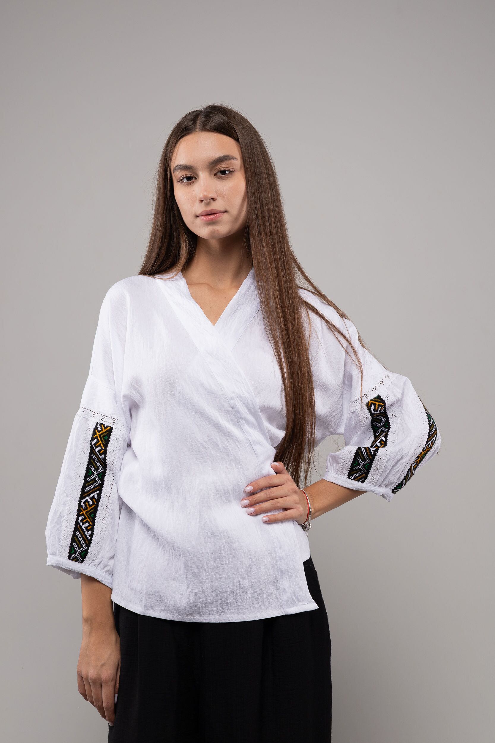 この作品は、ウクライナの伝統と美しさを象徴するヴィシヴァンカの刺繍を採用しています。過度な派手さを追求せず、日本の日常生活に自然に溶け込むデザインとなっております。しかし、それでいて洗練された高級感とカジュアルな雰囲気を両立させ、見る人を魅了する一着となっています。