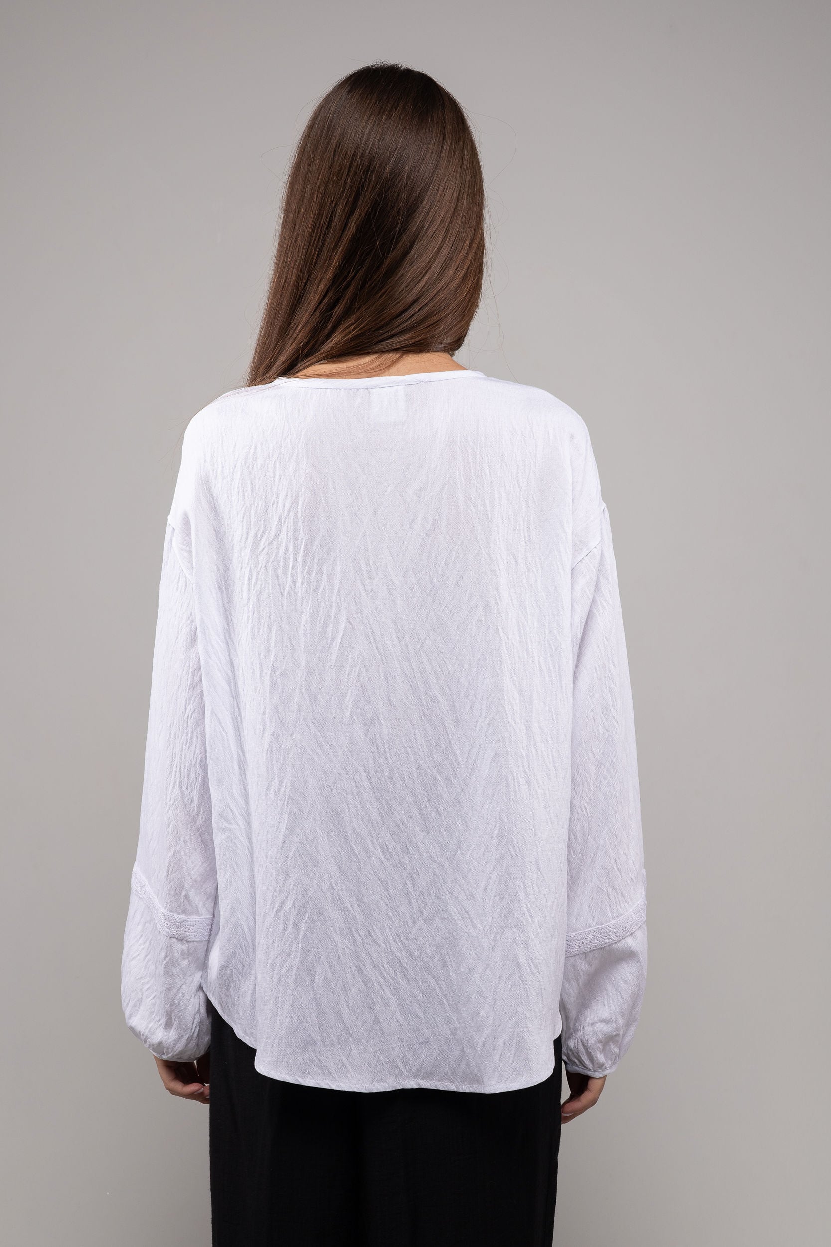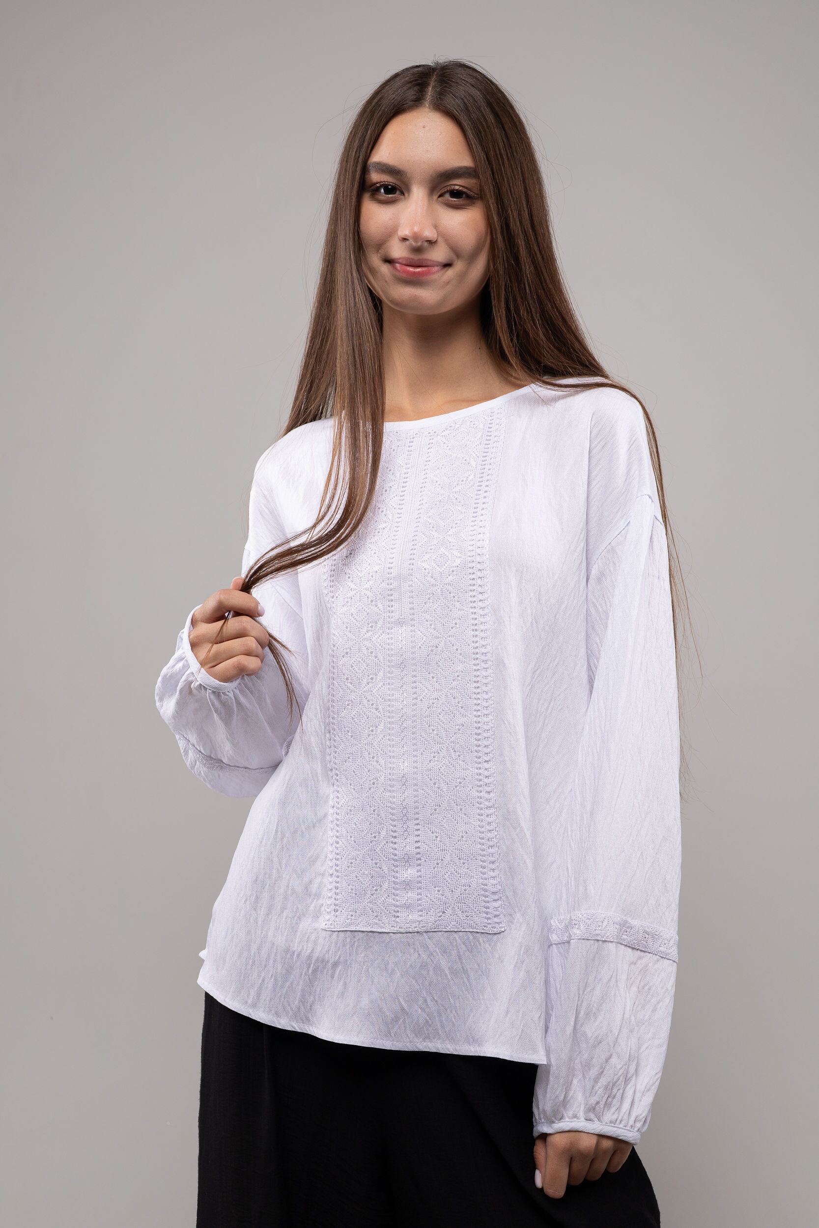 ウクライナ刺繍ヴィシヴァンカ グラージュ・ニジンカ(平行縫い) シルク手刺繍 ブラウス 麻 レディース・フリーサイズ