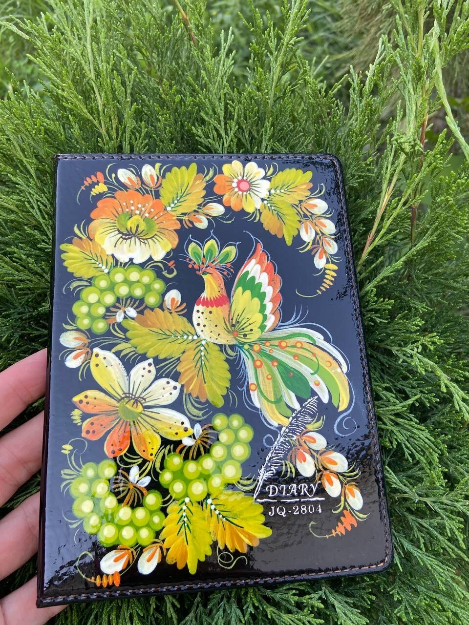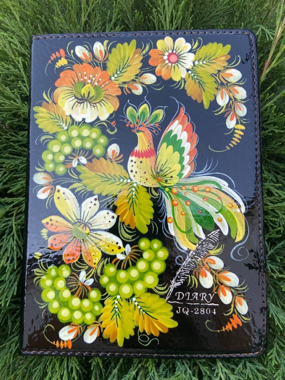 ノートの表面には、美しいペトリキフカ塗りの装飾が施されており、古い時代の風格と現代の美が融合しています。中身は、日付を記入することで日記やスケジュール帳として使える英語のページが含まれています。