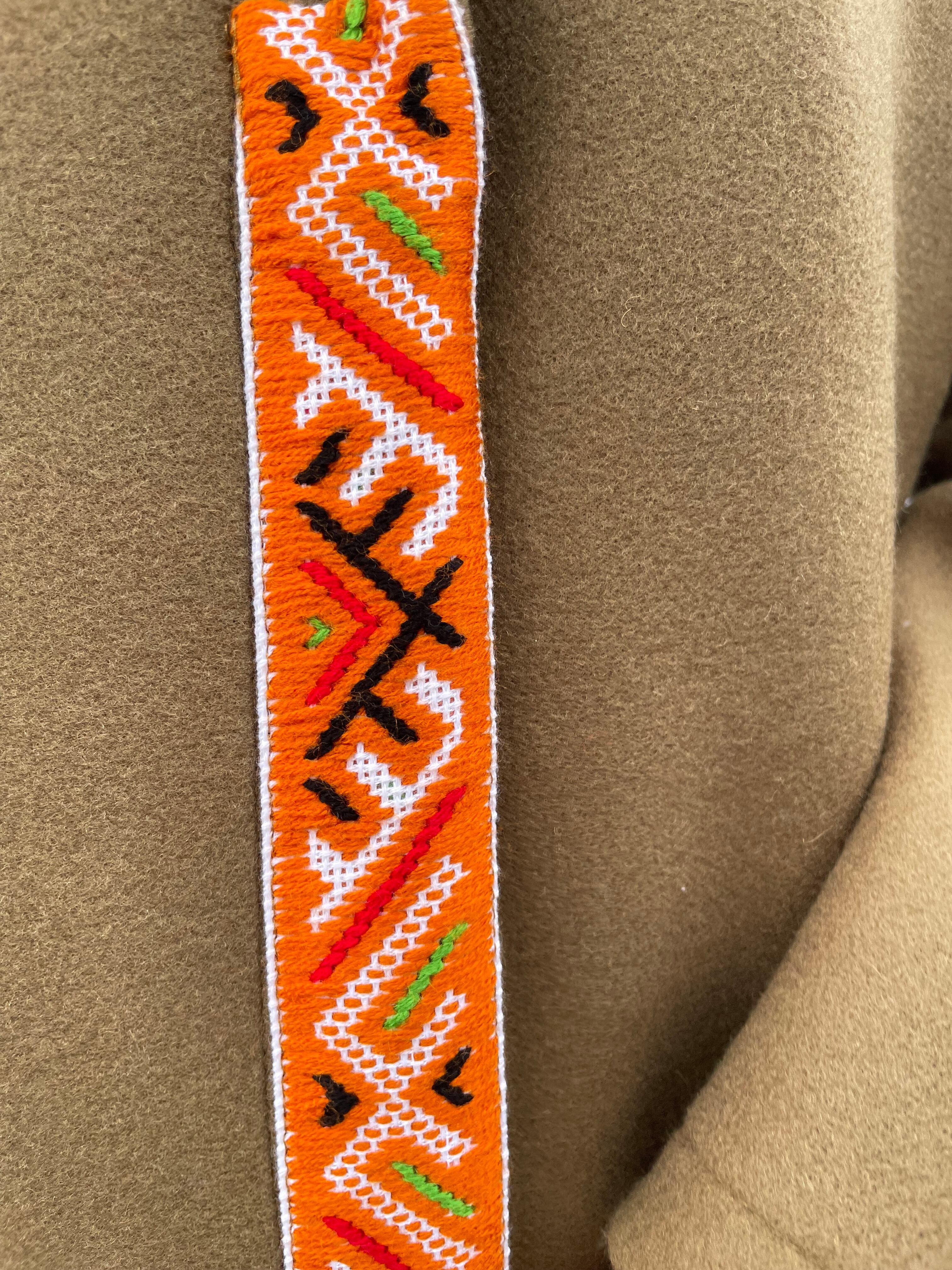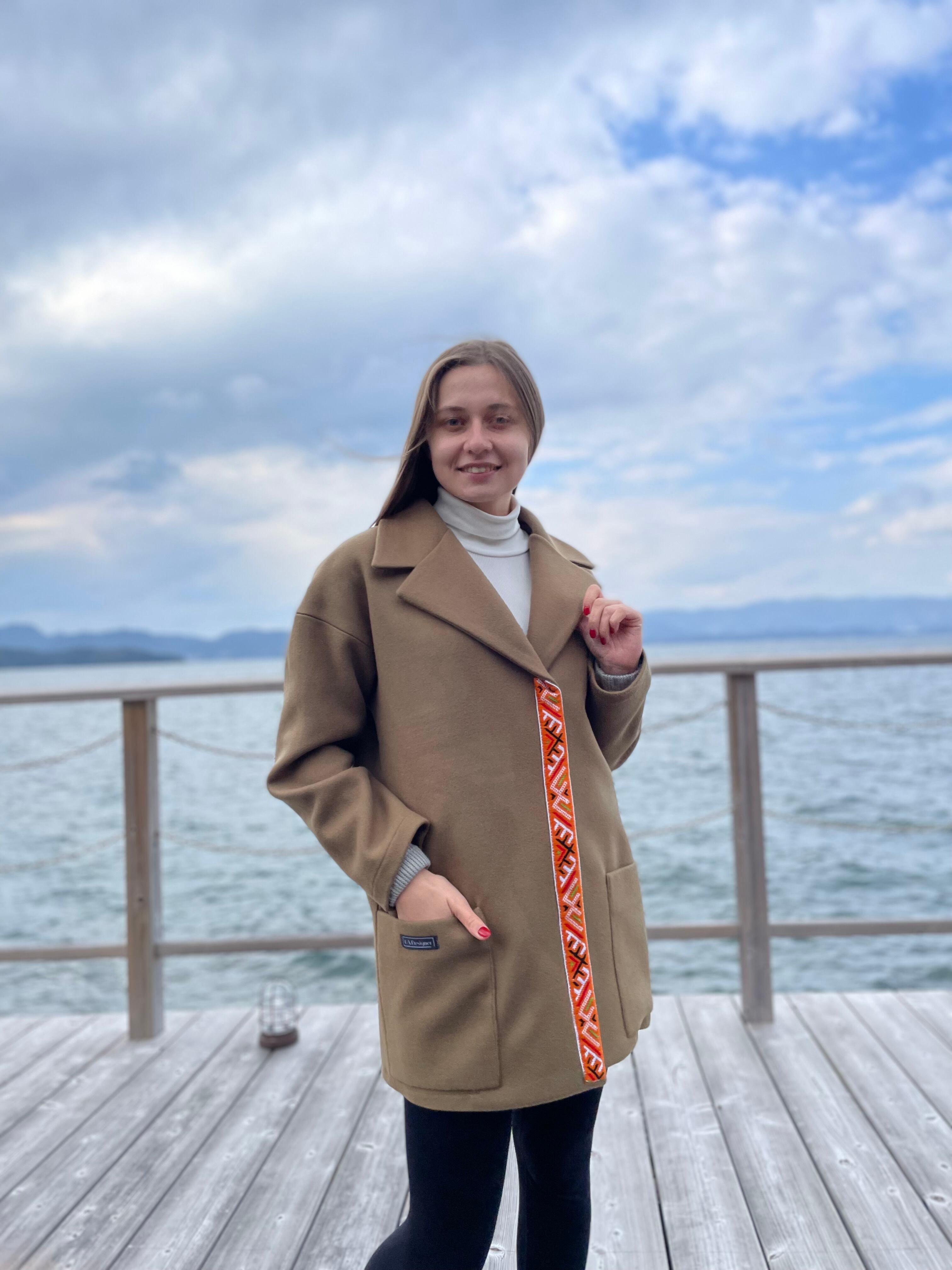 カシミヤはウクライナ西部のカルパティア山脈にて採れた羊毛を使用しています。コートには、贅沢にあしらわれたウクライナの伝統的な手刺繍が輝きます。
