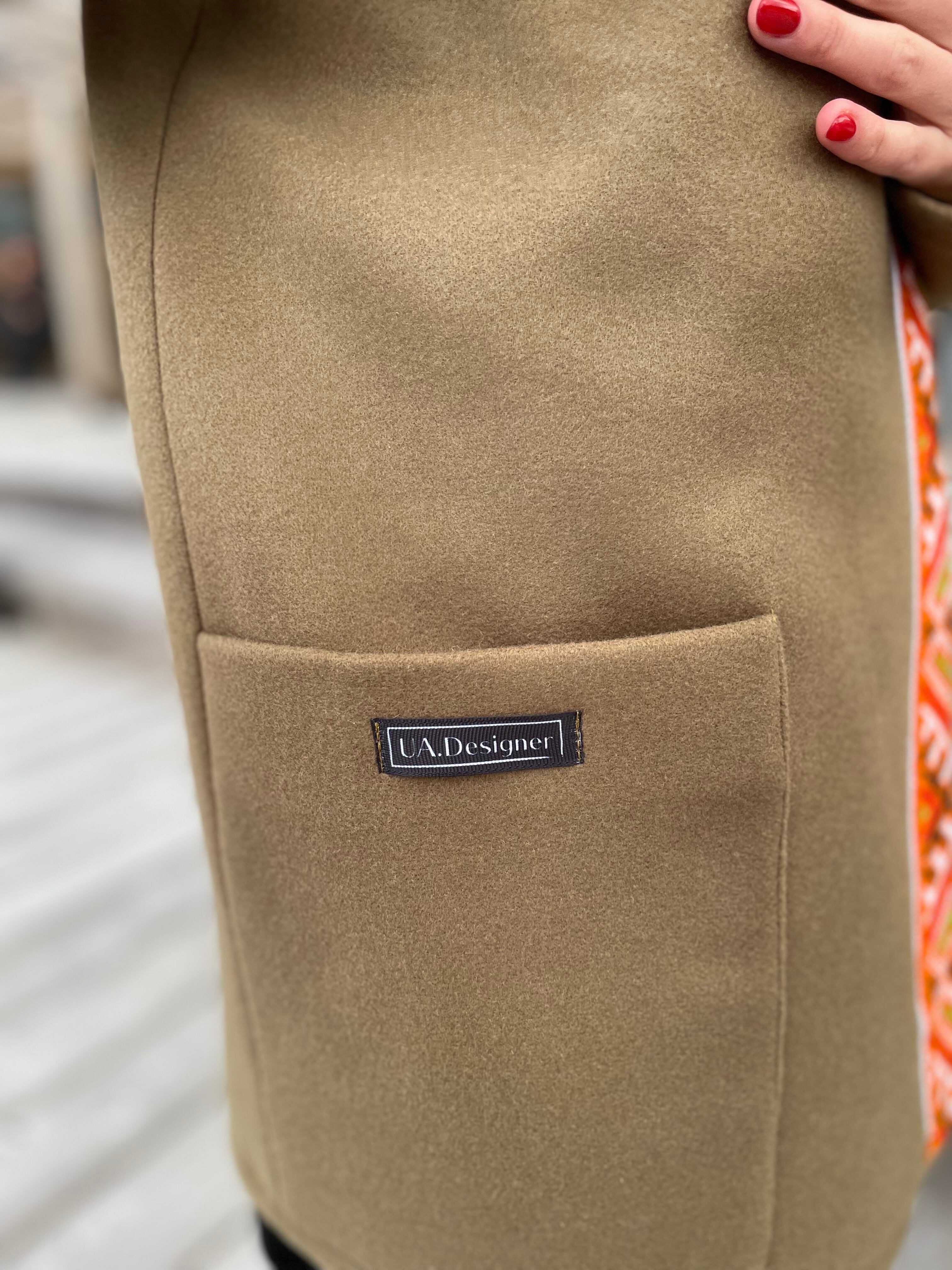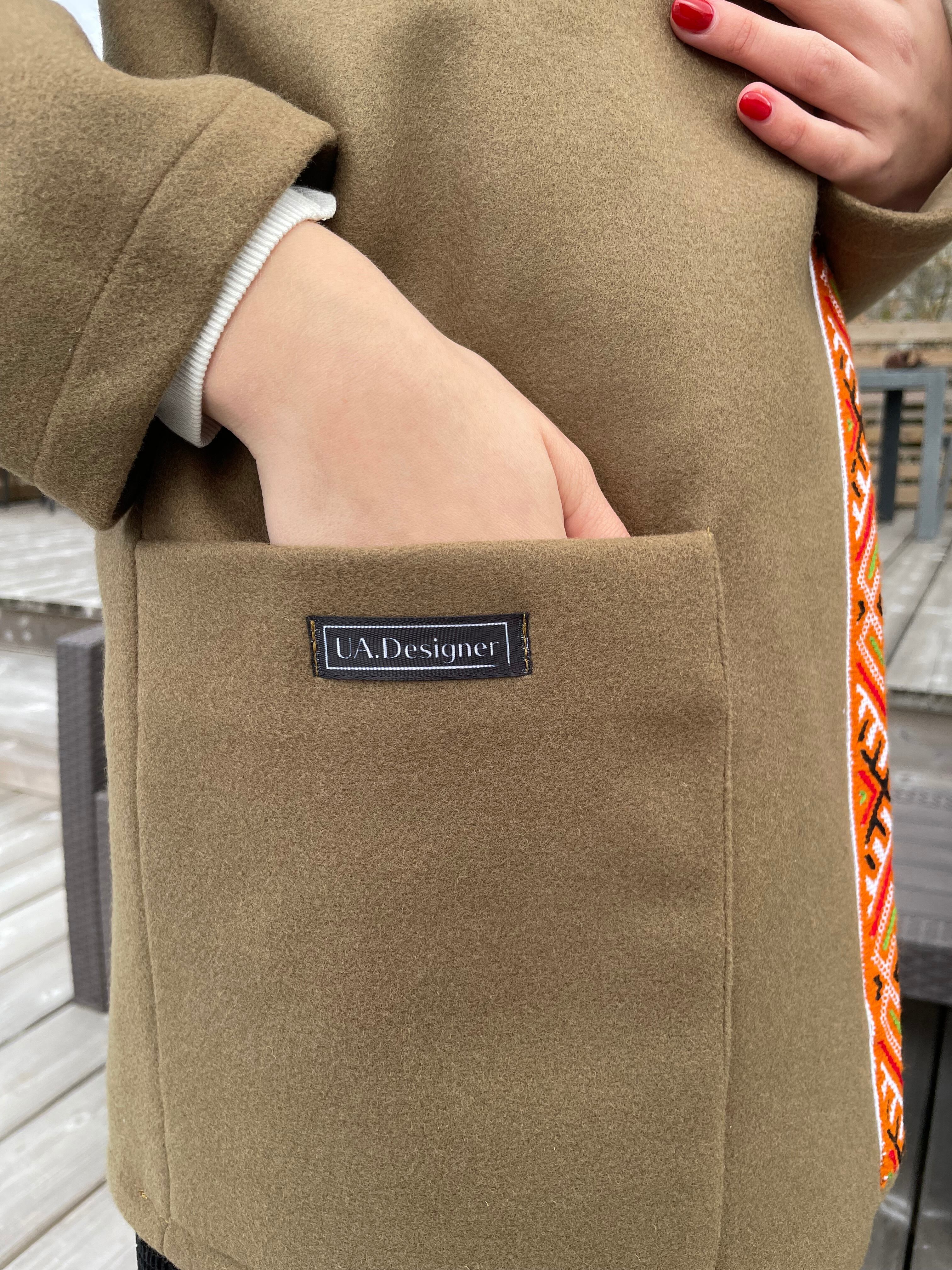 カシミヤ100%の軽く暖かい最高品質なロングコートです。襟元には、ウクライナの伝統的な幾何学な刺繍を全て手作業で施してあります。
