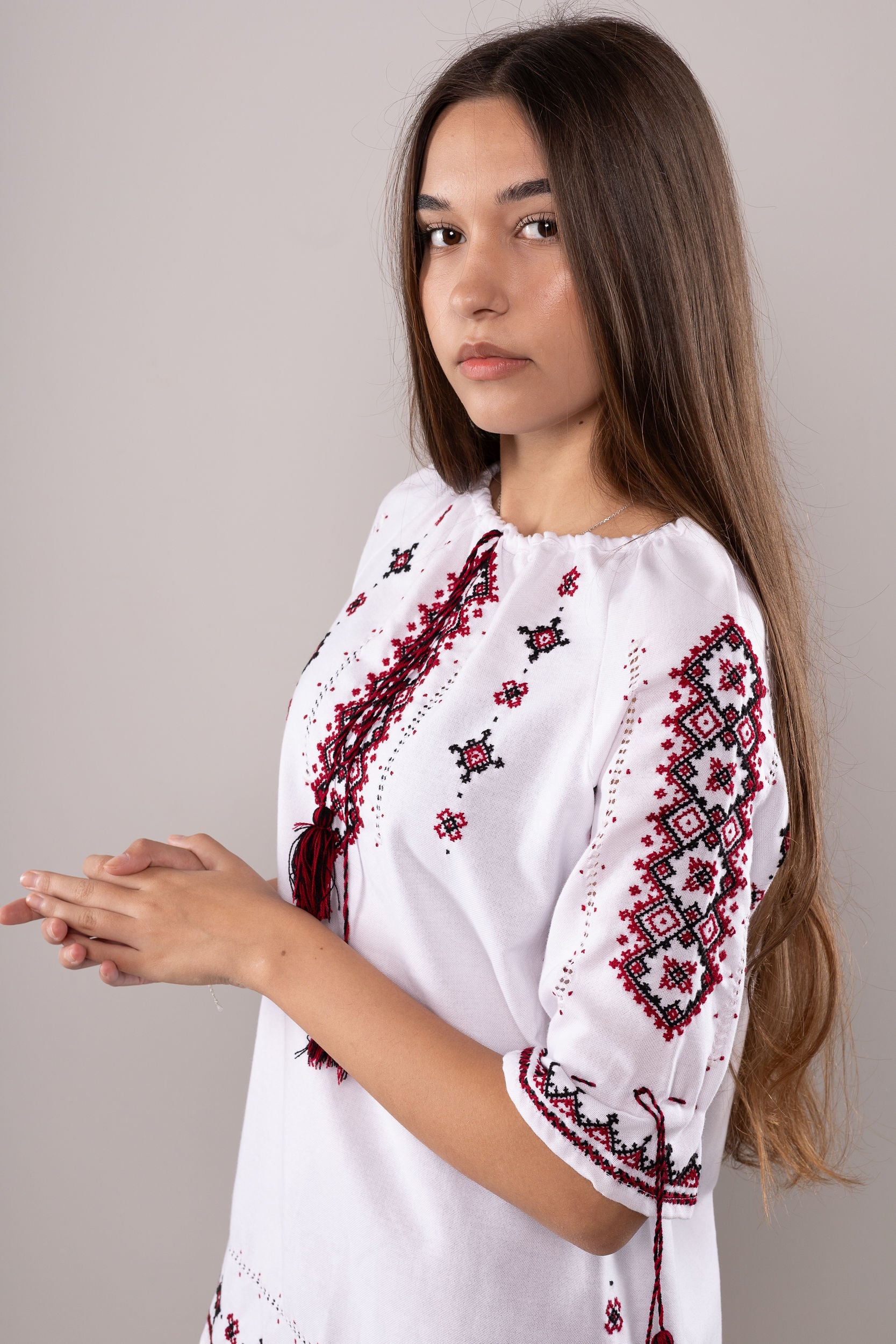 このドレスは、ウクライナの伝統と美しさを象徴するヴィシヴァンカの刺繍を採用しています。過度な派手さを追求せず、日本の日常生活に自然に溶け込むデザインとなっております。しかし、それでいて洗練された高級感とカジュアルな雰囲気を両立させ、見る人を魅了する一着となっています。熟練した刺繍職人が、数ヶ月以上かけ直接手縫いで衣装に縫い付けております。