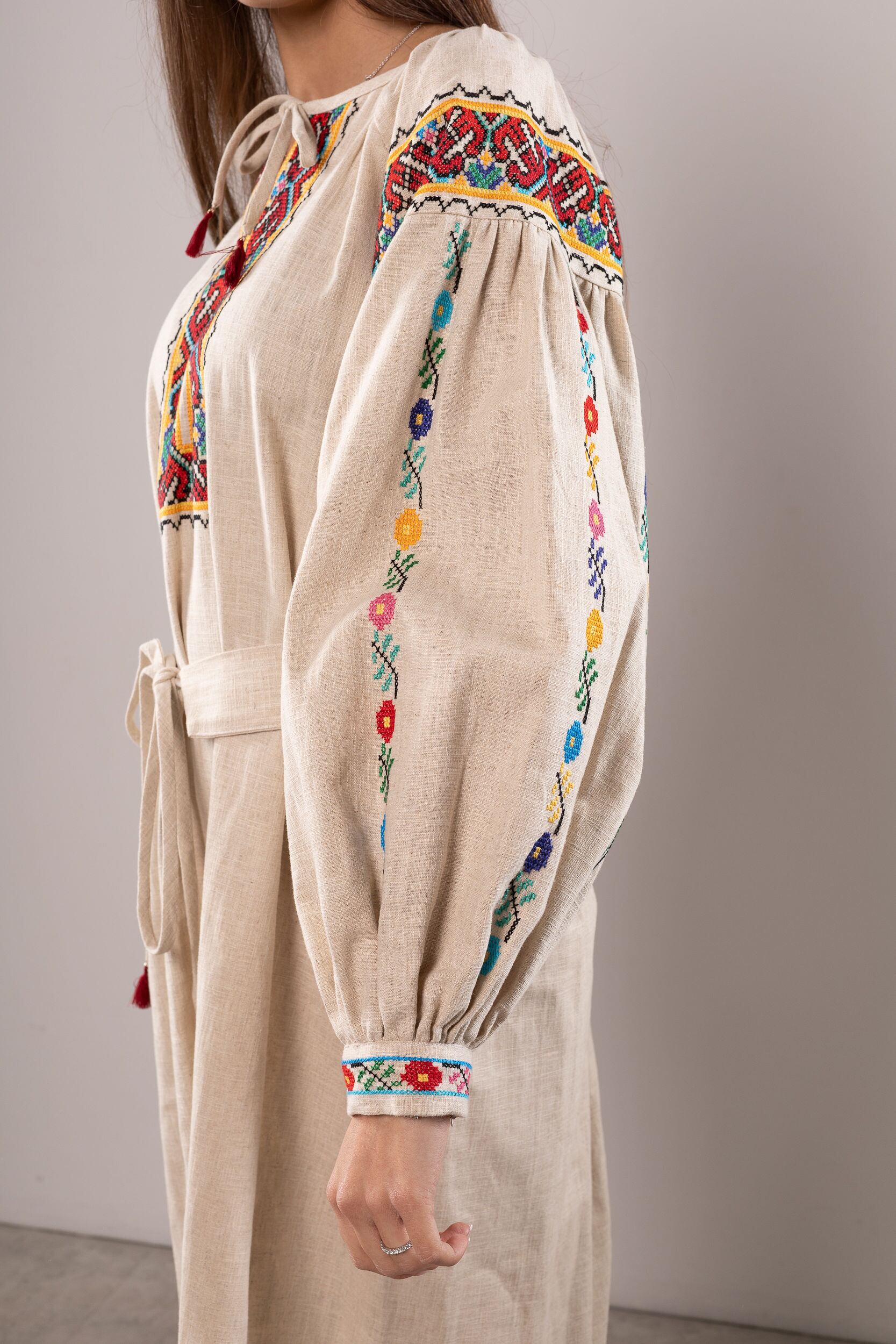 このドレスは、ウクライナの伝統と美しさを象徴するヴィシヴァンカの刺繍を採用しています。過度な派手さを追求せず、日本の日常生活に自然に溶け込むデザインとなっております。しかし、それでいて洗練された高級感とカジュアルな雰囲気を両立させ、見る人を魅了する一着となっています。熟練した刺繍職人が、数ヶ月以上かけ直接手縫いで衣装に縫い付けております。