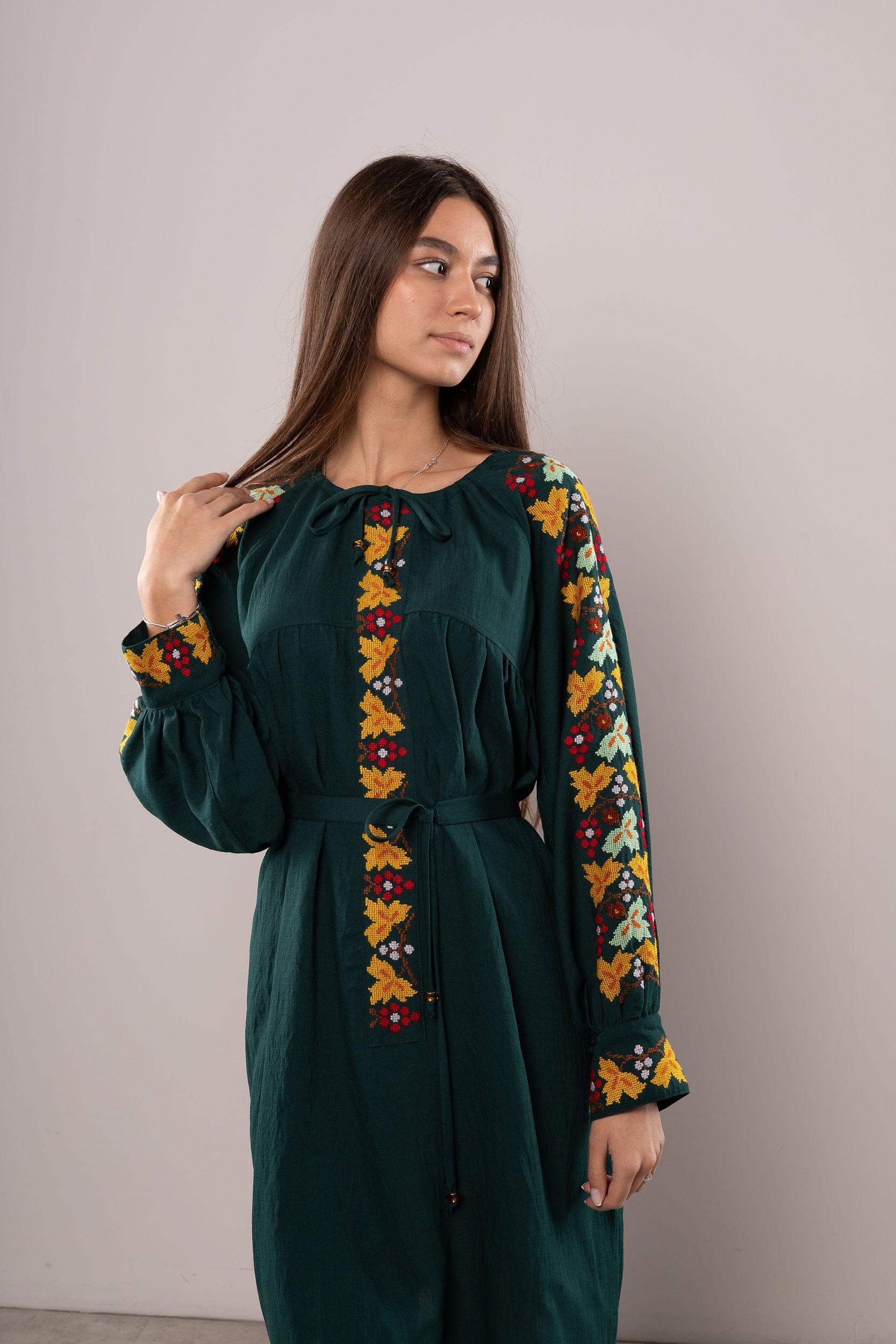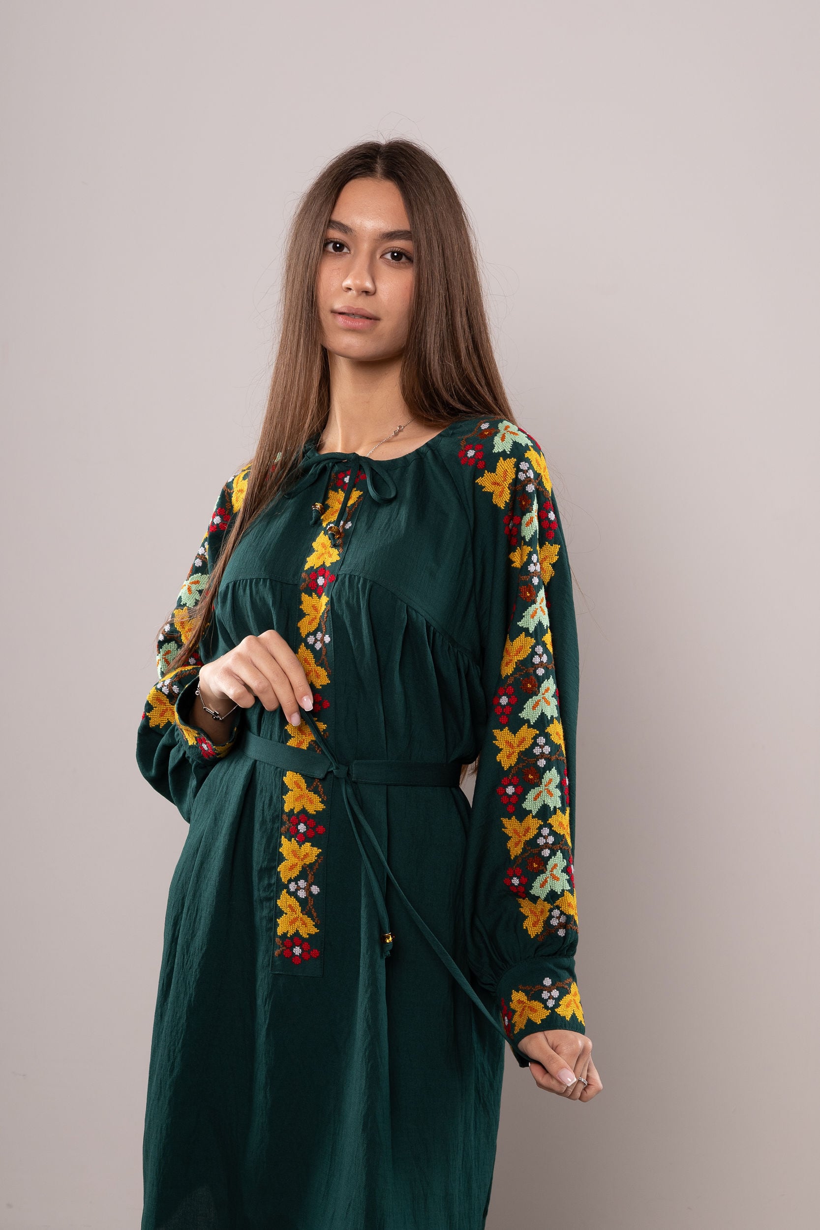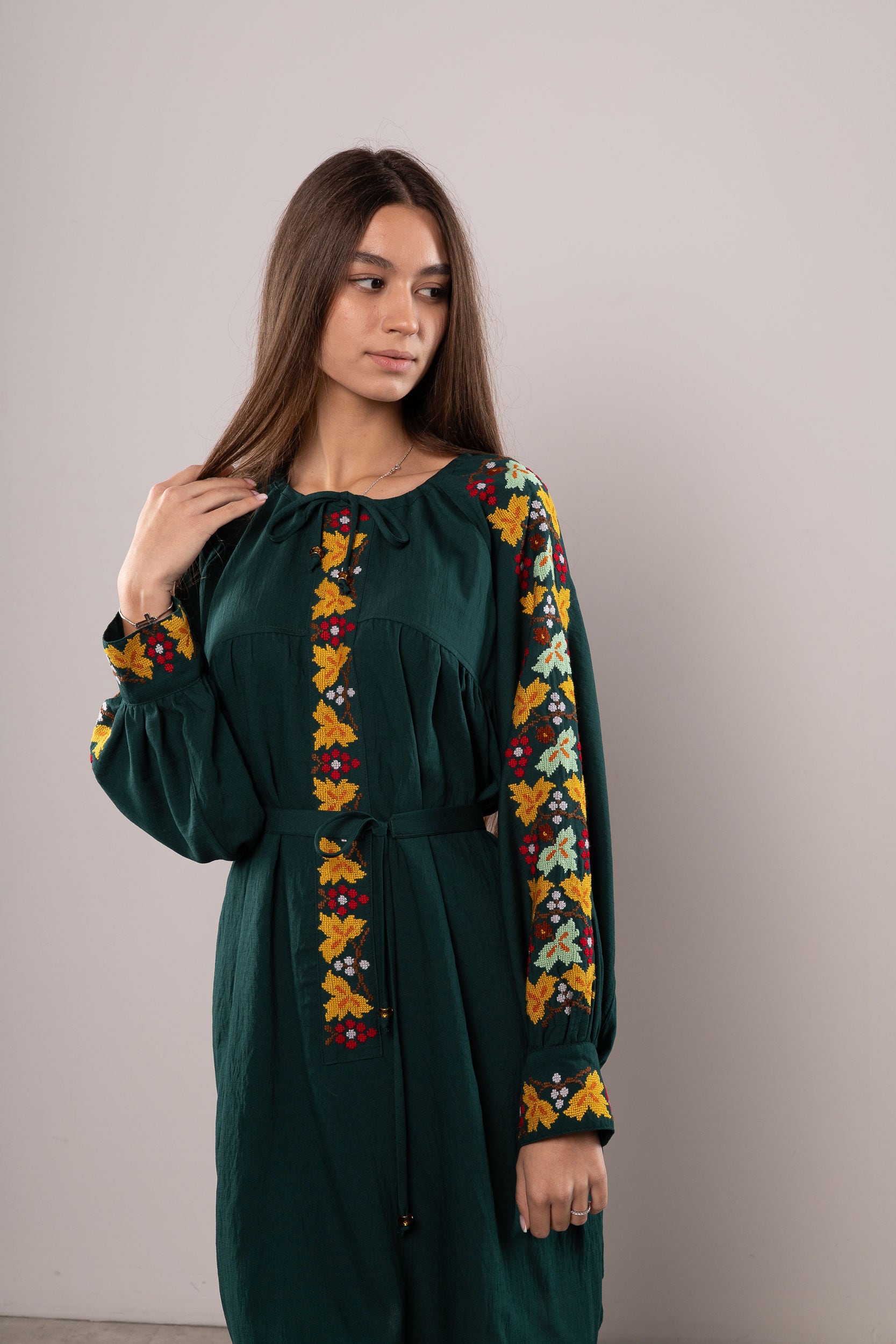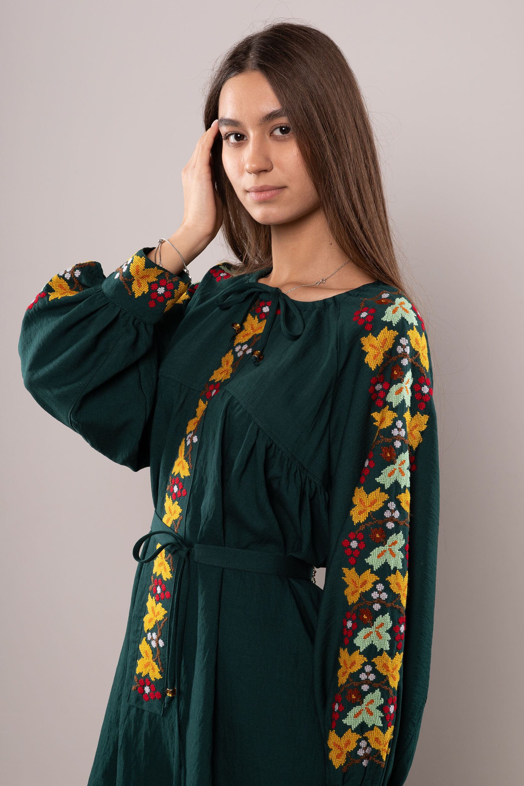 このドレスは、ウクライナの伝統と美しさを象徴するヴィシヴァンカの刺繍を採用しています。過度な派手さを追求せず、日本の日常生活に自然に溶け込むデザインとなっております。しかし、それでいて洗練された高級感とカジュアルな雰囲気を両立させ、見る人を魅了する一着となっています。熟練した刺繍職人が、数ヶ月以上かけ直接手縫いで衣装に縫い付けております。