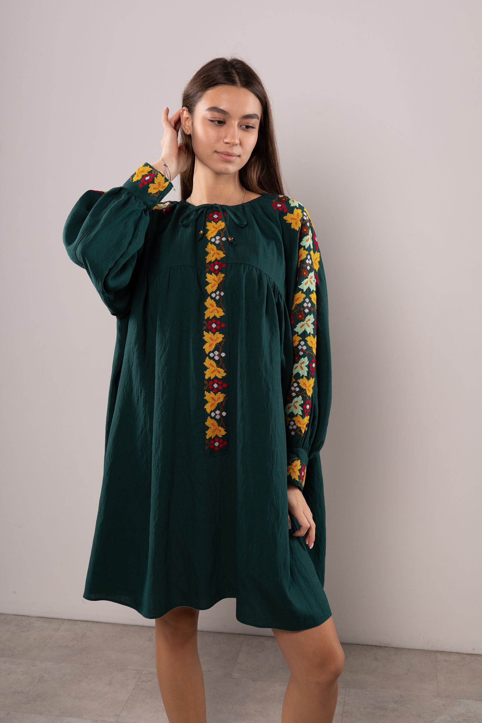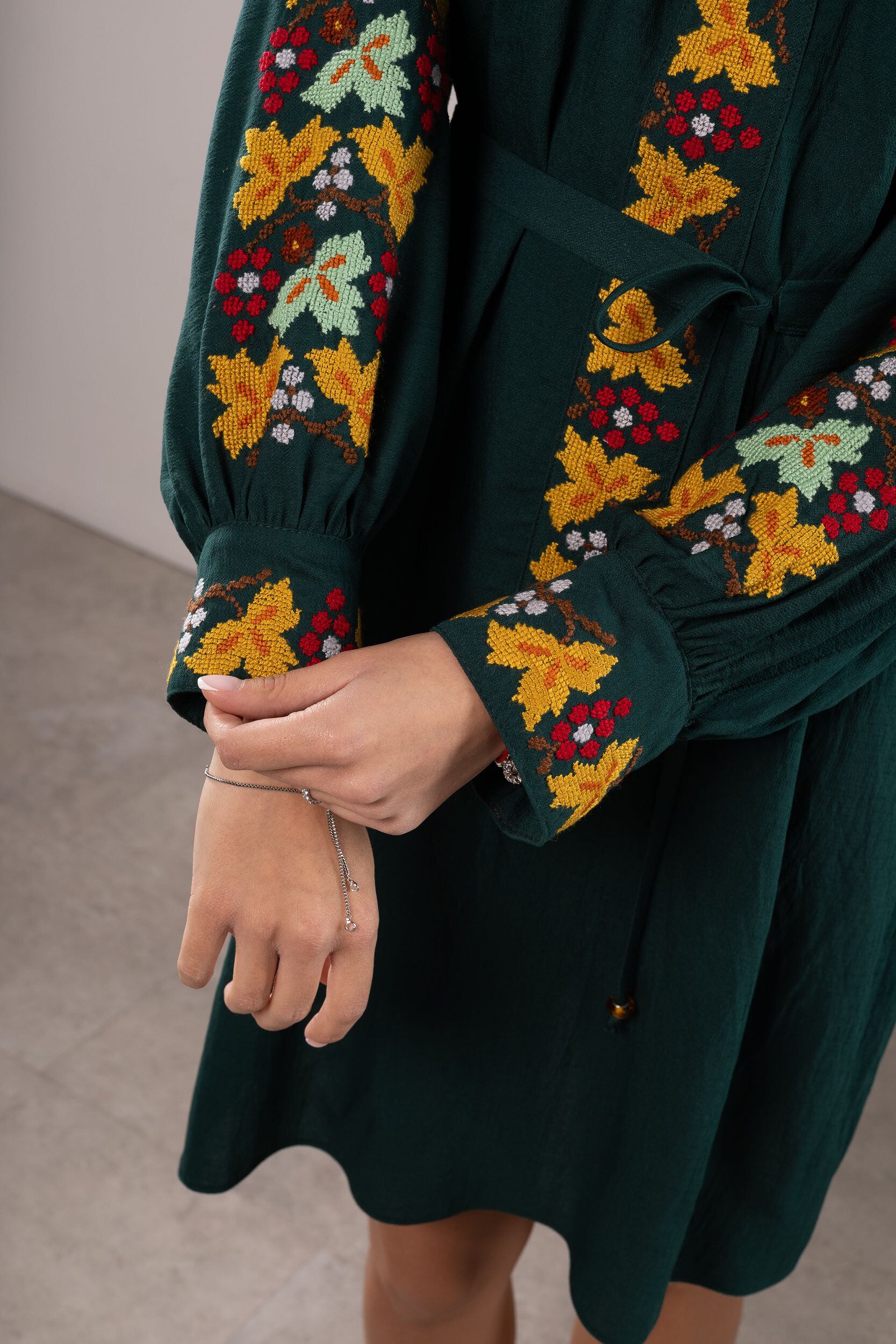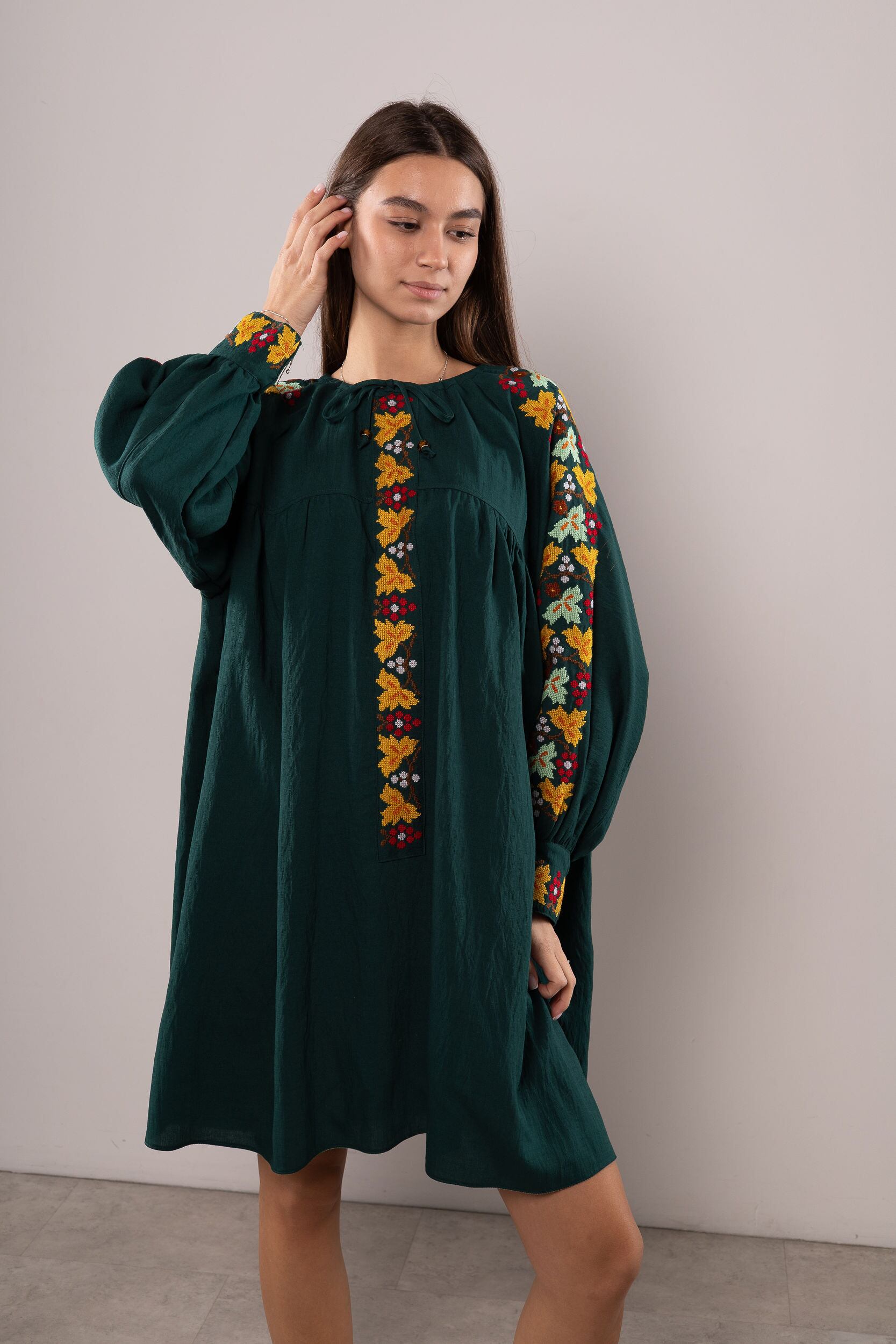 このドレスは、ウクライナの伝統と美しさを象徴するヴィシヴァンカの刺繍を採用しています。過度な派手さを追求せず、日本の日常生活に自然に溶け込むデザインとなっております。しかし、それでいて洗練された高級感とカジュアルな雰囲気を両立させ、見る人を魅了する一着となっています。熟練した刺繍職人が、数ヶ月以上かけ直接手縫いで衣装に縫い付けております。