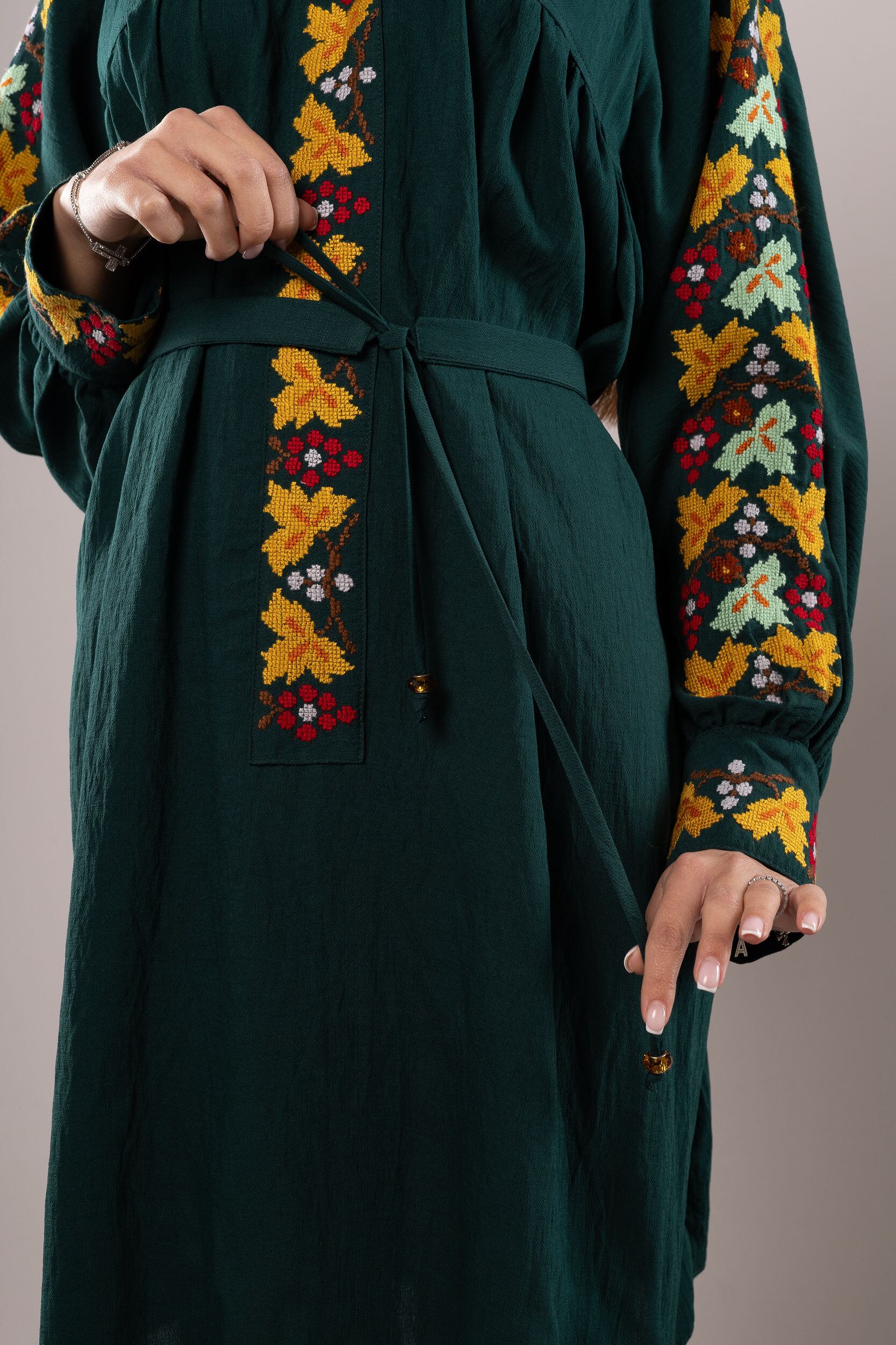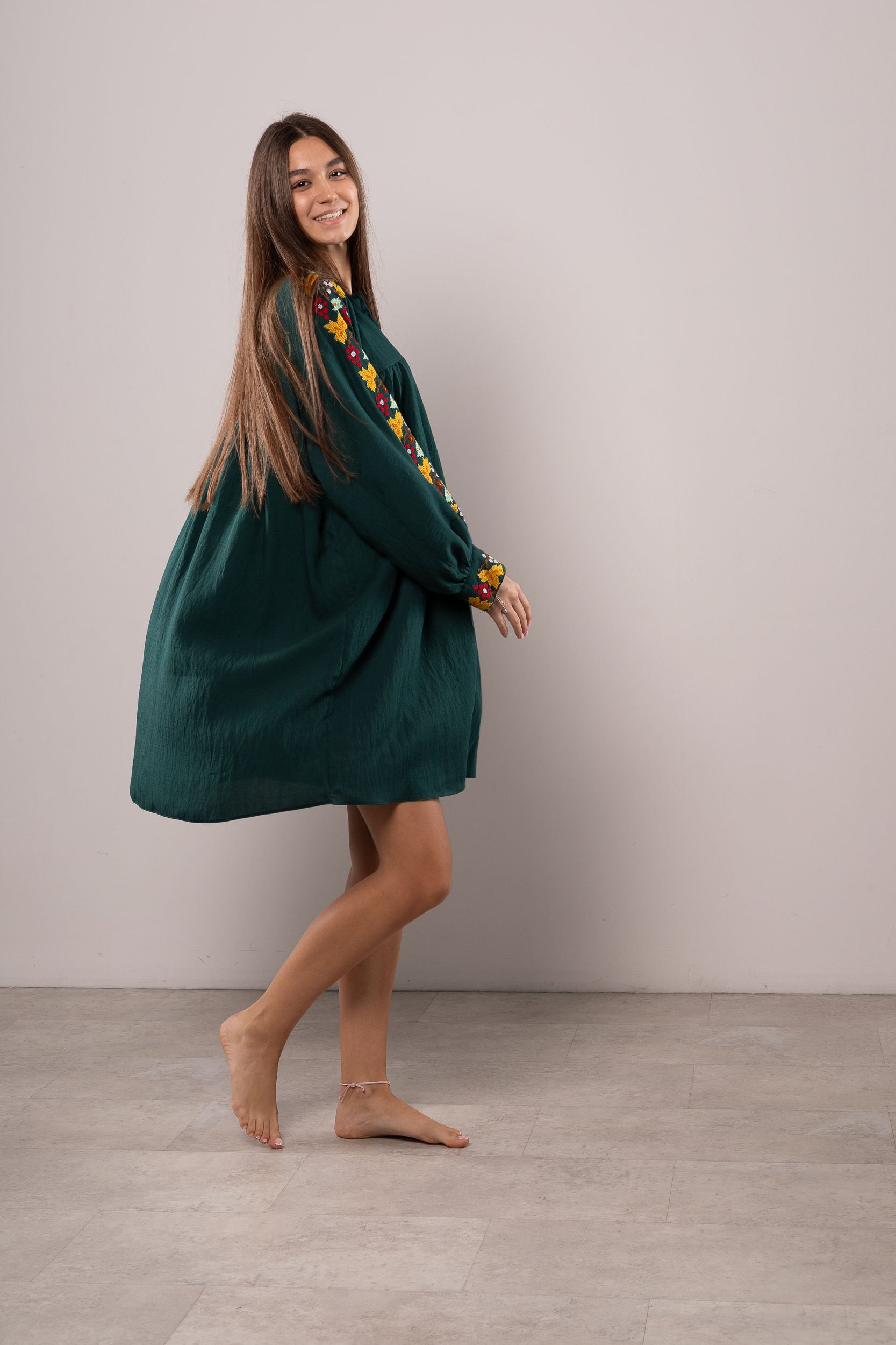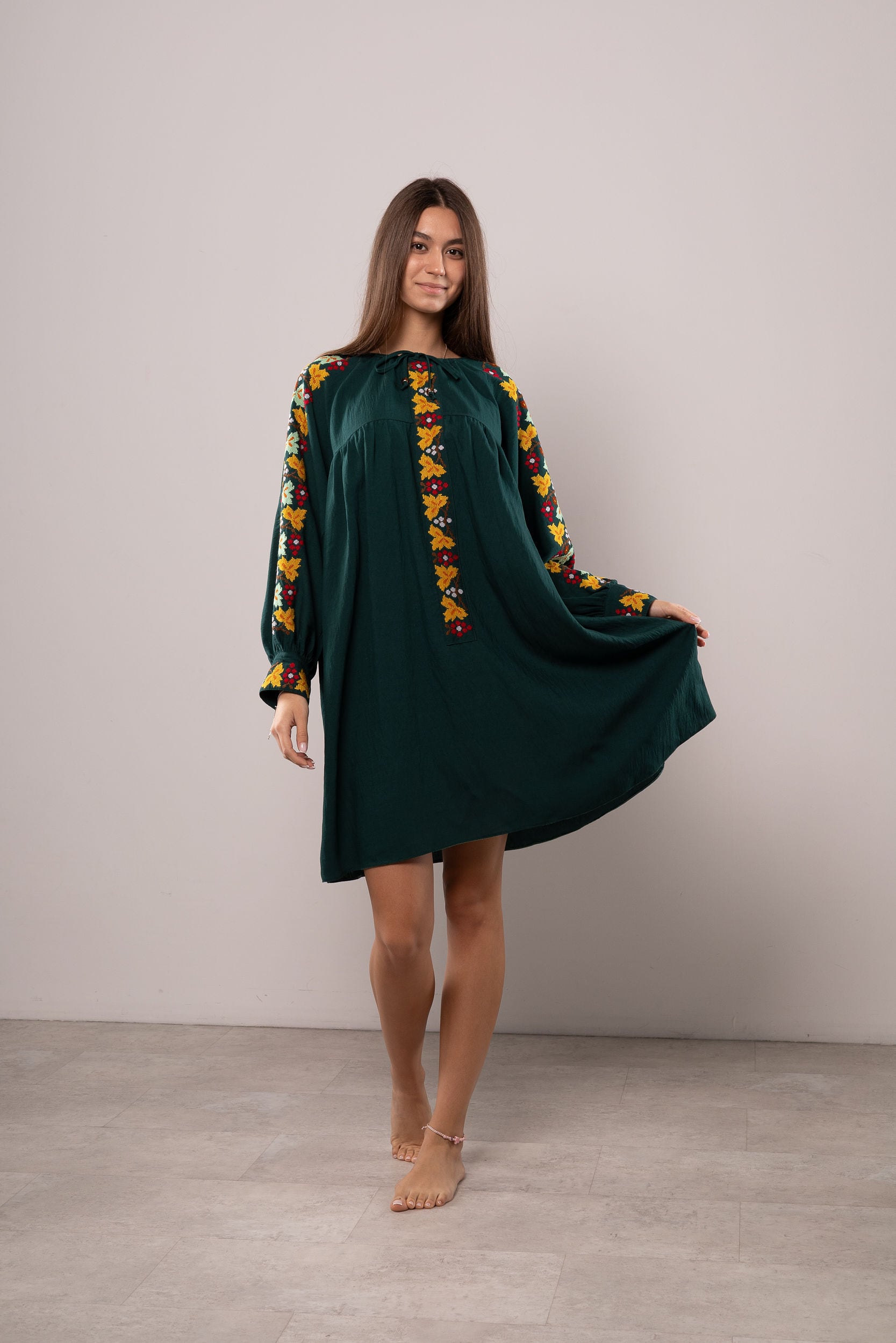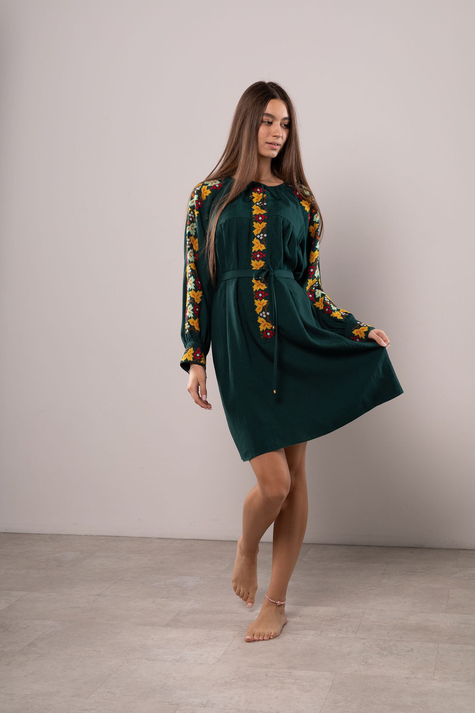 このドレスは、ウクライナの伝統と美しさを象徴するヴィシヴァンカの刺繍を採用しています。過度な派手さを追求せず、日本の日常生活に自然に溶け込むデザインとなっております。しかし、それでいて洗練された高級感とカジュアルな雰囲気を両立させ、見る人を魅了する一着となっています。熟練した刺繍職人が、数ヶ月以上かけ直接手縫いで衣装に縫い付けております。