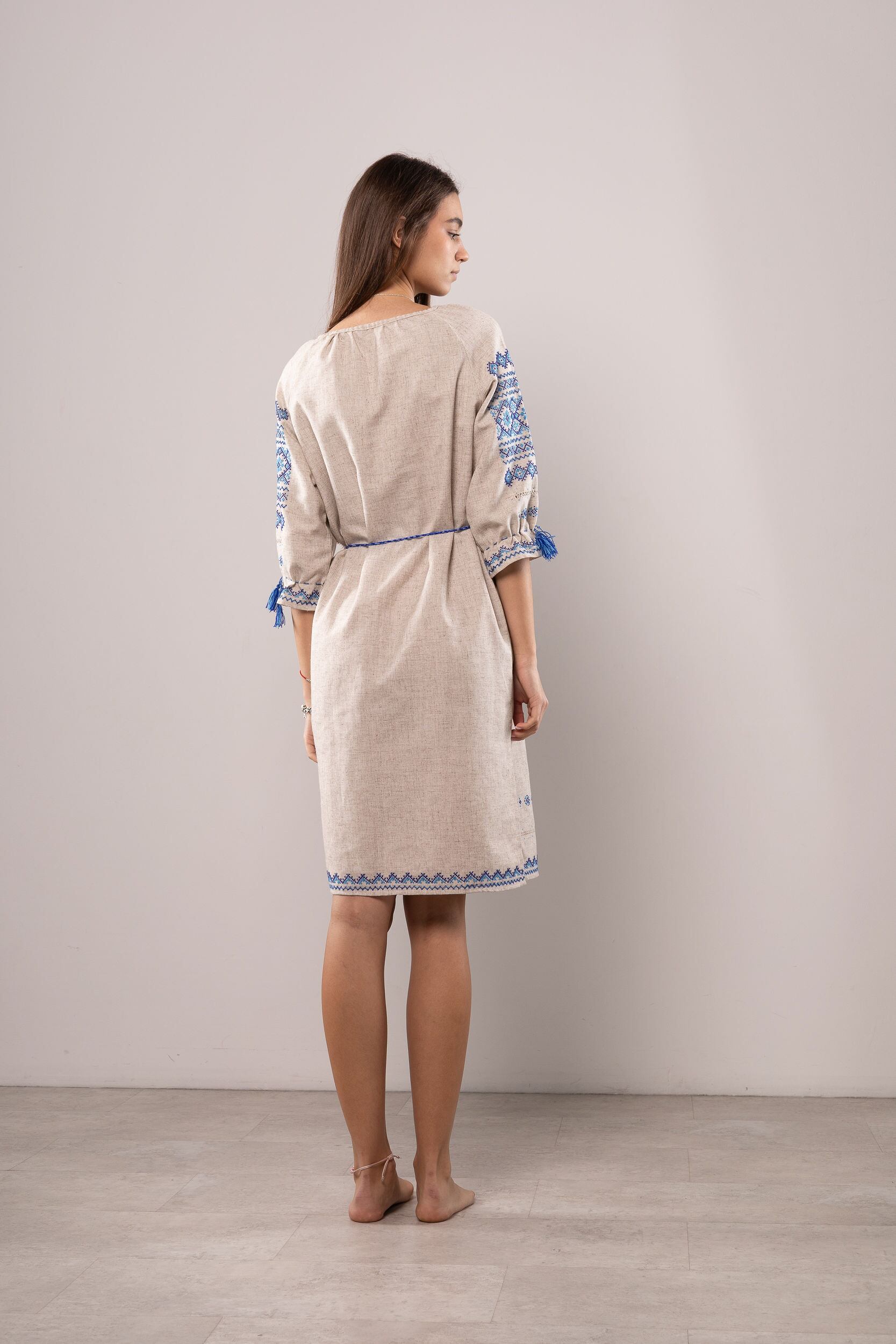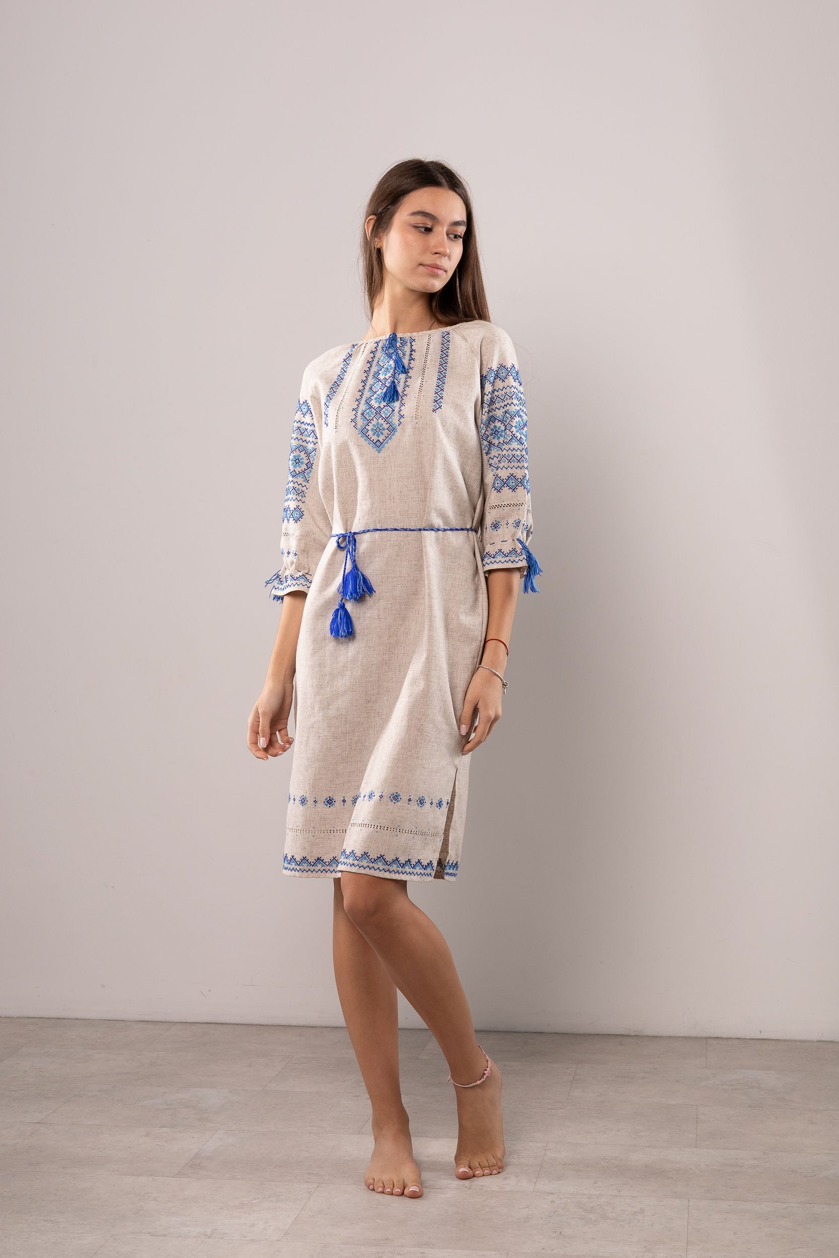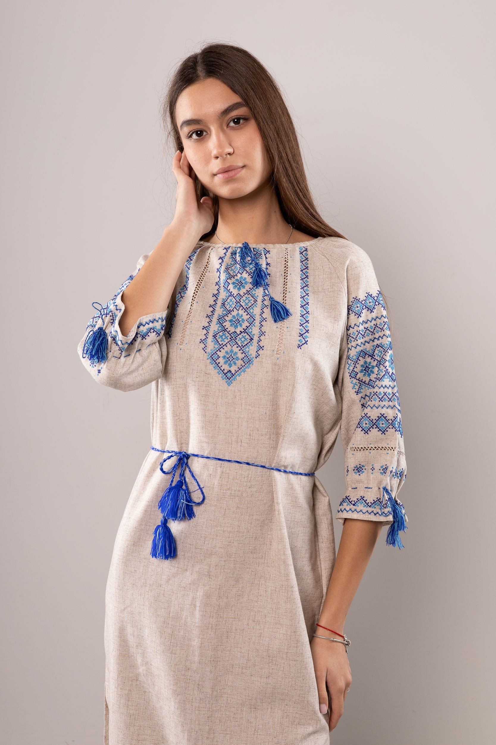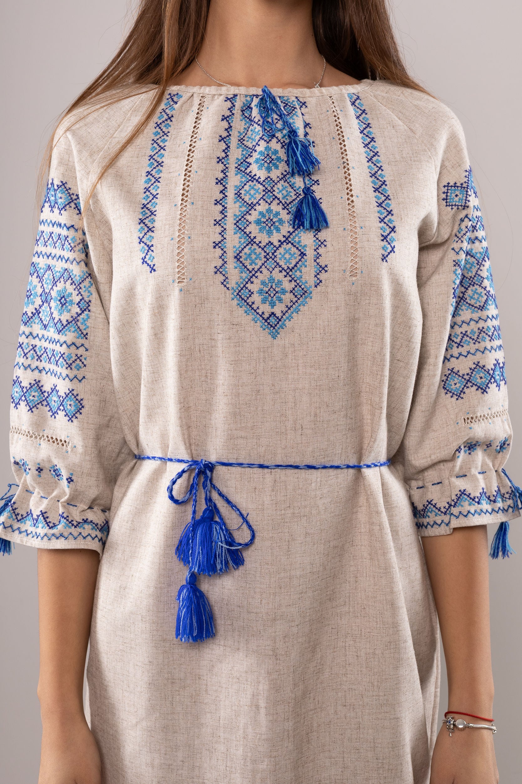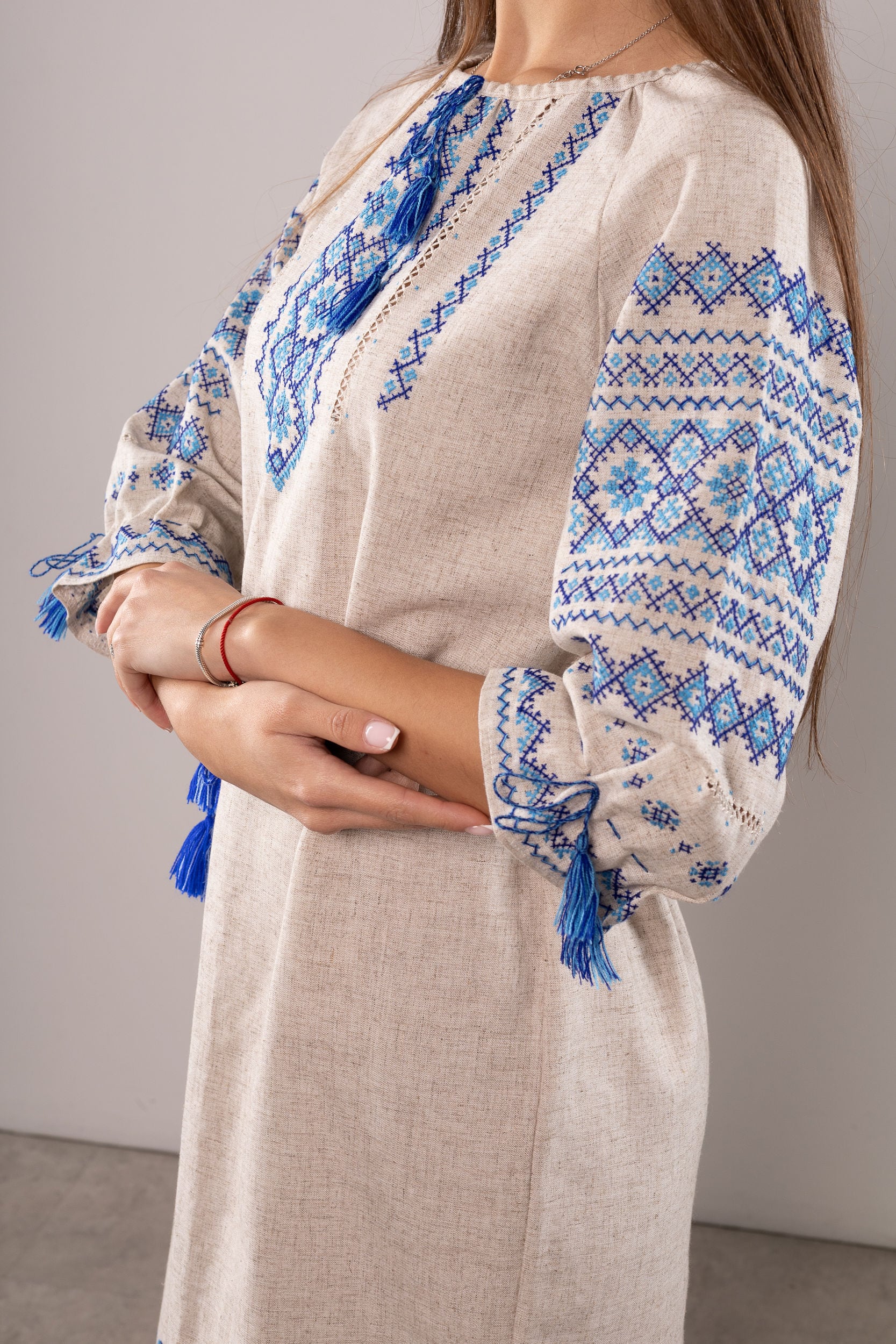 このドレスは、ウクライナの伝統と美しさを象徴するヴィシヴァンカの刺繍を採用しています。過度な派手さを追求せず、日本の日常生活に自然に溶け込むデザインとなっております。しかし、それでいて洗練された高級感とカジュアルな雰囲気を両立させ、見る人を魅了する一着となっています。熟練した刺繍職人が、数ヶ月以上かけ直接手縫いで衣装に縫い付けております。