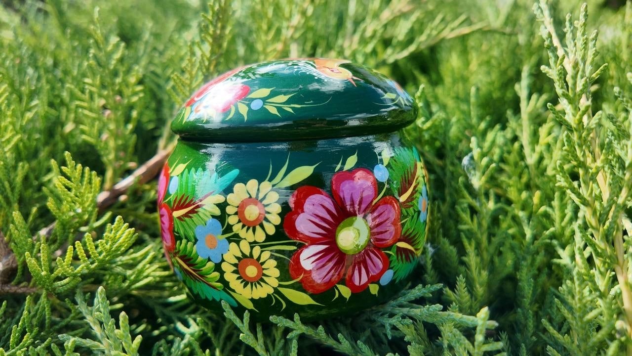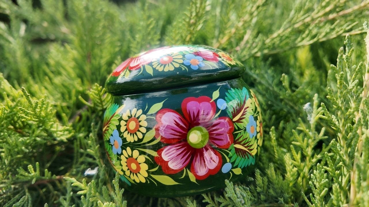 詳細:ペトリキフカ・ジュエリーボックスは、ウクライナの伝統的な芸術、ペトリキフカ塗りの精粋を表現する逸品です。この芸術は、ドニプロ近郊のペトリキフカ村にて代々受け継がれてきた名家の手によって生み出されています。