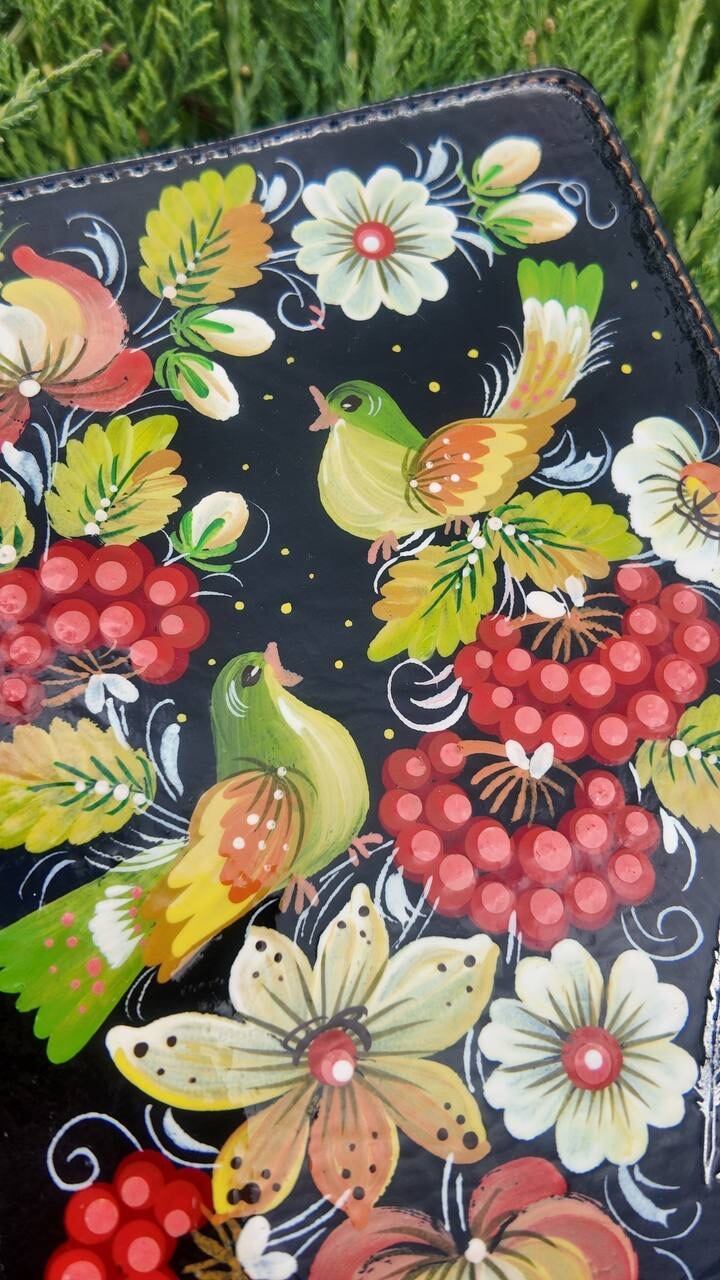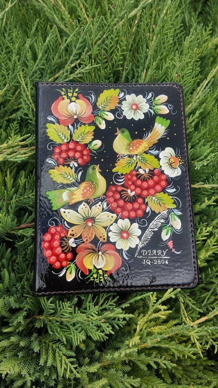 ノートの表面には、美しいペトリキフカ塗りの装飾が施されており、古い時代の風格と現代の美が融合しています。中身は、日付を記入することで日記やスケジュール帳として使える英語のページが含まれています。