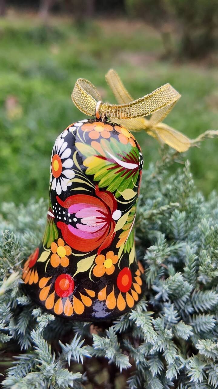 このデコレーションは、ウクライナの伝統的なペイント技法「ペトリキフカ塗り」を使用して作られています。ペトリキフカ塗りは、色とりどりの花や模様で知られ、長い歴史を持つウクライナの美術技法の一つです。