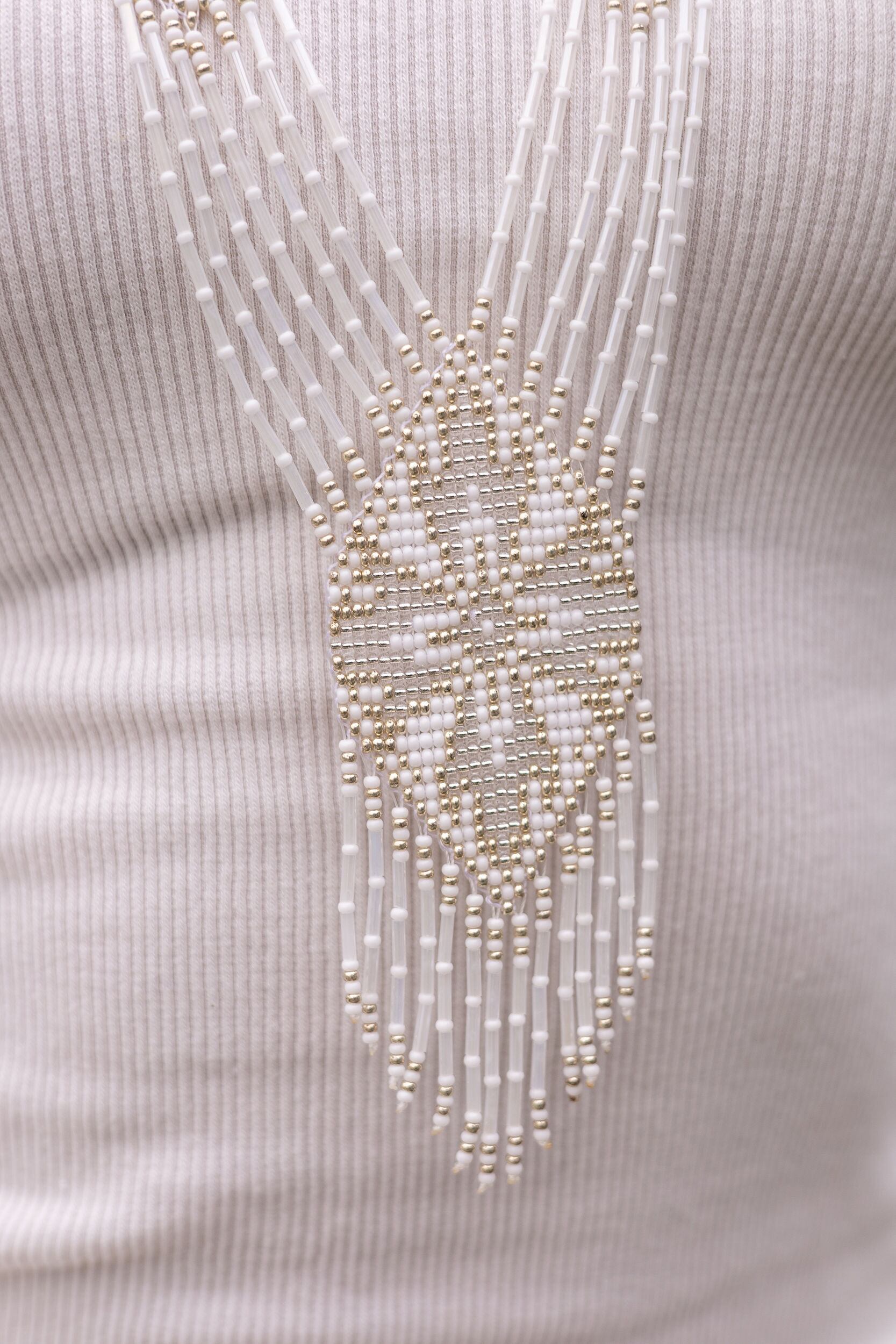 幅の異なるビーズストリップを首からかけ、前面のメダリオンでつなぐスタイルが一般的です。胸元を華やかに飾るデザインが多く見られます。