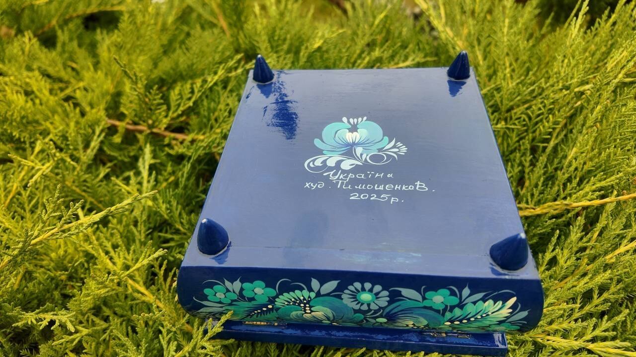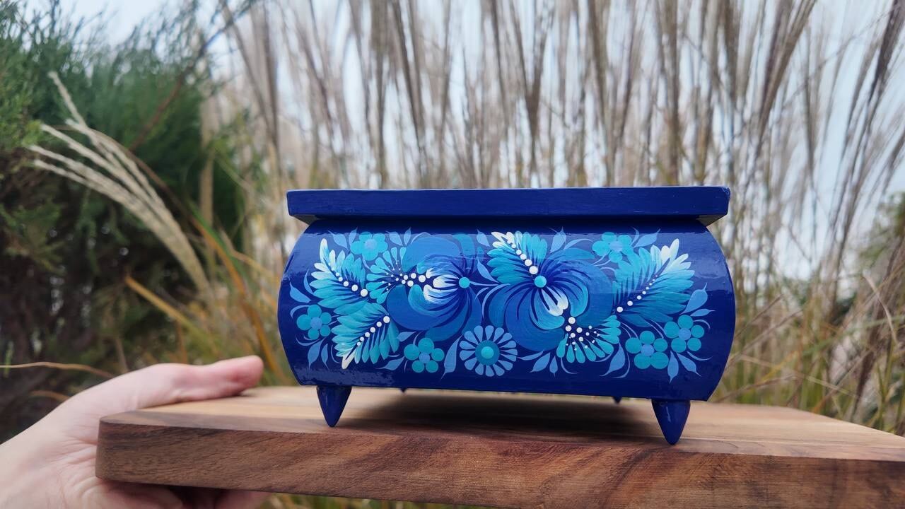 この美しいジュエリーボックスは、ペトリキフカ村のシナノキゾクの樹木から一から手作業で切り彫られ、細部にわたって丁寧に仕上げられています。シナノキの木材は、ウクライナでは御守りとしての意味を持ち、幸運と安全をもたらすと信じられています。
