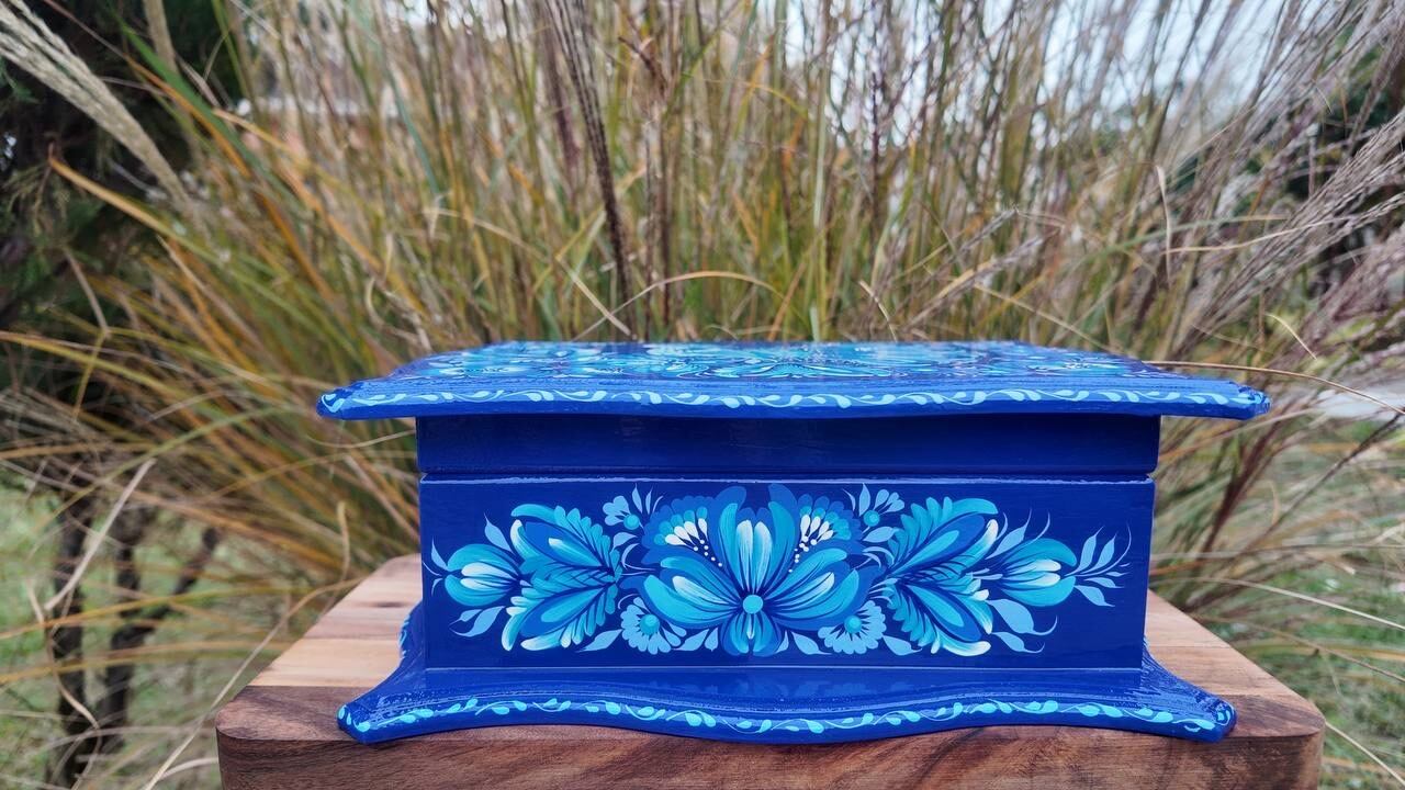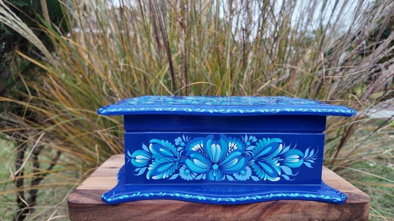 この美しいジュエリーボックスは、ペトリキフカ村のシナノキゾクの樹木から一から手作業で切り彫られ、細部にわたって丁寧に仕上げられています。シナノキの木材は、ウクライナでは御守りとしての意味を持ち、幸運と安全をもたらすと信じられています。