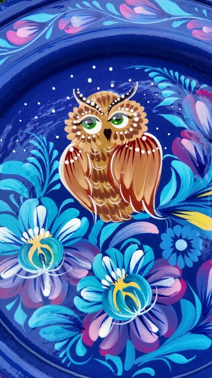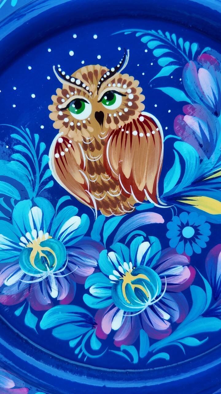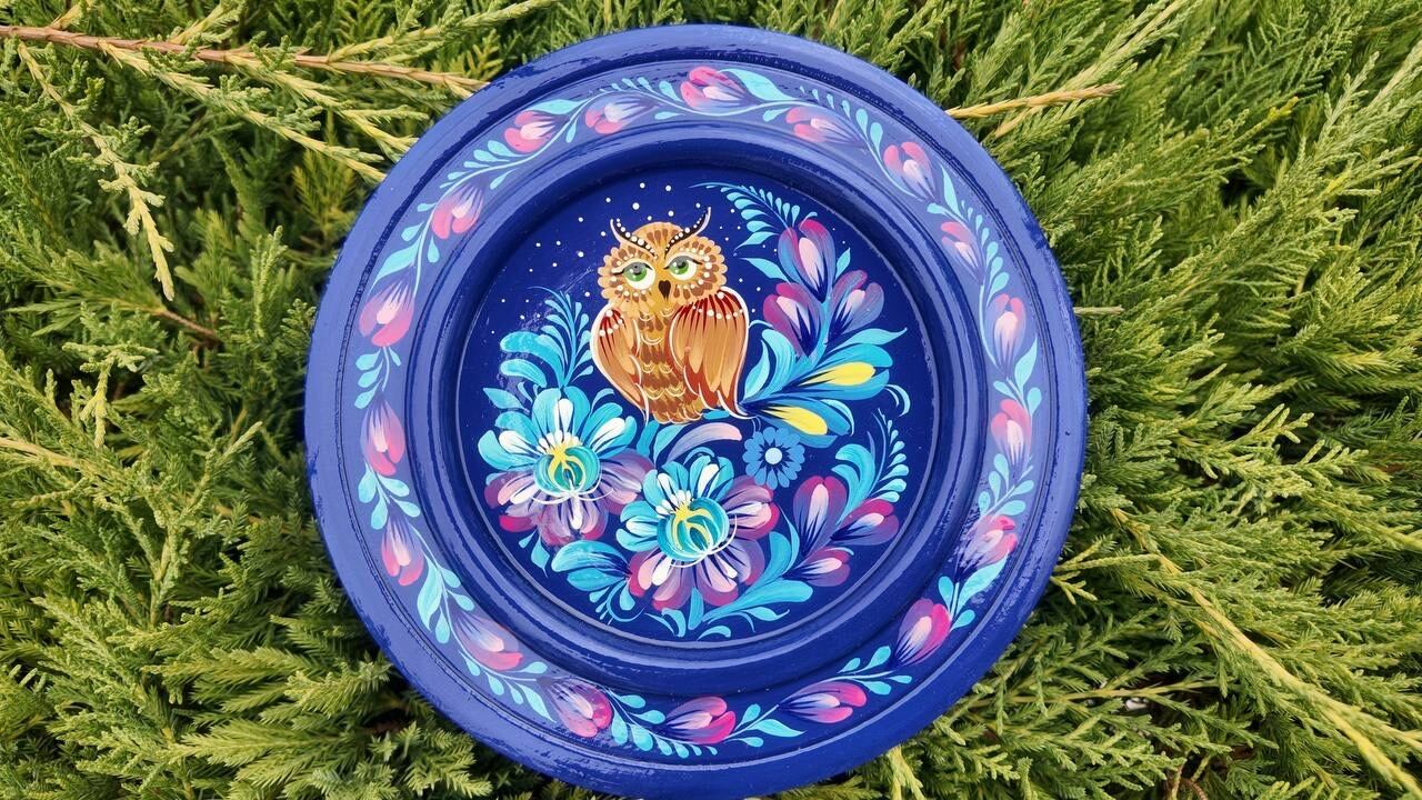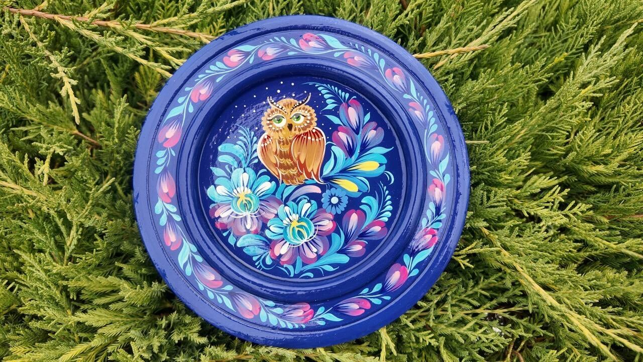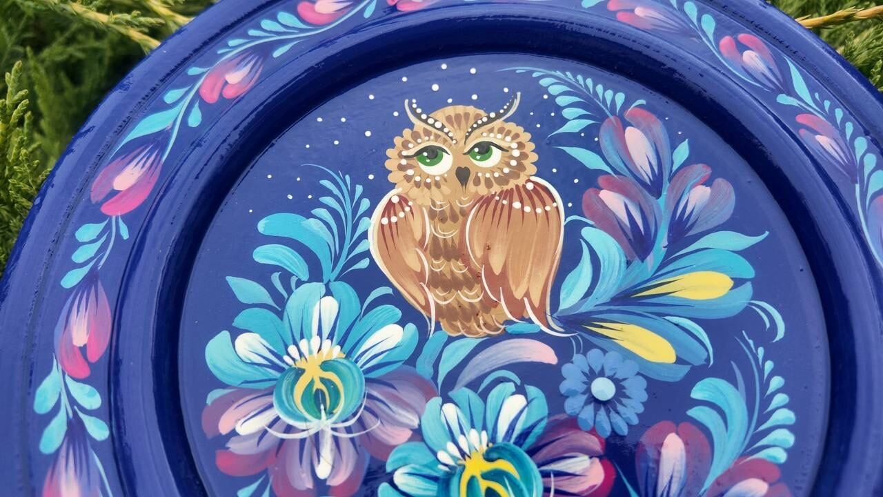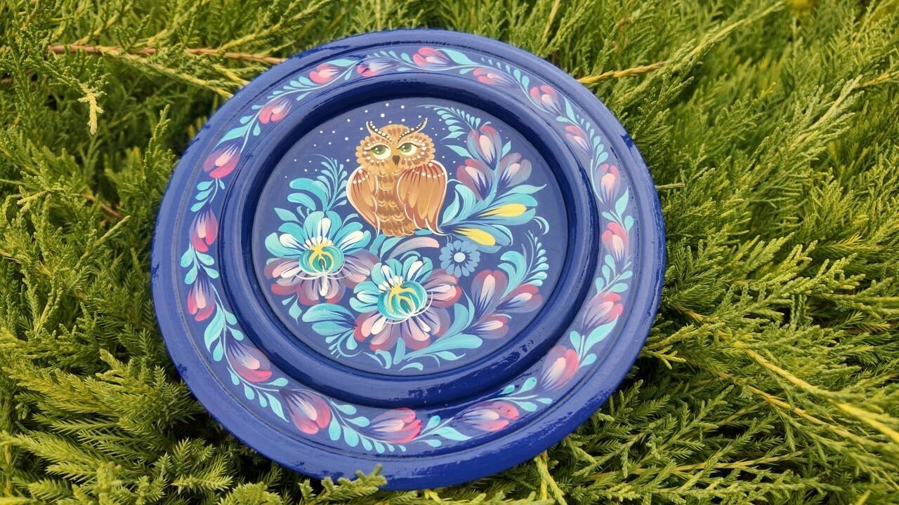 ペトリキウカ塗りのプレート 梟 (ティモシェンコ作)16cm