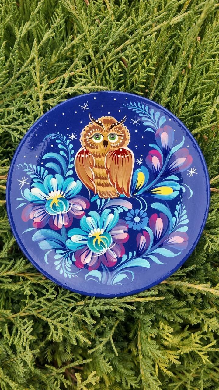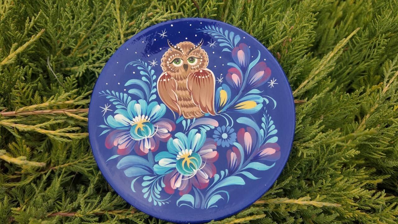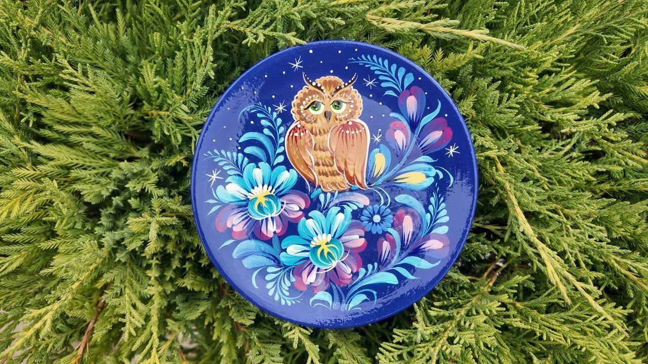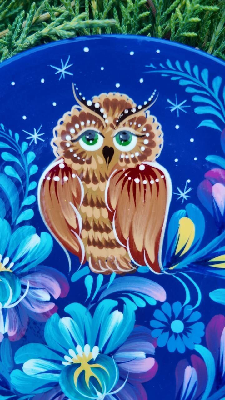 ペトリキウカ塗りのプレート 梟 (ティモシェンコ作)13cm
