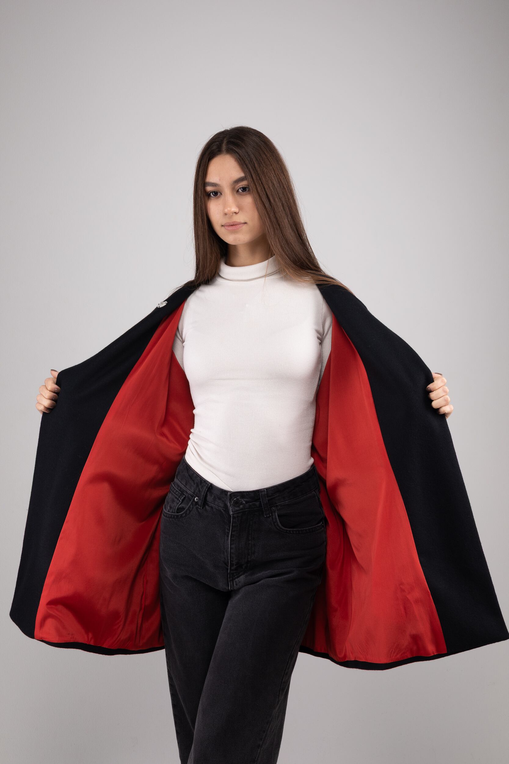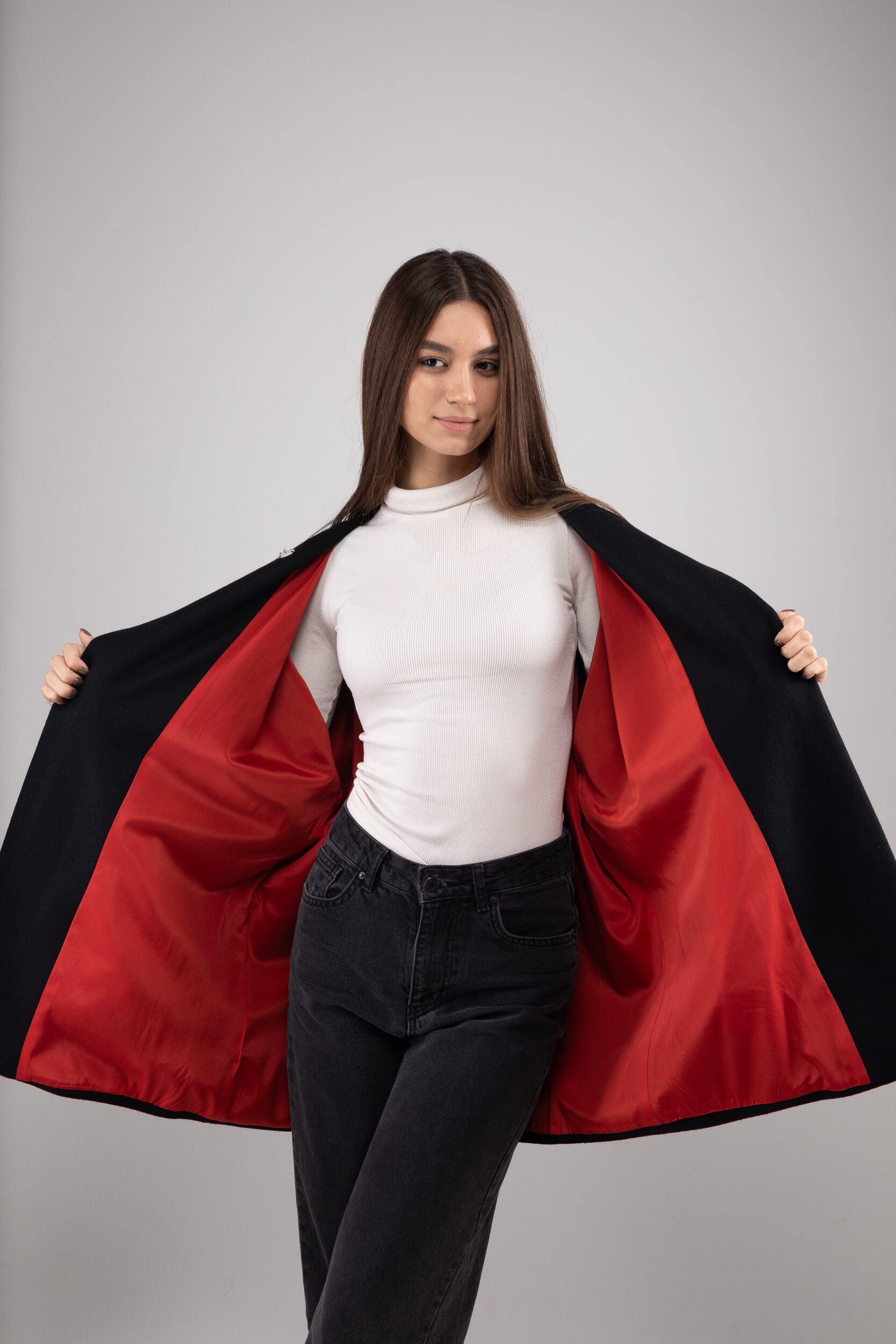 ウクライナ産プレミアムウール100%セミロングコート(黒)クロスステッチ 手刺繍