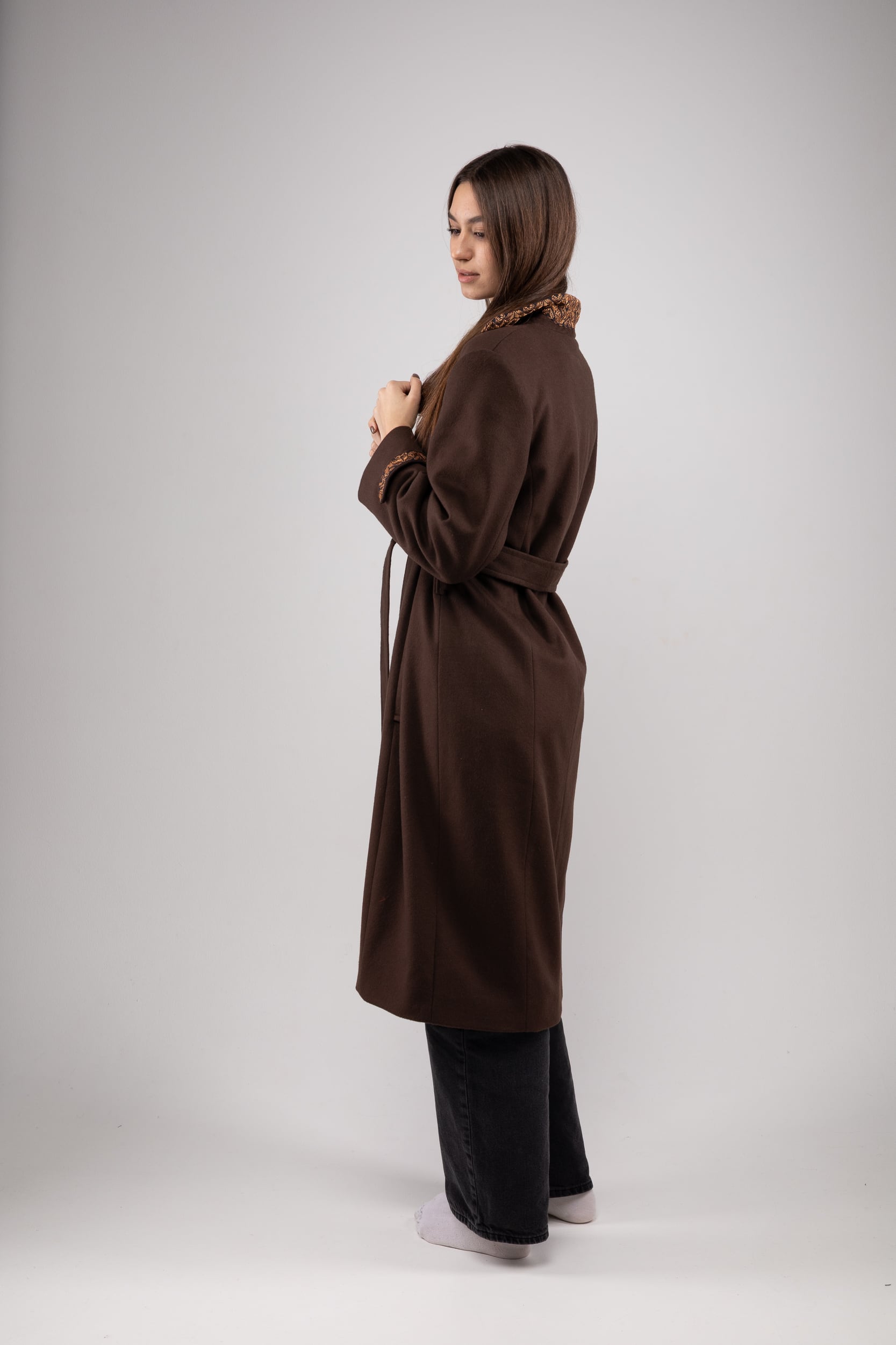 ウクライナ産プレミアムウール100%ロングコート(ブラウン)平行縫い シルク手刺繍 ユニセックス