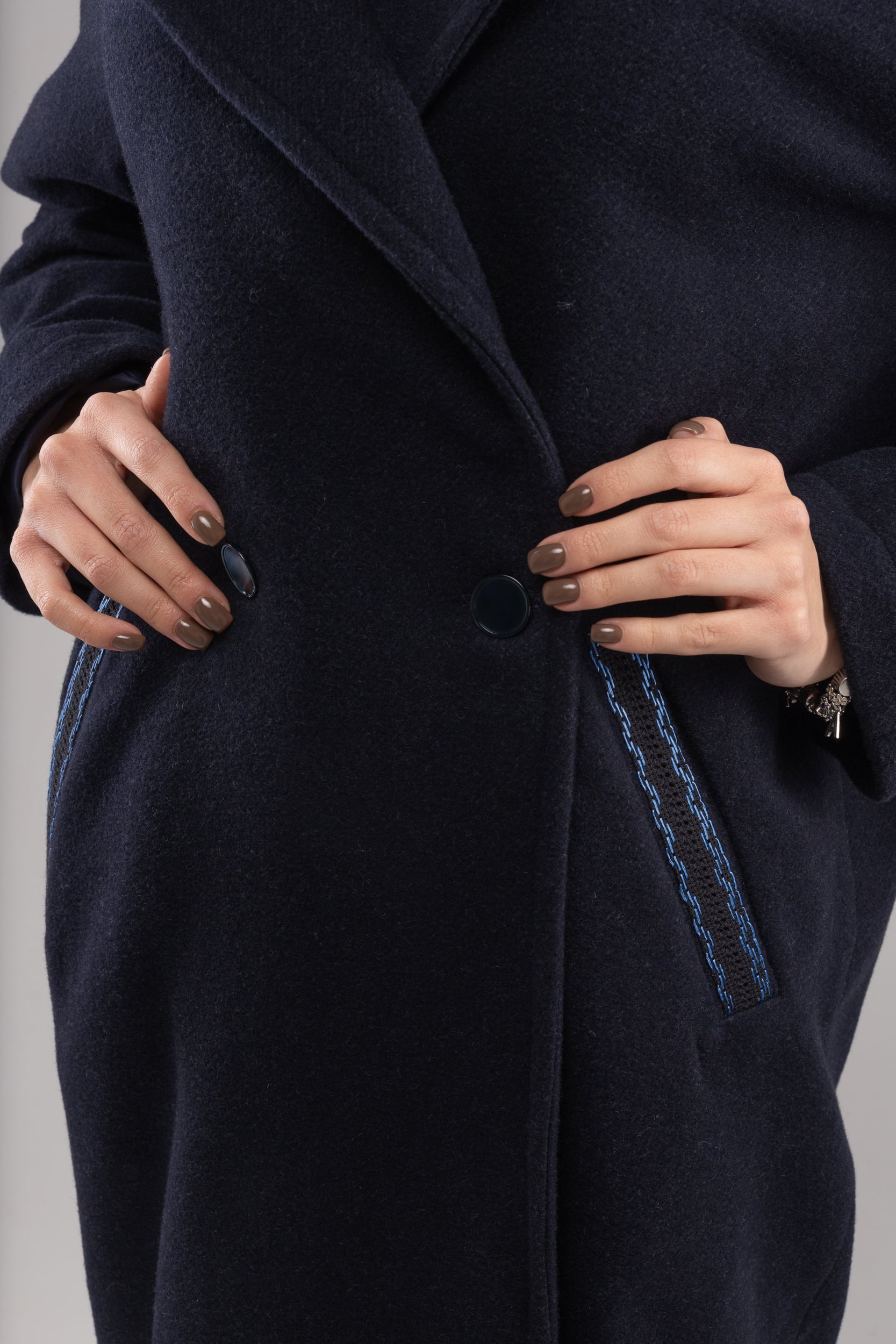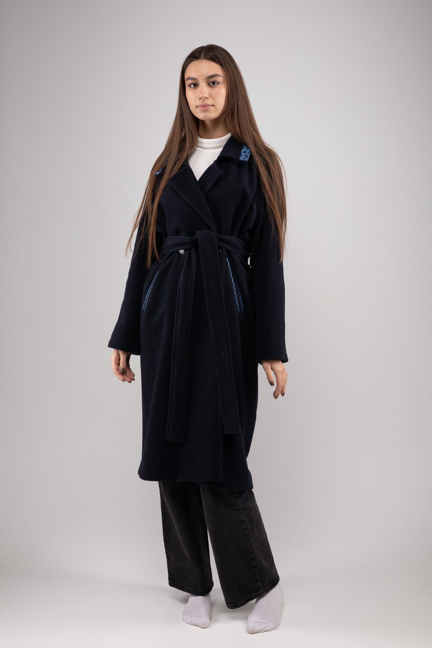 ウクライナ産プレミアムウール100%ロングコート(蒼)平行縫い シルク手刺繍