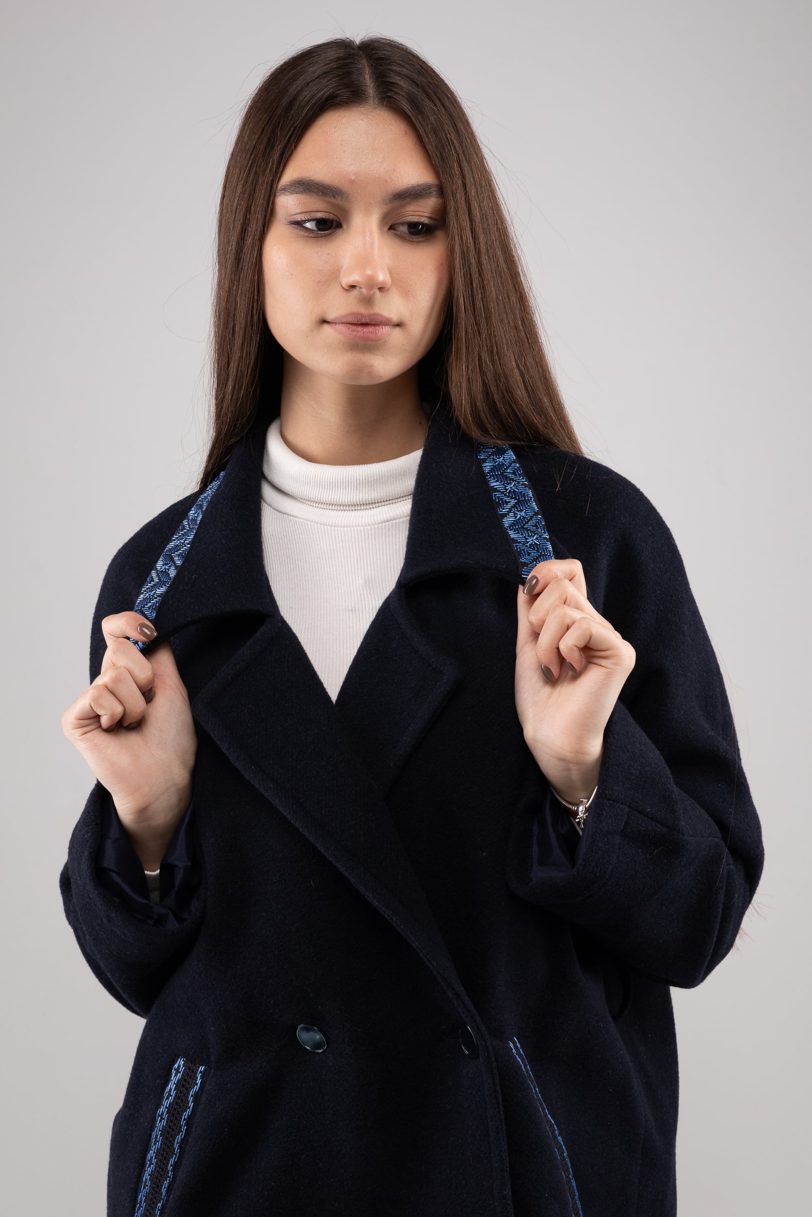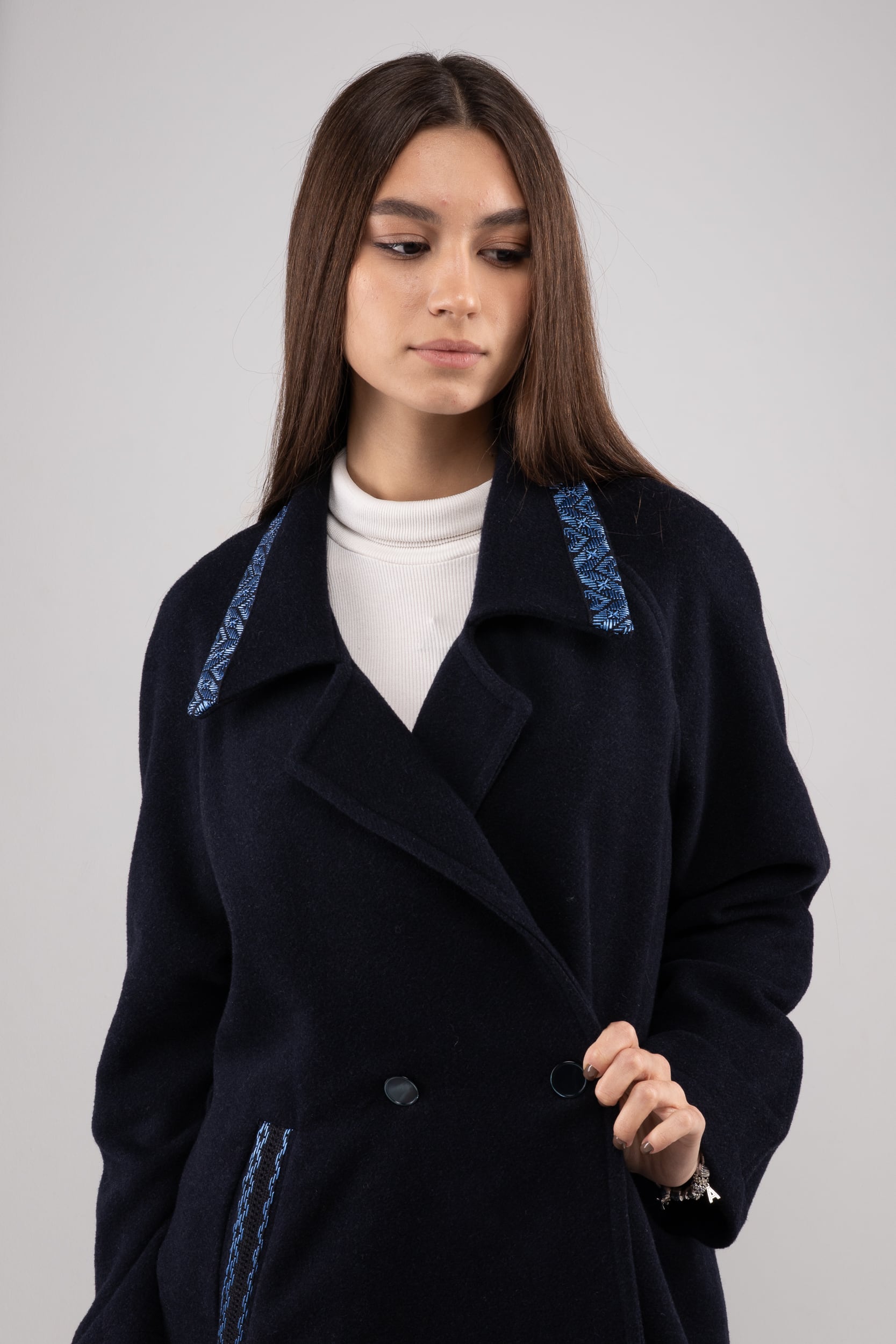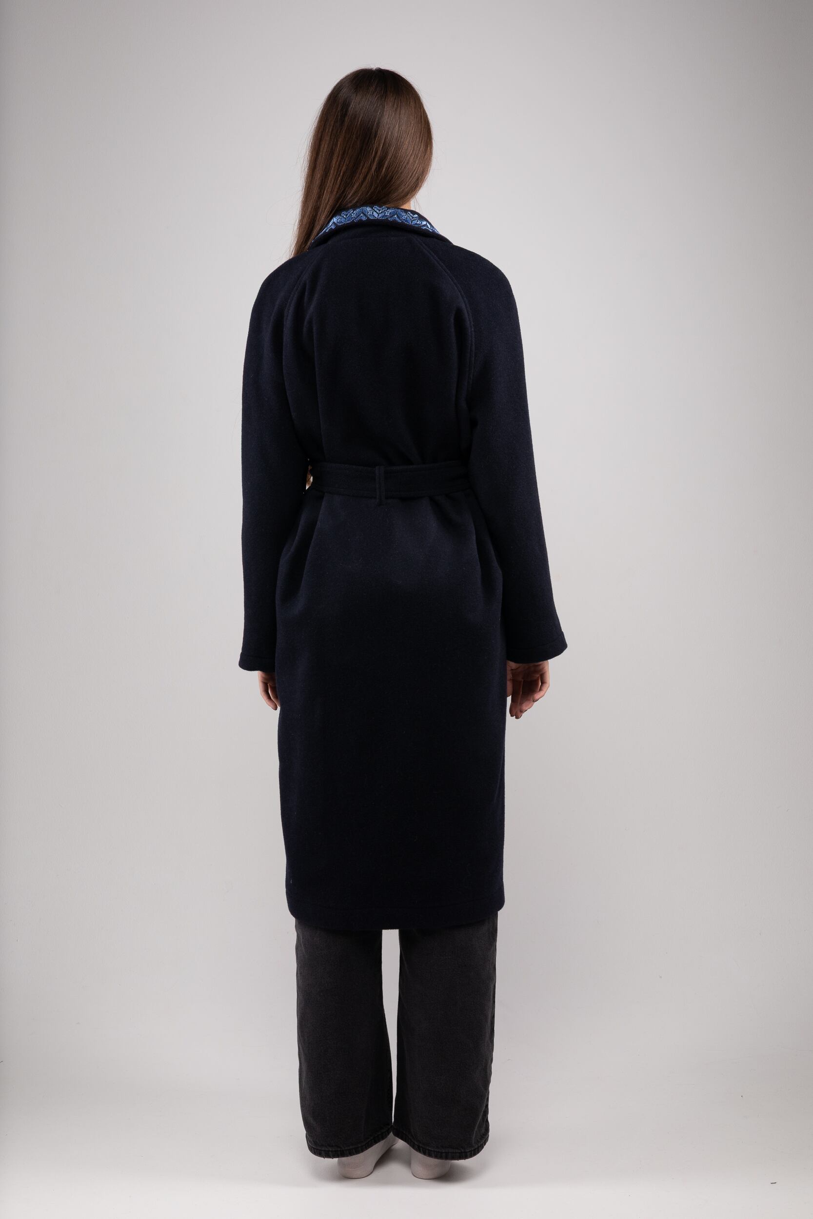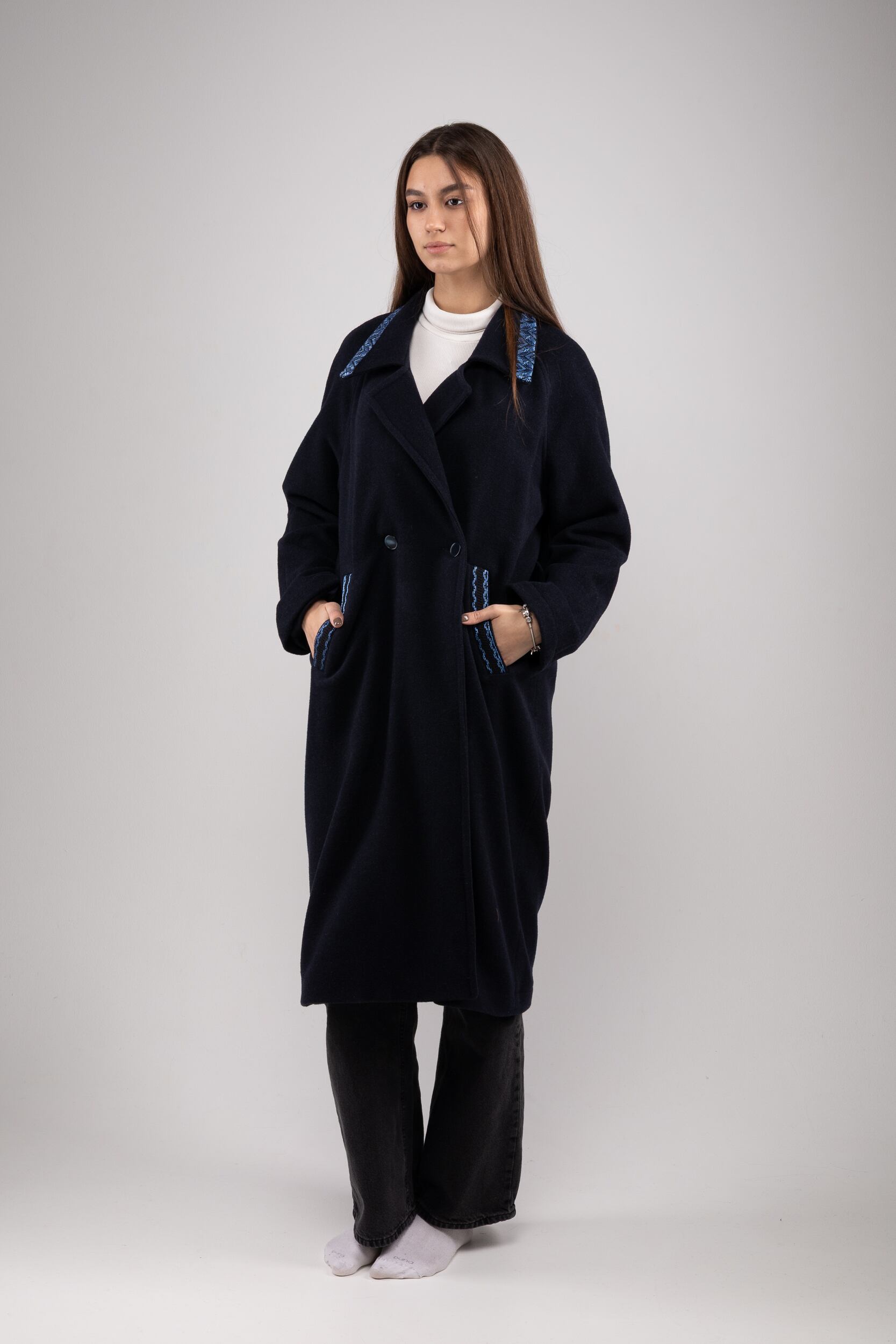 ウクライナ産ウール100%の軽く暖かい最高品質なロングコートです。細部には、ウクライナの伝統的な幾何学な刺繍を全て手作業で施してあります。刺繍はシルク糸を採用し、屋外でより美しく上品な光沢感を放ちます。