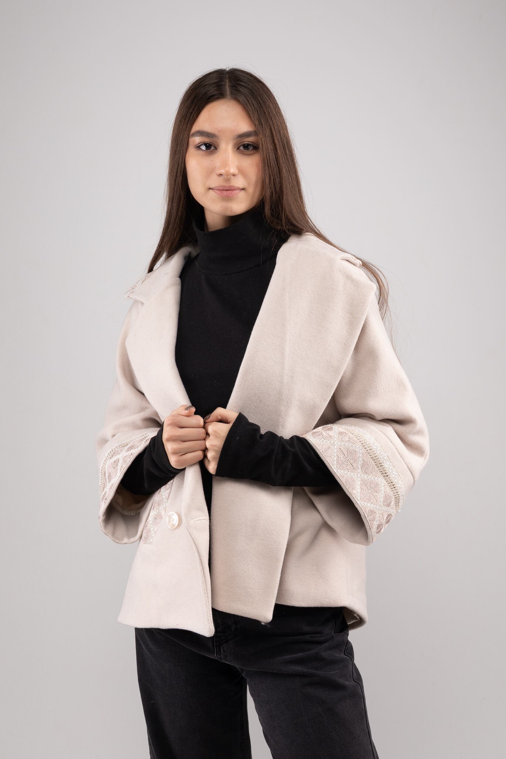 ウクライナ産ウール100%の軽く暖かい最高品質なジャケットコートです。細部には、ウクライナの伝統的な幾何学な刺繍を全て手作業で施してあります。刺繍には、贅沢にシルク糸が採用され、屋外では美しく上品な光沢感を放ちます。