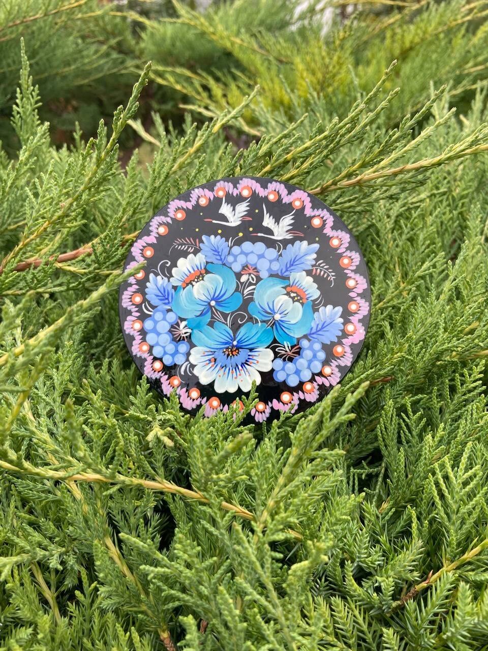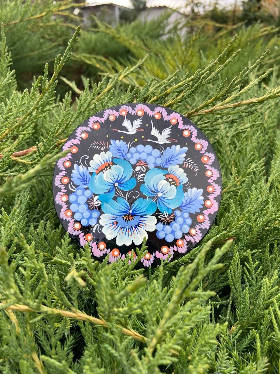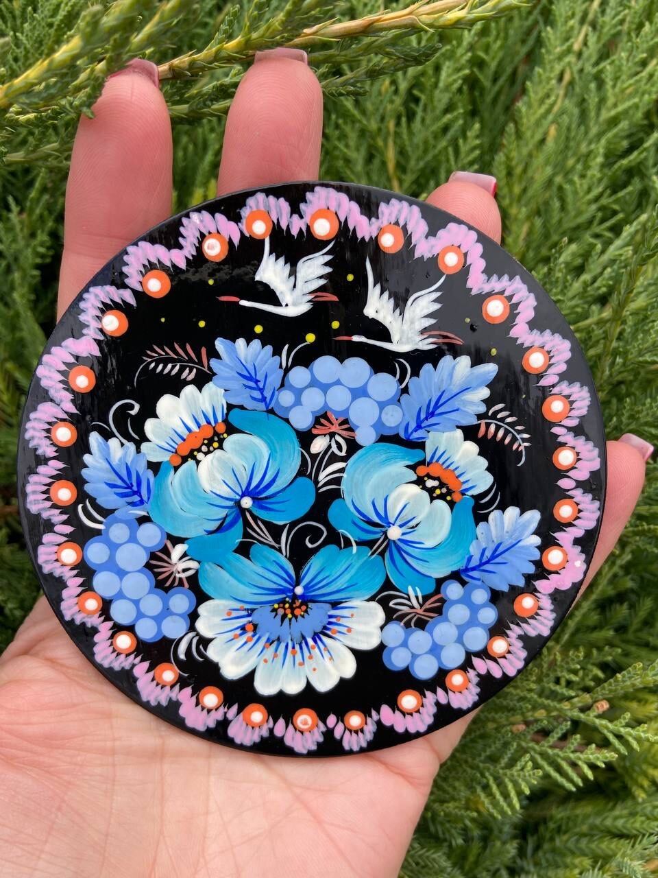 このマグネットは、ウクライナの伝統的なペイント技法「ペトリキフカ塗り」を使用して作られています。ペトリキフカ塗りは、色とりどりの花や模様で知られ、長い歴史を持つウクライナの美術技法の一つです。
