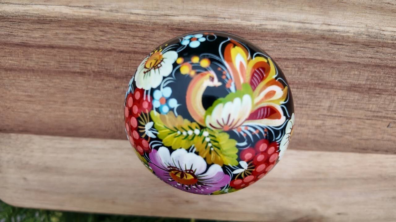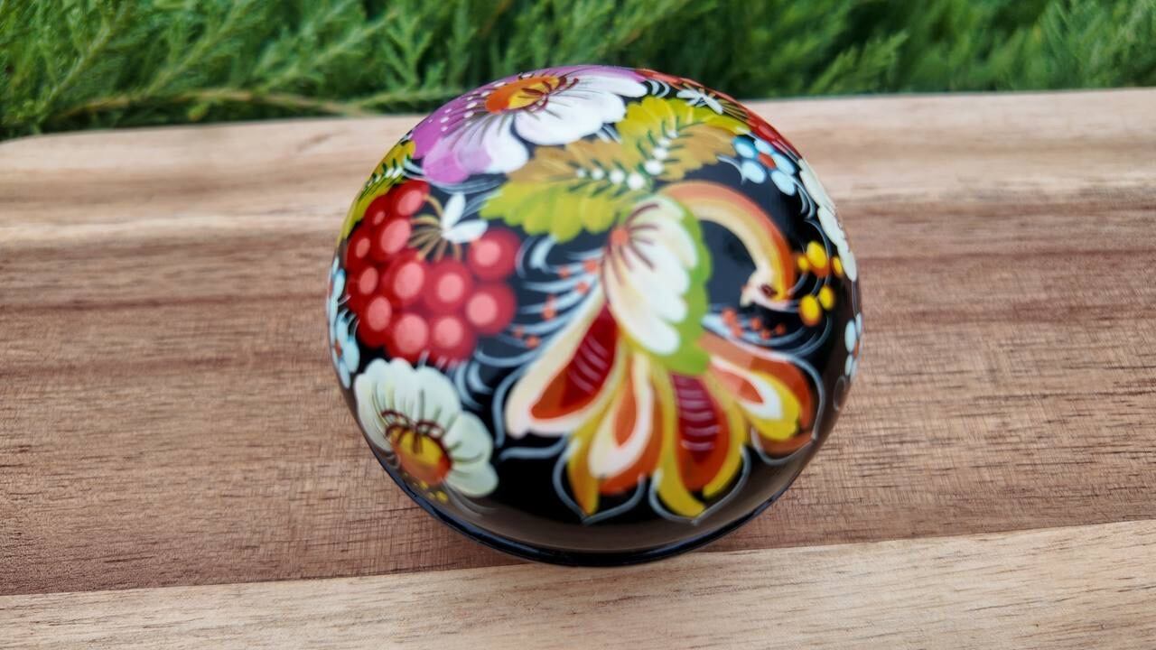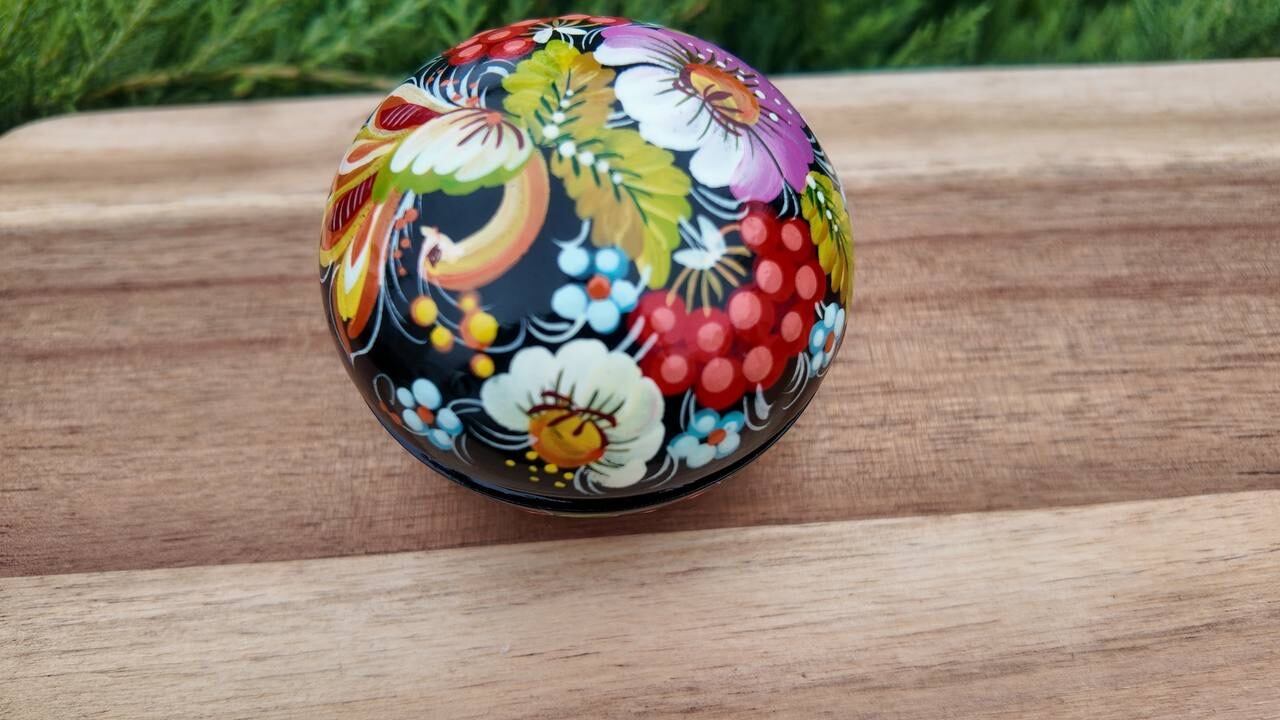 詳細:ペトリキフカ・ジュエリーボックスは、ウクライナ・ドニプロに位置するペトリキフカ村の職人によって手作りされた、小さくて繊細な宝物です。サイズは6×3cmで、小さなジュエリーや大切な小物を収納するのに適したサイズです。