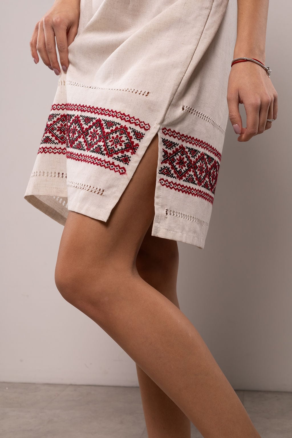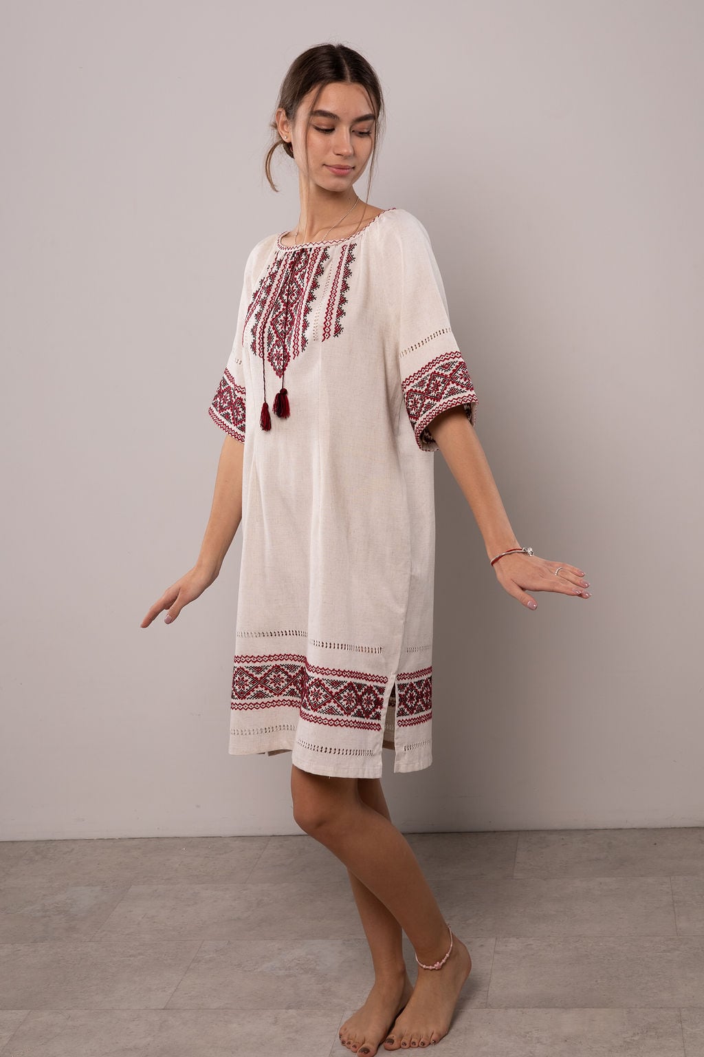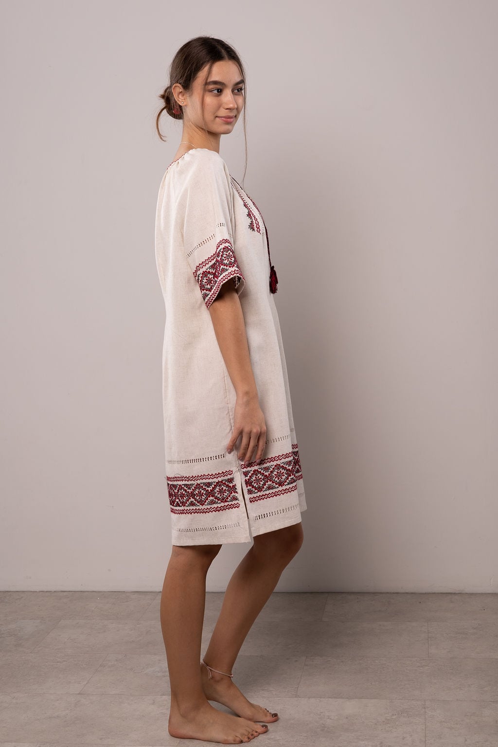 このドレスは、ウクライナの伝統と美しさを象徴するヴィシヴァンカの刺繍を採用しています。過度な派手さを追求せず、日本の日常生活に自然に溶け込むデザインとなっております。しかし、それでいて洗練された高級感とカジュアルな雰囲気を両立させ、見る人を魅了する一着となっています。熟練した刺繍職人が、数ヶ月以上かけ直接手縫いで衣装に縫い付けております。
