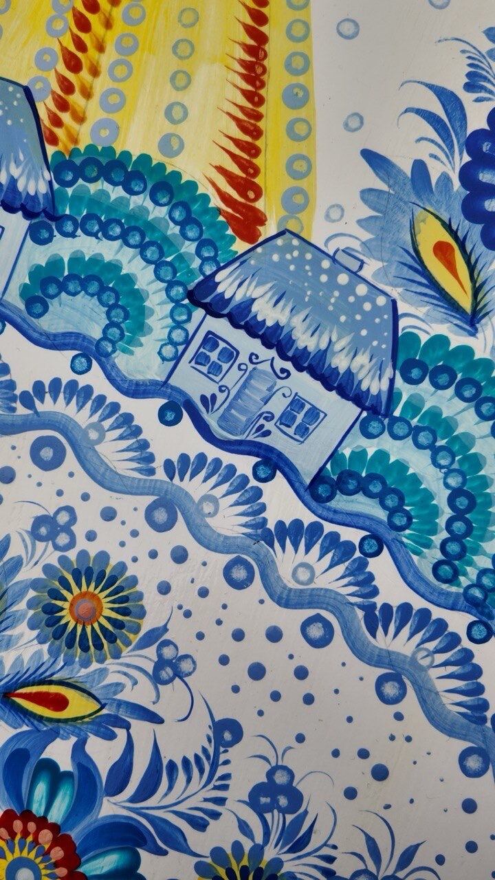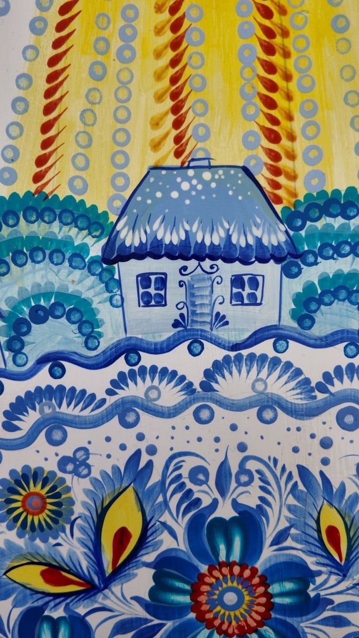 この作品は、ウクライナの伝統的な描画技法「ペトリキフカ塗り」を使用して作られています。ペトリキフカ塗りは、色とりどりの花や模様で知られ、長い歴史を持つウクライナの美術技法の一つです。