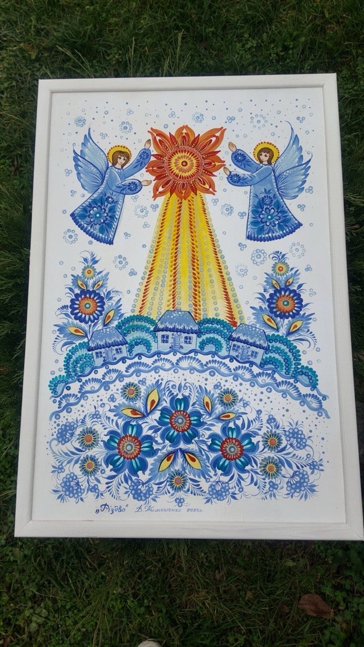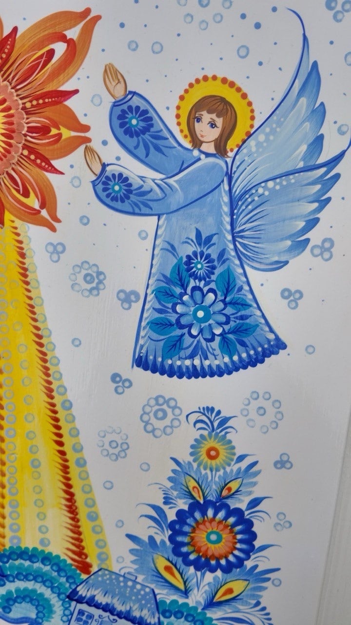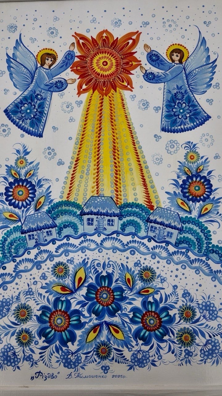 ウクライナのクリスマスから新年にかけての最も伝統的な催しを伝統描画法で美しく、未来へ語り継ぐことを目的にウクライナの国家認定職人であるティモシェンコによって描かれた作品です。