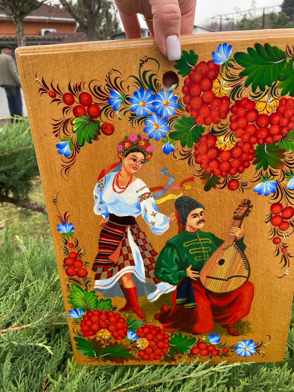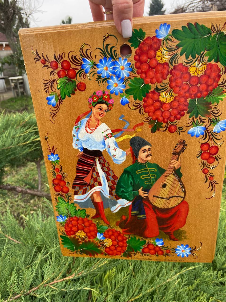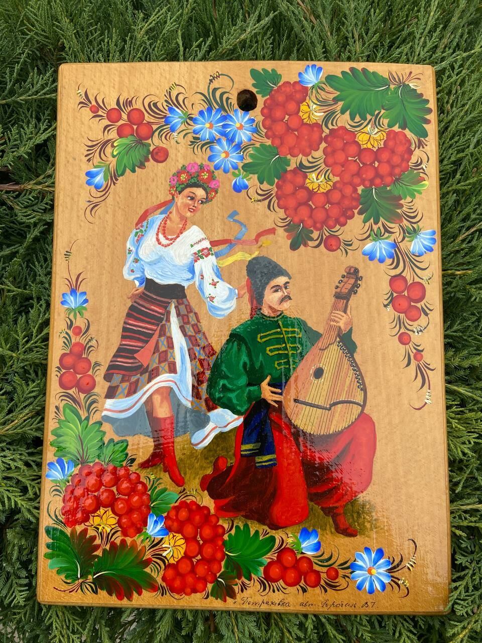 この美しいボードは、ペトリキフカ村のシナノキゾクの樹木から一から手作業で切り彫られ、細部にわたって丁寧に仕上げられています。シナノキの木材は、ウクライナでは御守りとしての意味を持ち、幸運と安全をもたらすと信じられています。