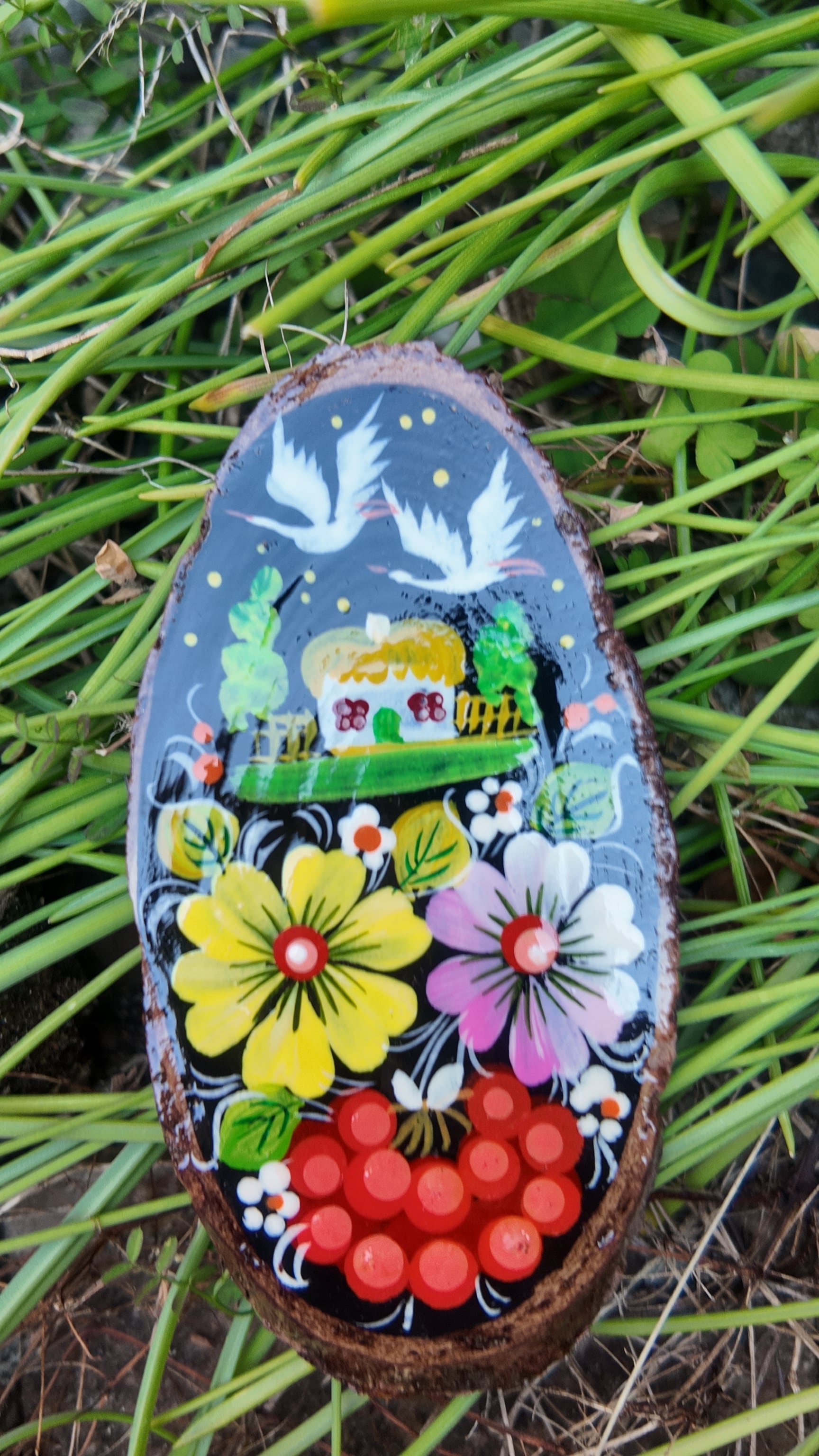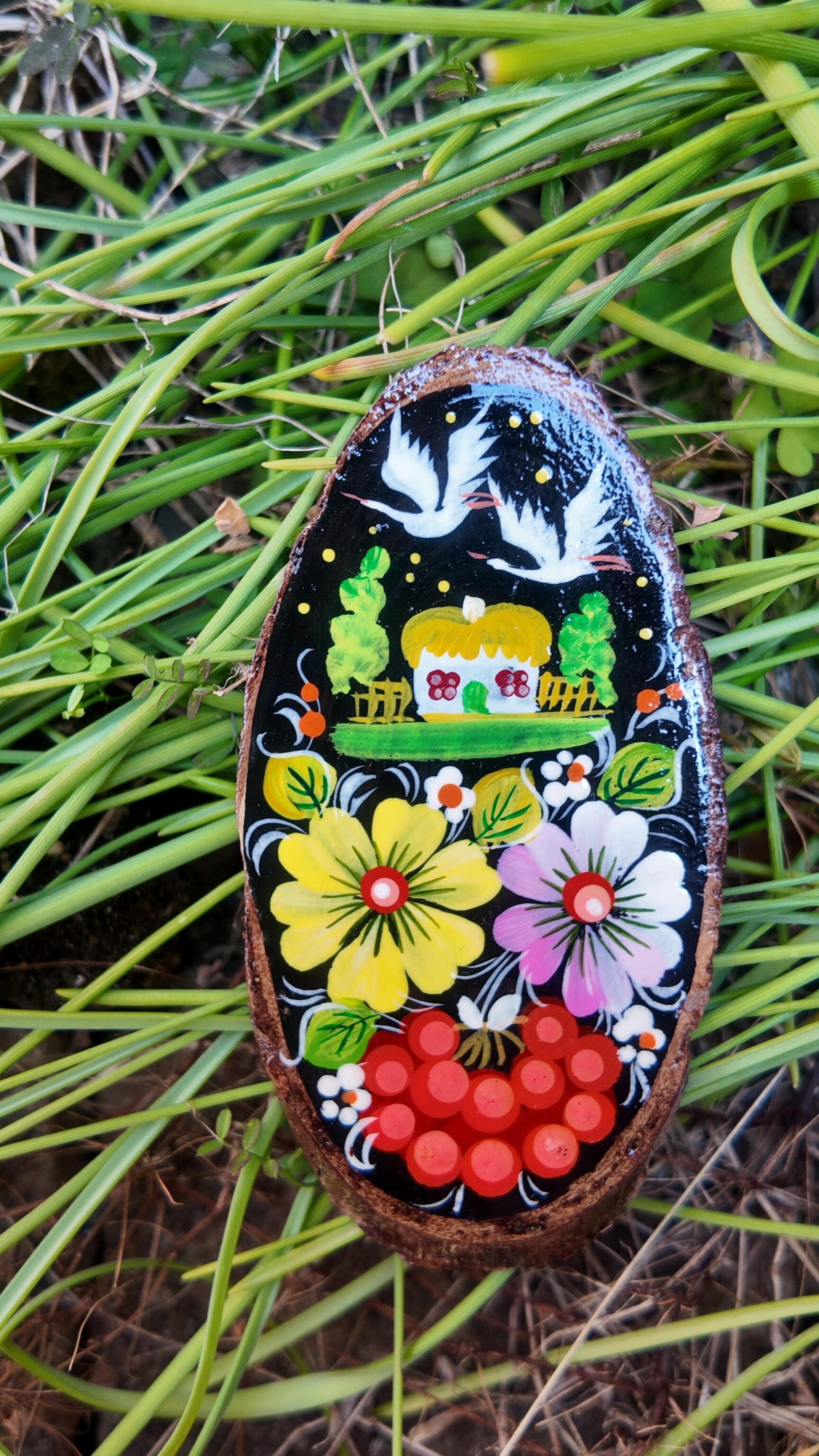 本作品は、ウクライナを代表する伝統絵画技法「ペトリキウカ塗り」によって制作されています。花や植物をモチーフとした優美な文様と、鮮やかで奥行きのある色彩が特徴で、長い歴史の中で受け継がれてきた民俗芸術のひとつです。