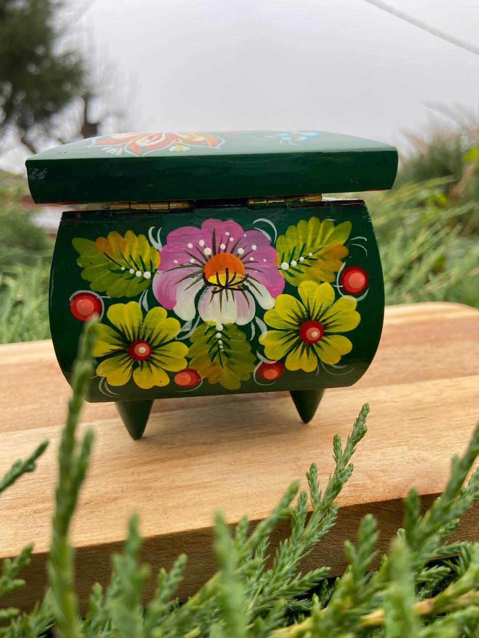 この美しいジュエリーボックスは、ペトリキフカ村のシナノキゾクの樹木から一から手作業で切り彫られ、細部にわたって丁寧に仕上げられています。シナノキの木材は、ウクライナでは御守りとしての意味を持ち、幸運と安全をもたらすと信じられています。