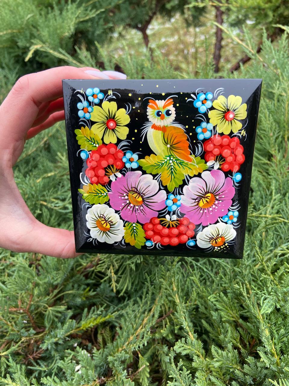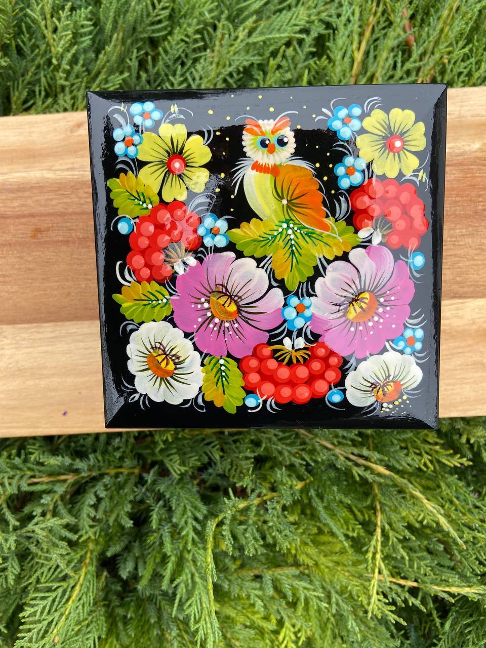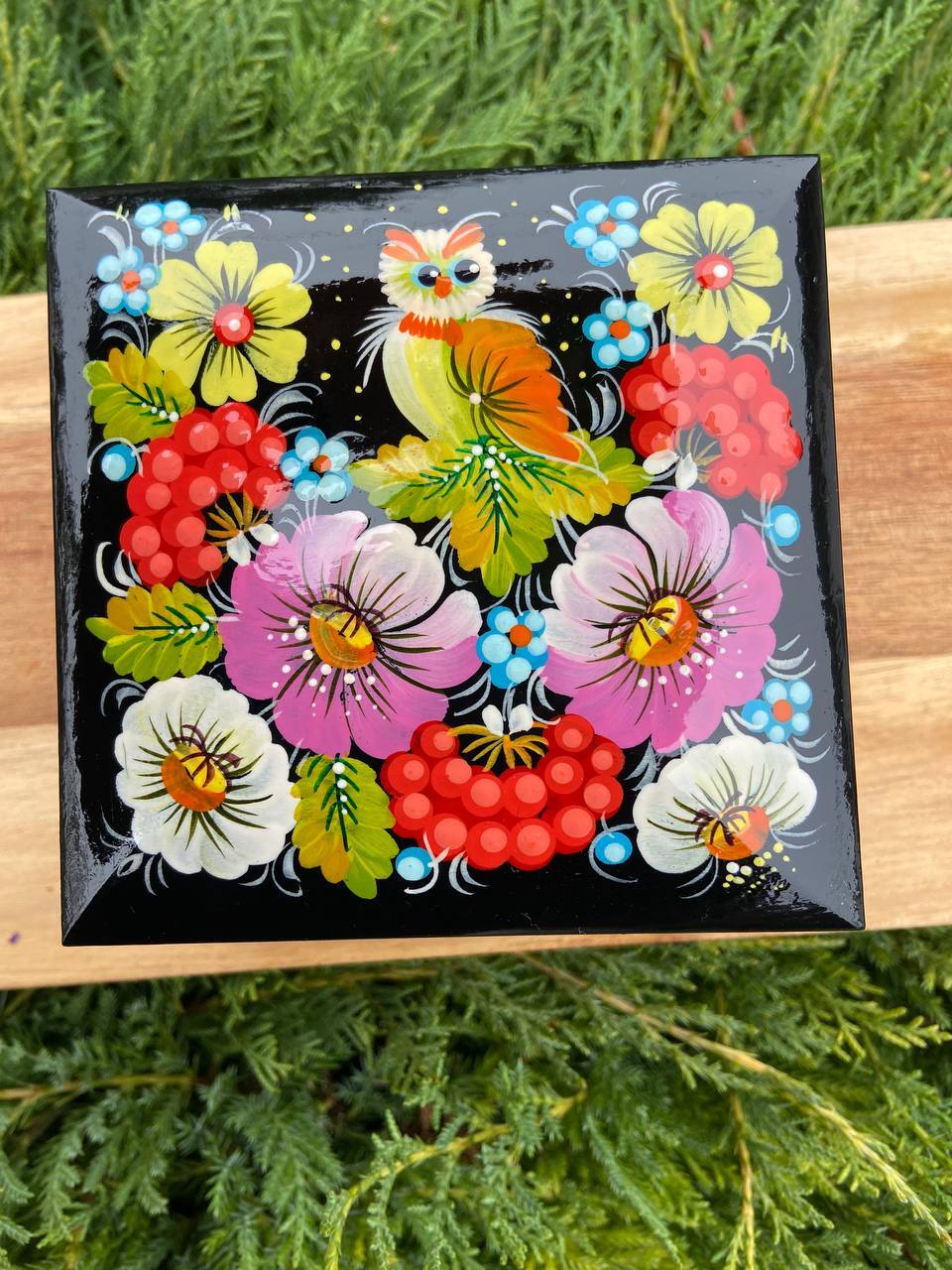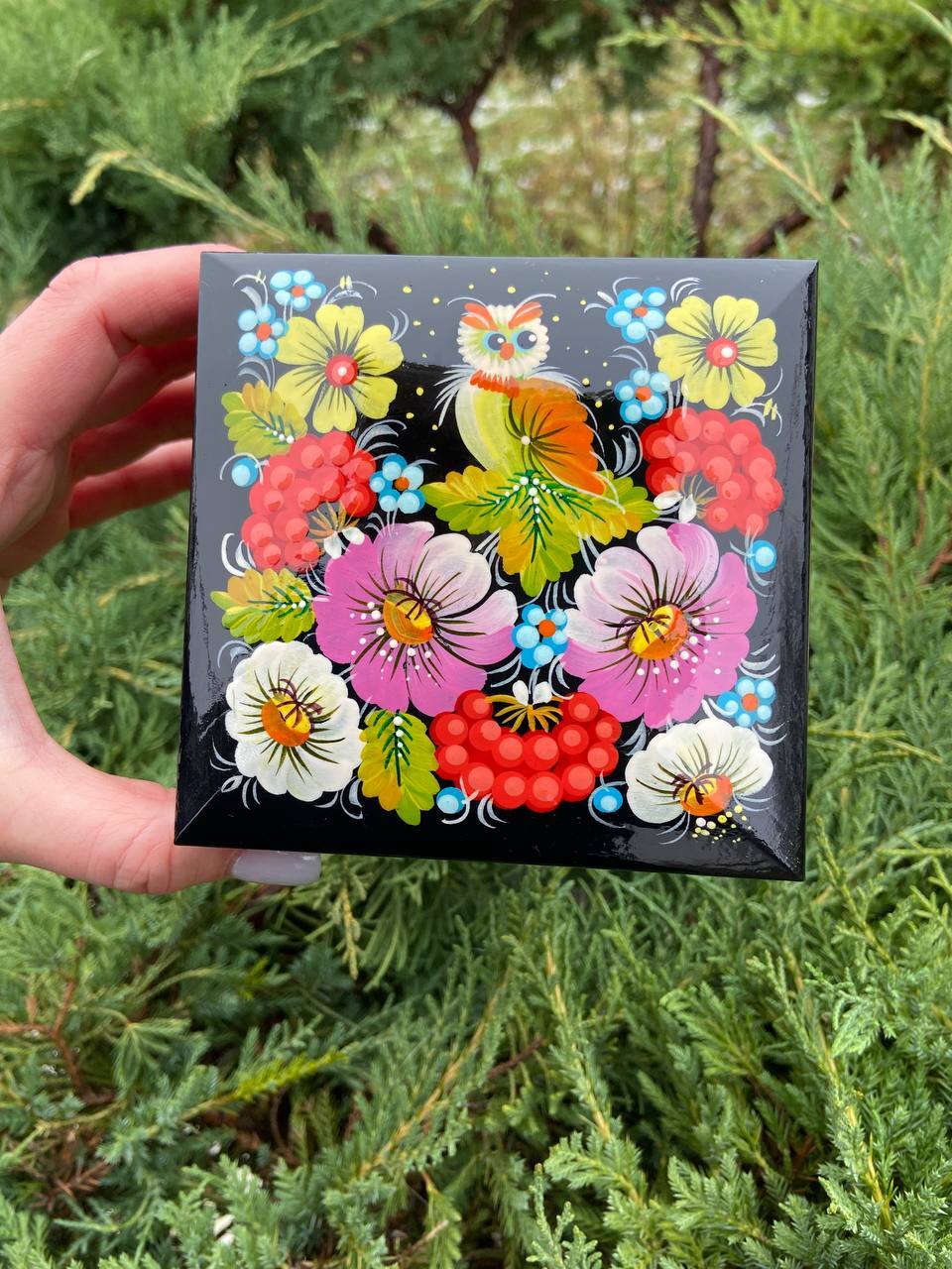 詳細:ペトリキフカ・ジュエリーボックスは、ウクライナの伝統的な芸術、ペトリキフカ塗りの精粋を表現する逸品です。この芸術は、ドニプロ近郊のペトリキフカ村にて代々受け継がれてきたペトリーヴナ家の手によって生み出されています。ホメンコ・ヴァレンティーナ・ペトリーヴナは、その伝統を受け継ぐ現代の名工です。