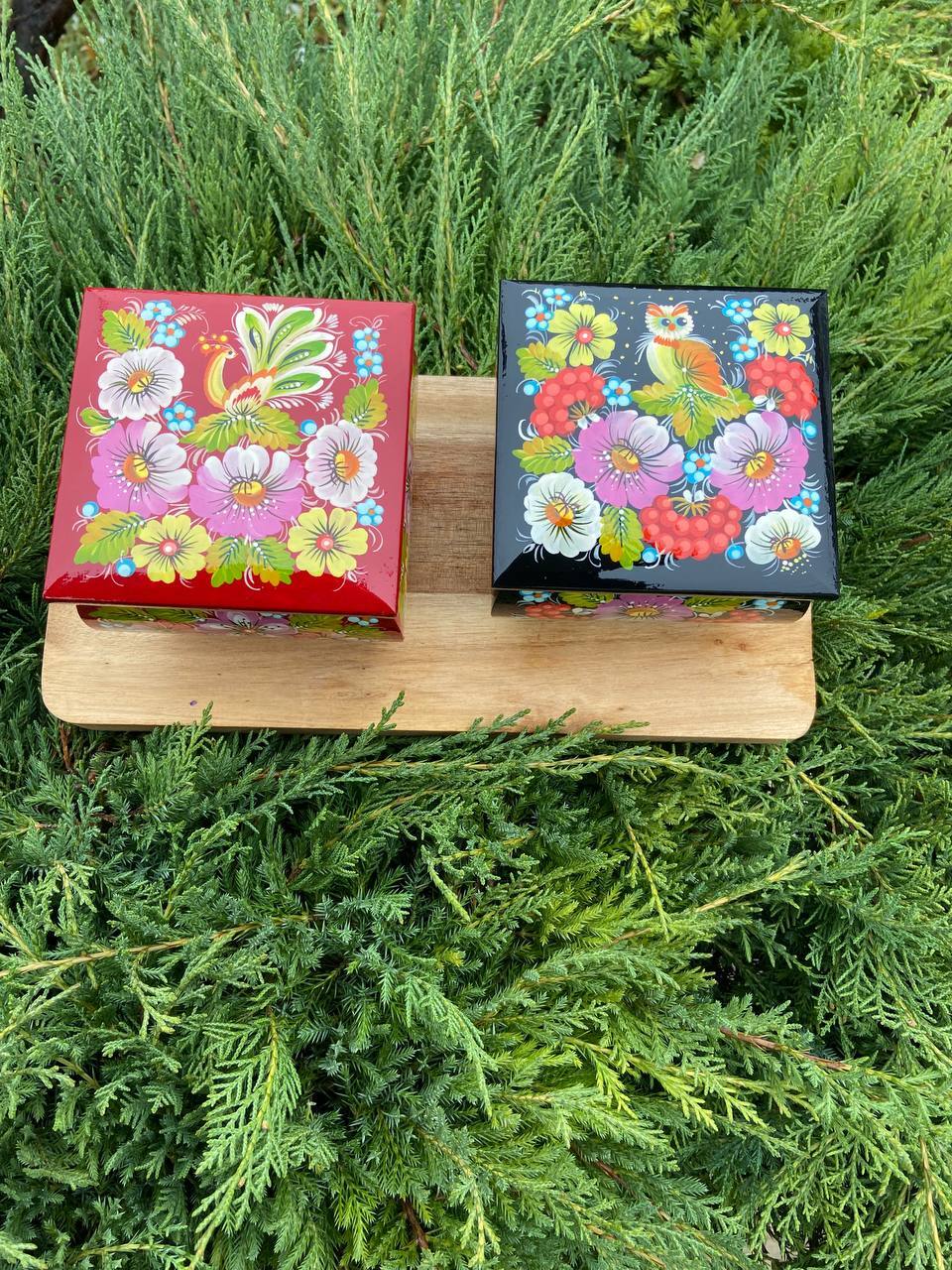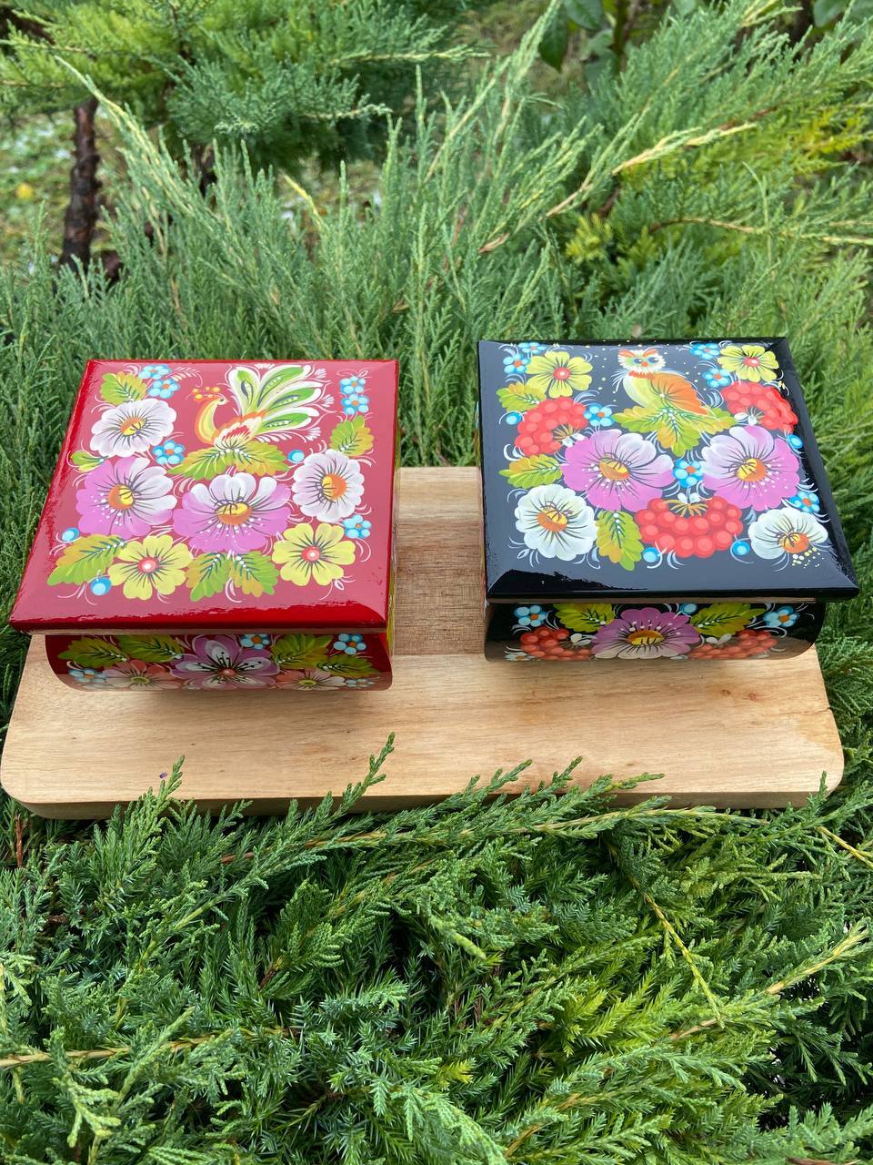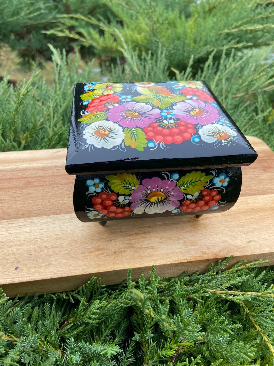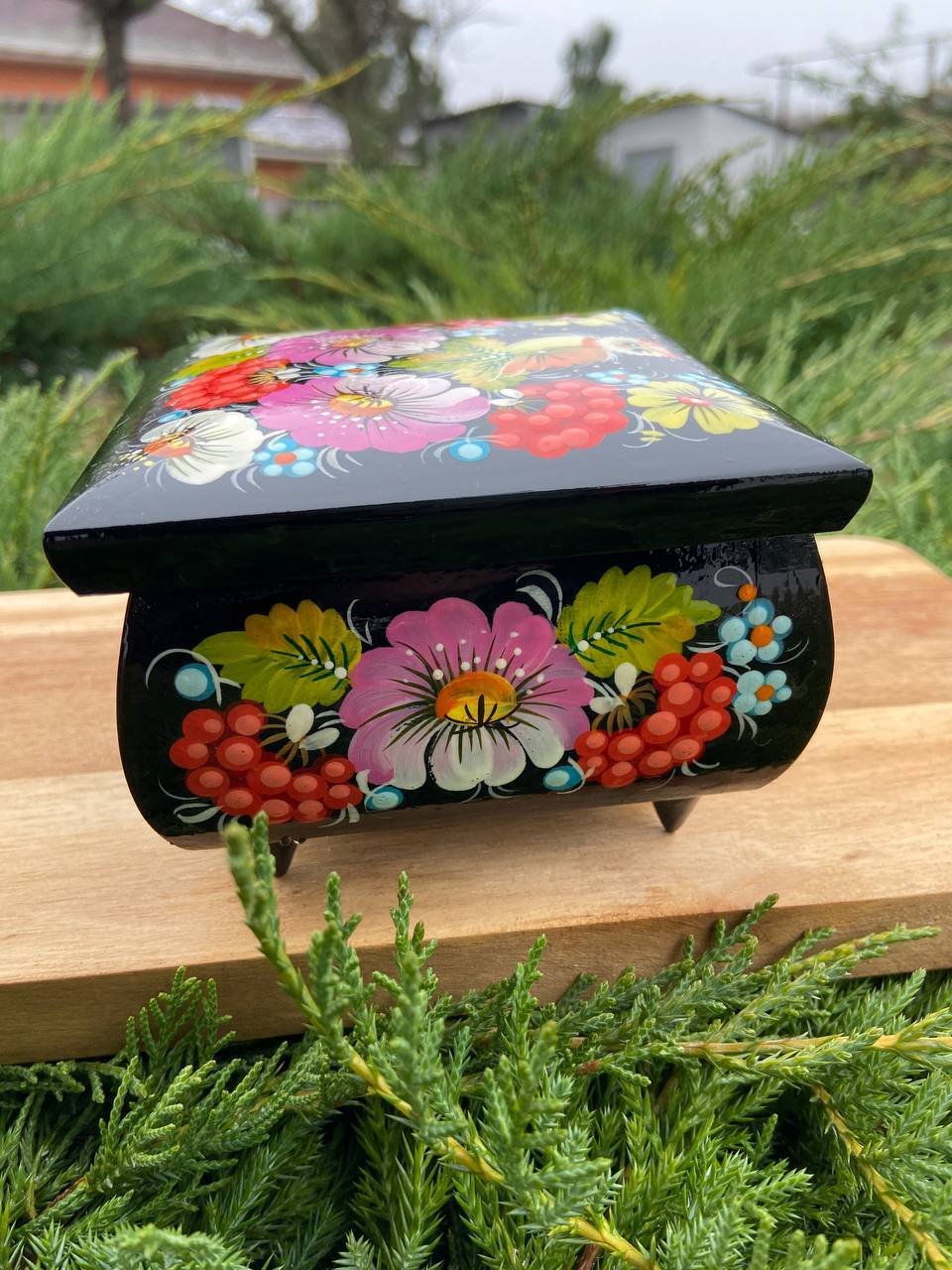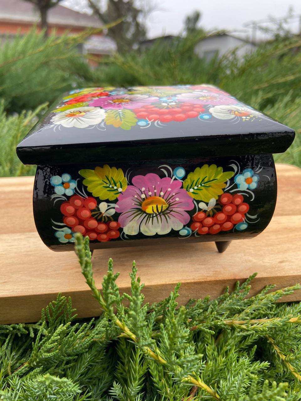 詳細:ペトリキフカ・ジュエリーボックスは、ウクライナの伝統的な芸術、ペトリキフカ塗りの精粋を表現する逸品です。この芸術は、ドニプロ近郊のペトリキフカ村にて代々受け継がれてきたペトリーヴナ家の手によって生み出されています。ホメンコ・ヴァレンティーナ・ペトリーヴナは、その伝統を受け継ぐ現代の名工です。