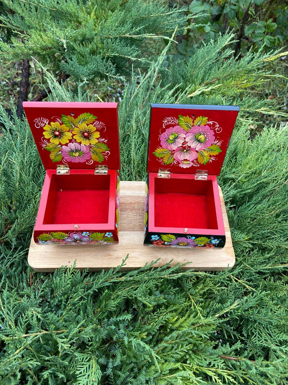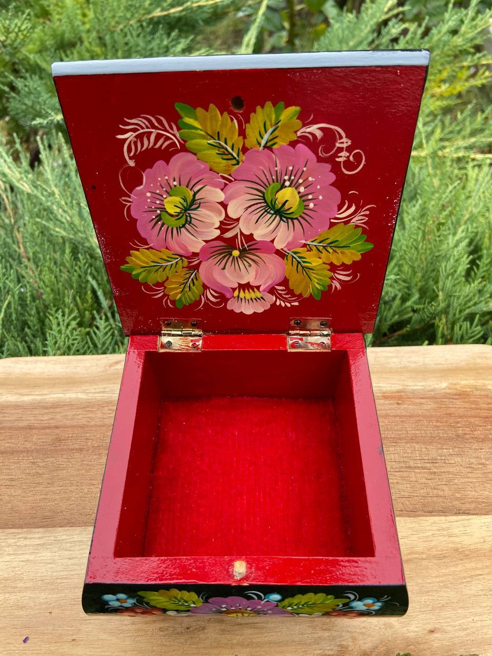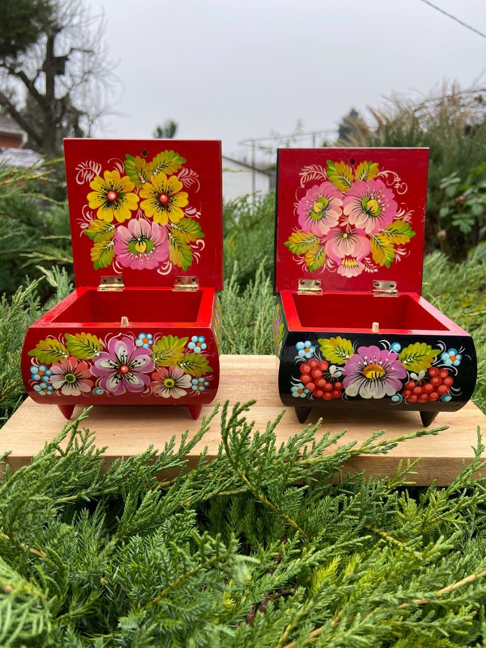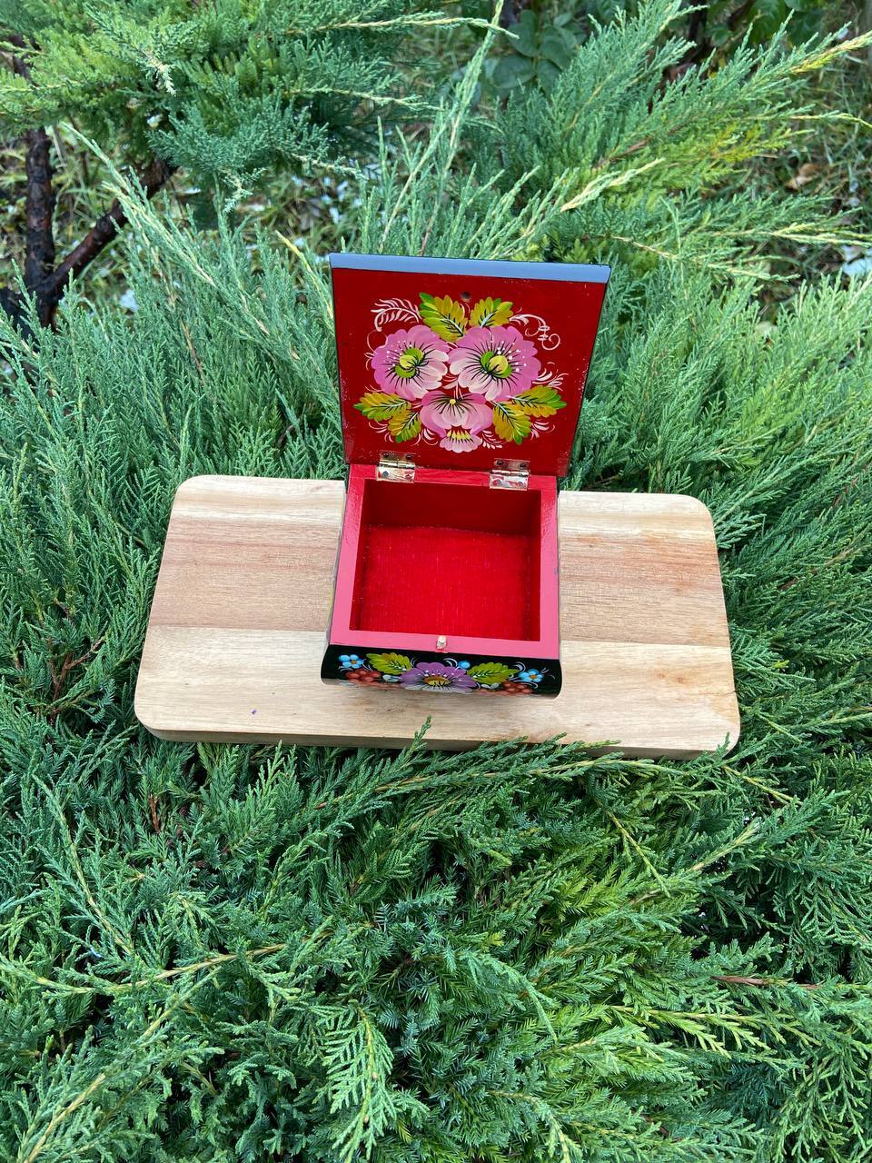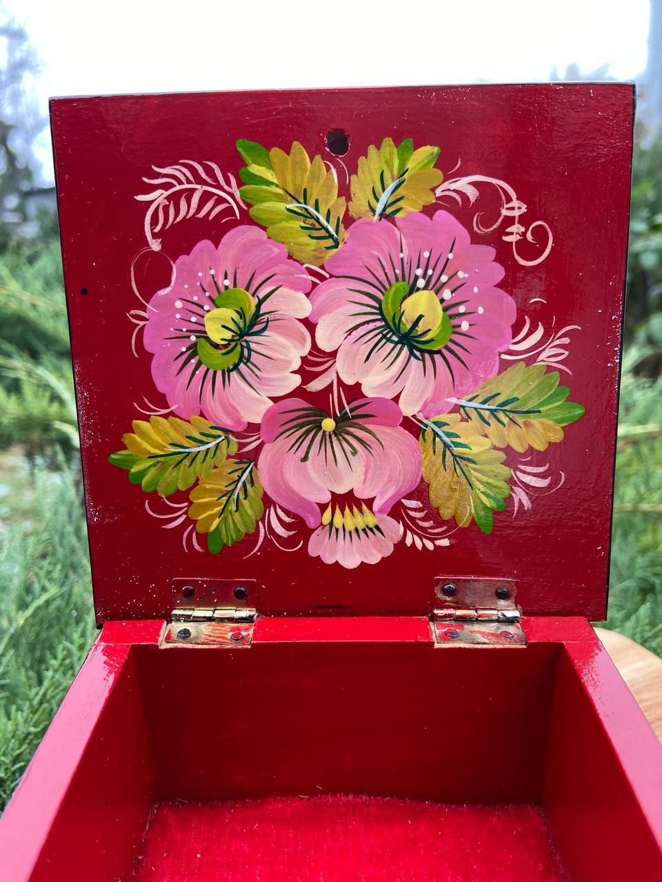 この美しいジュエリーボックスは、ペトリキフカ村のシナノキゾクの樹木から一から手作業で切り彫られ、細部にわたって丁寧に仕上げられています。シナノキの木材は、ウクライナでは御守りとしての意味を持ち、幸運と安全をもたらすと信じられています。