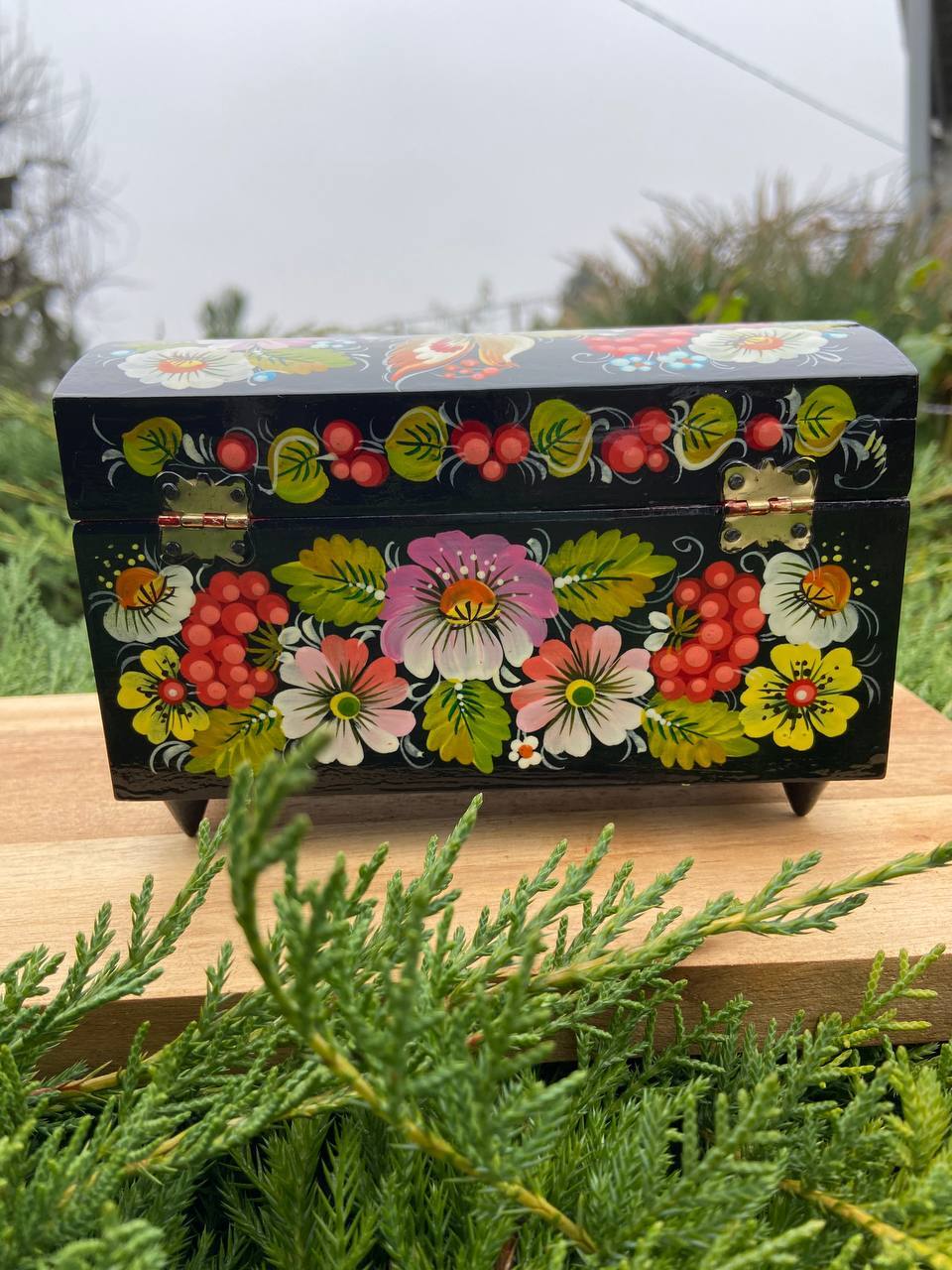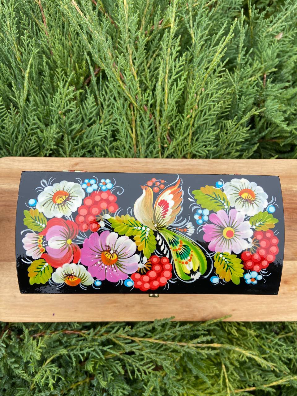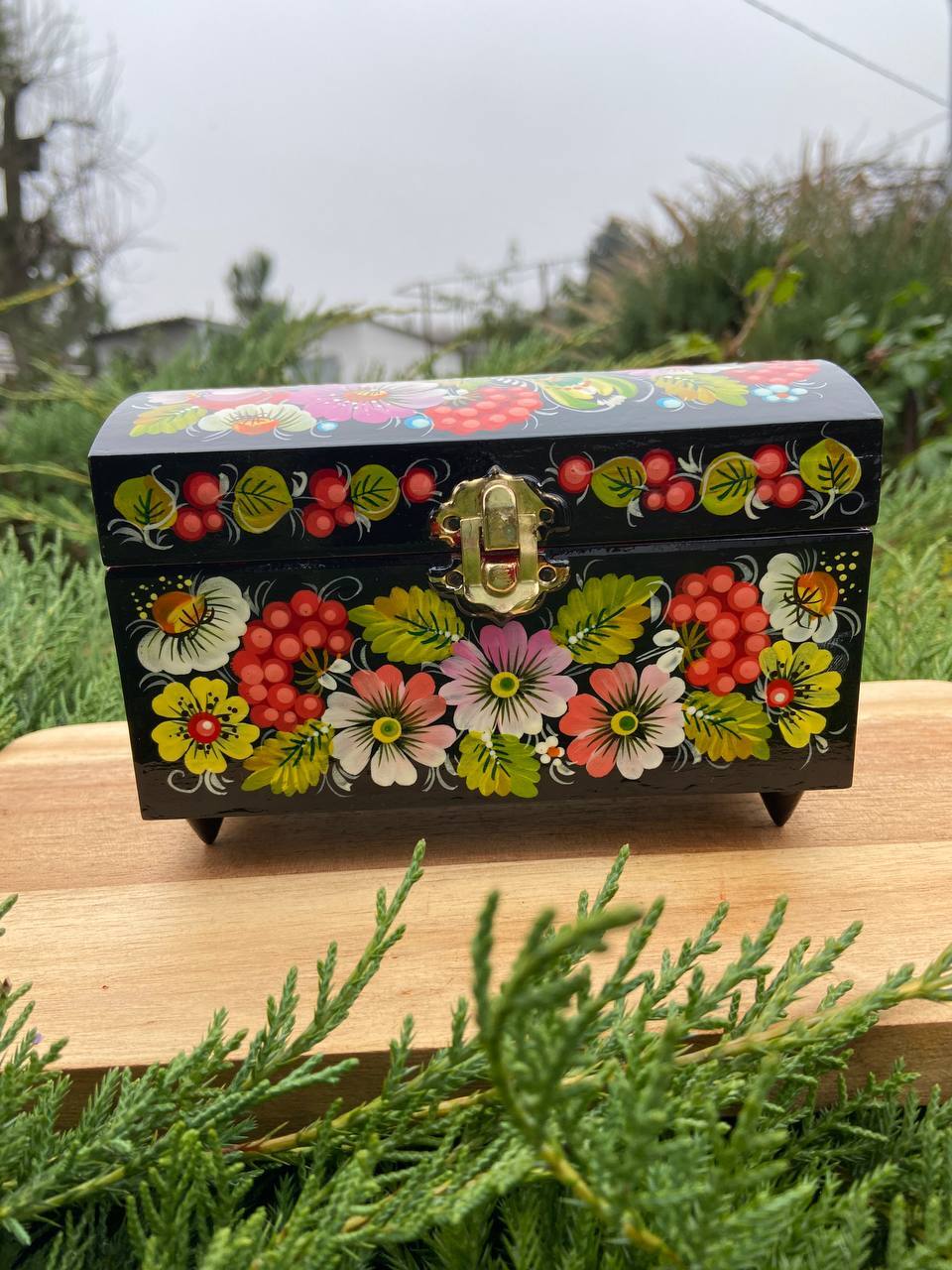 詳細:ペトリキフカ・ジュエリーボックスは、ウクライナの伝統的な芸術、ペトリキフカ塗りの精粋を表現する逸品です。この芸術は、ドニプロ近郊のペトリキフカ村にて代々受け継がれてきたペトリーヴナ家の手によって生み出されています。ホメンコ・ヴァレンティーナ・ペトリーヴナは、その伝統を受け継ぐ現代の名工です。