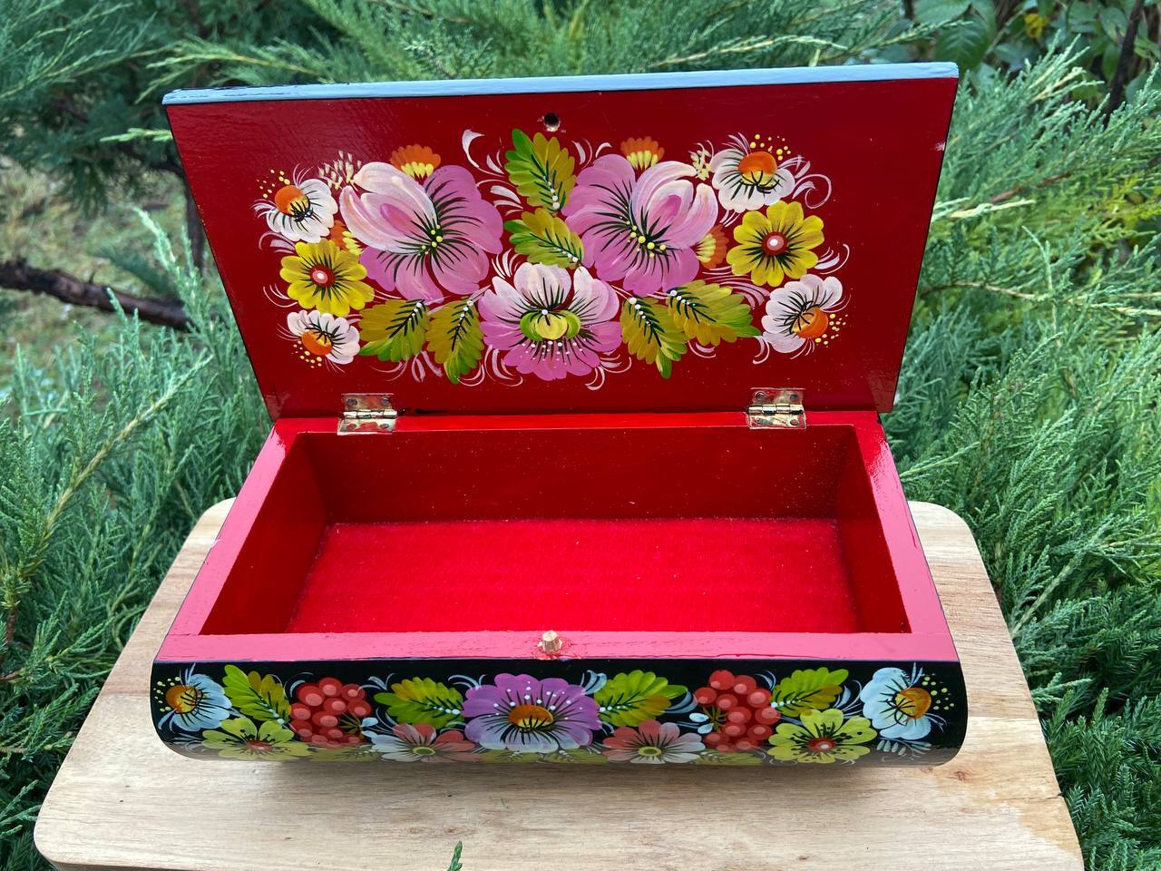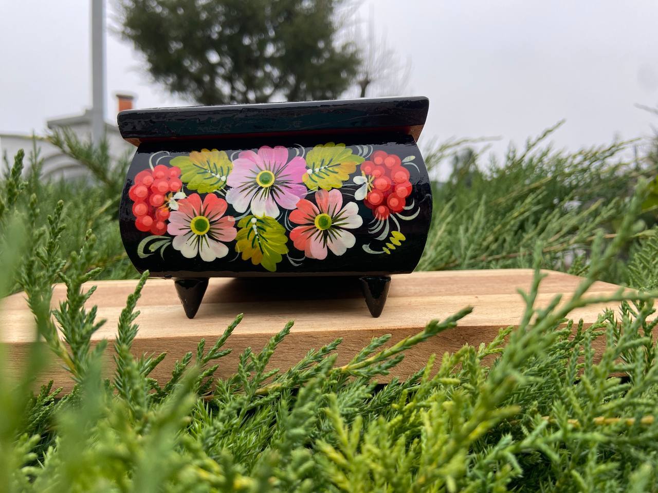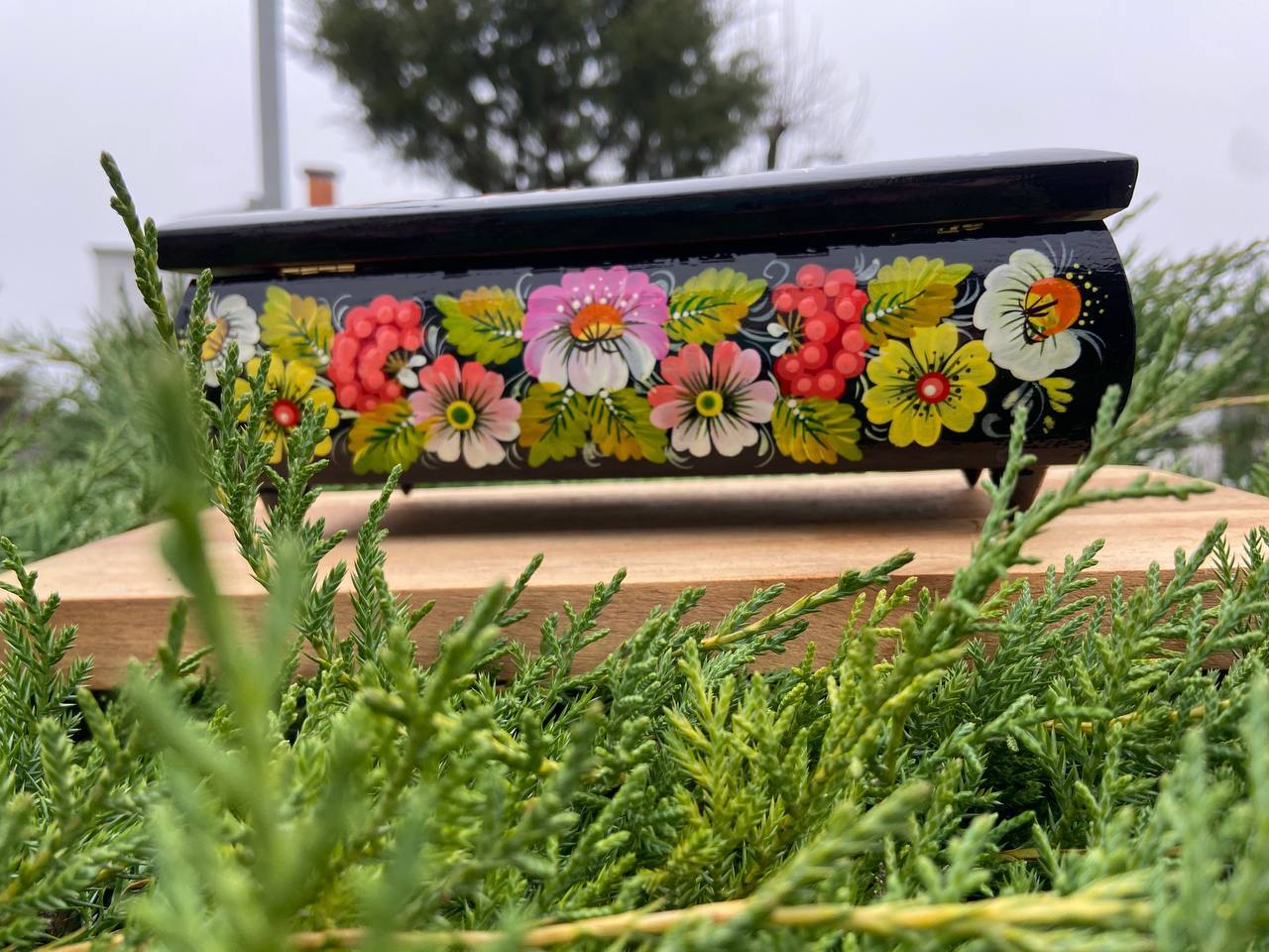 この美しいジュエリーボックスは、ペトリキフカ村のシナノキゾクの樹木から一から手作業で切り彫られ、細部にわたって丁寧に仕上げられています。シナノキの木材は、ウクライナでは御守りとしての意味を持ち、幸運と安全をもたらすと信じられています。