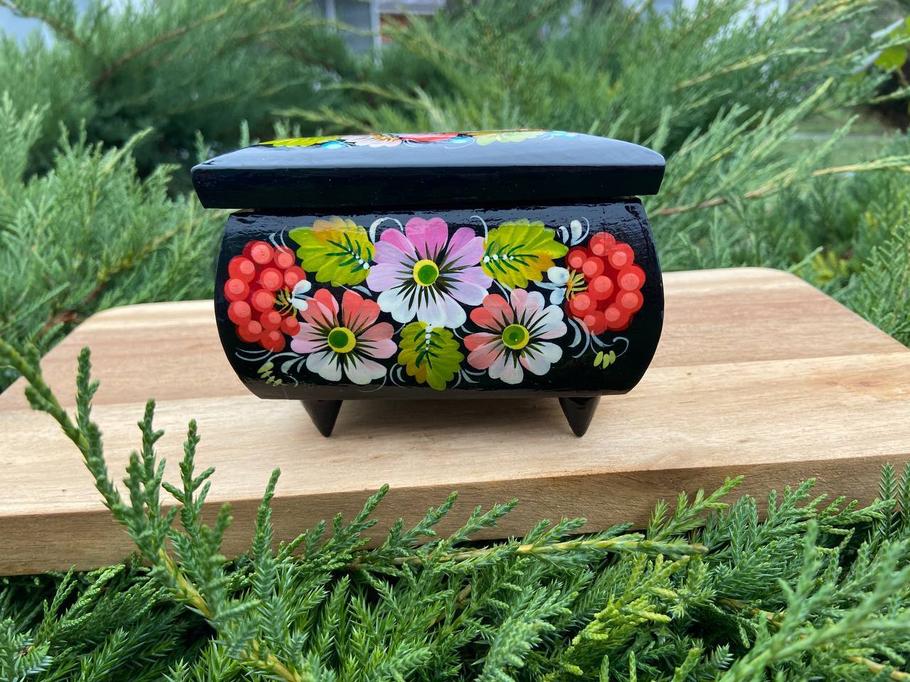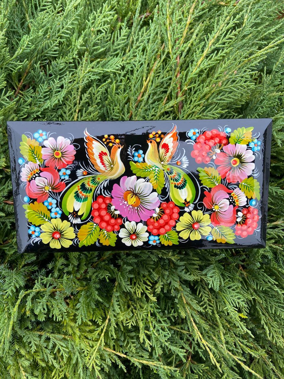 詳細:ペトリキフカ・ジュエリーボックスは、ウクライナの伝統的な芸術、ペトリキフカ塗りの精粋を表現する逸品です。この芸術は、ドニプロ近郊のペトリキフカ村にて代々受け継がれてきたペトリーヴナ家の手によって生み出されています。ホメンコ・ヴァレンティーナ・ペトリーヴナは、その伝統を受け継ぐ現代の名工です。
