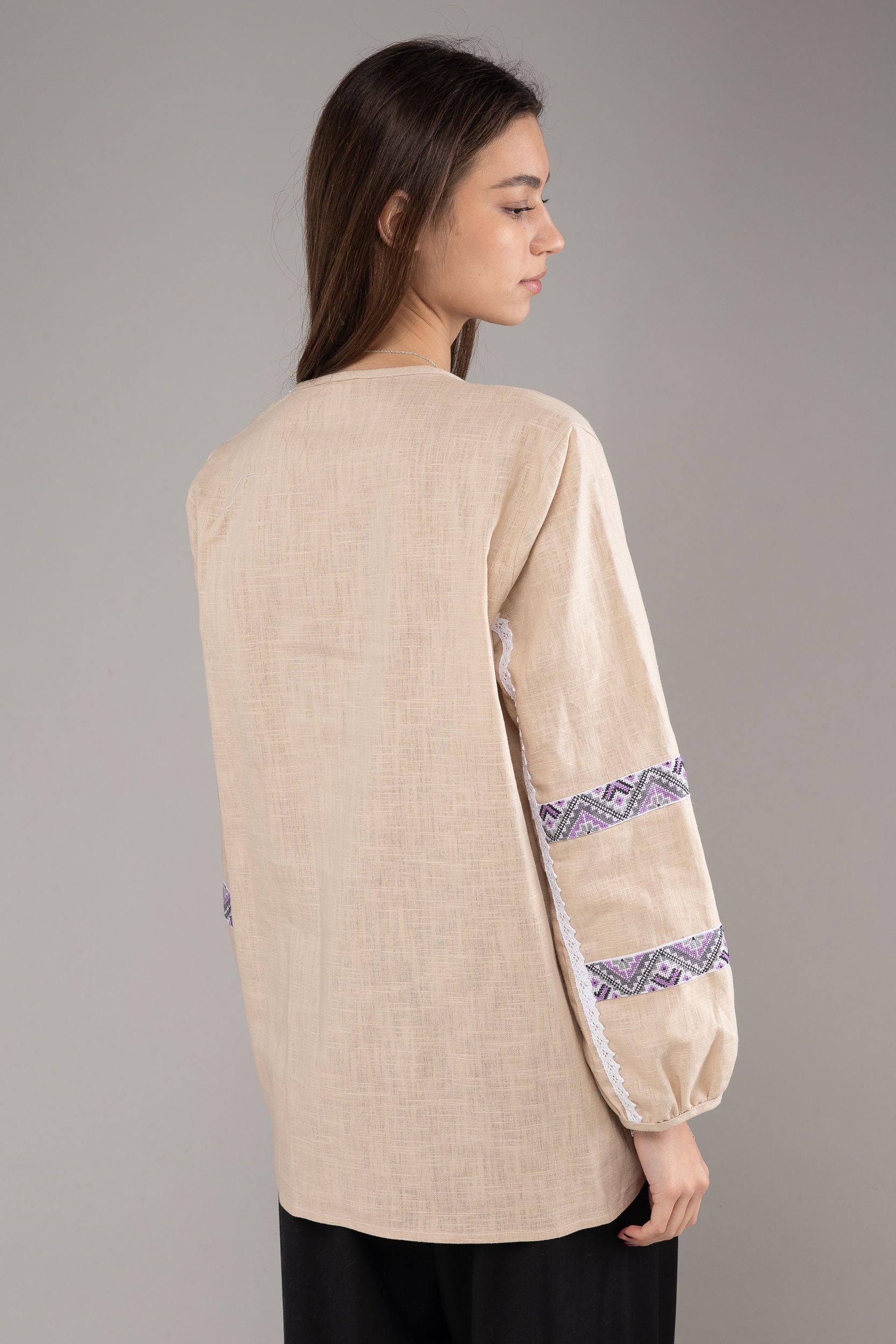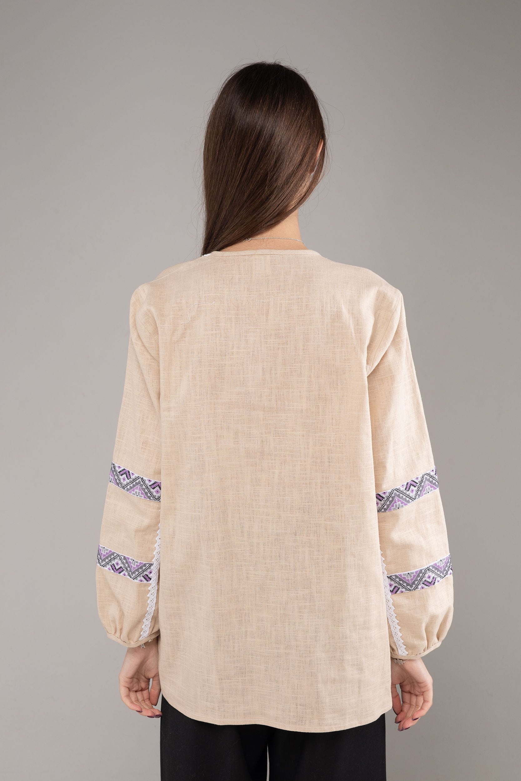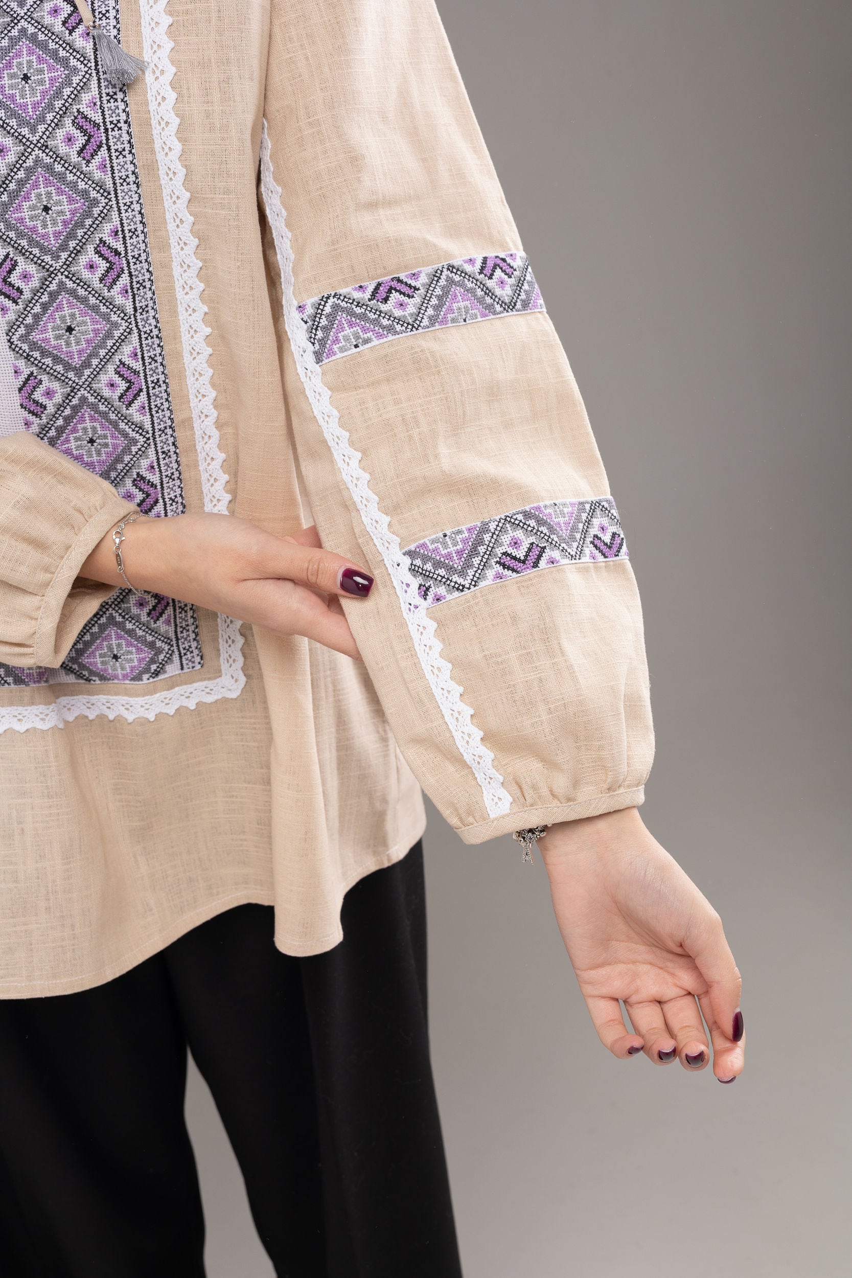 この作品は、ウクライナの伝統と美しさを象徴するヴィシヴァンカの刺繍を採用しています。過度な派手さを追求せず、日本の日常生活に自然に溶け込むデザインとなっております。しかし、それでいて洗練された高級感とカジュアルな雰囲気を両立させ、見る人を魅了する一着となっています。